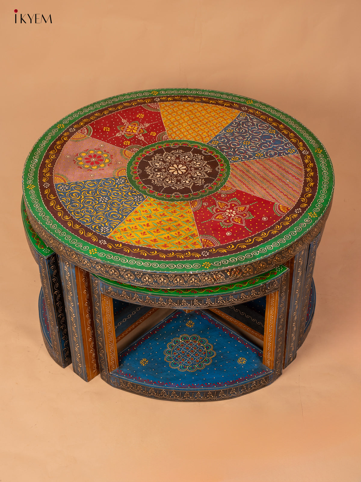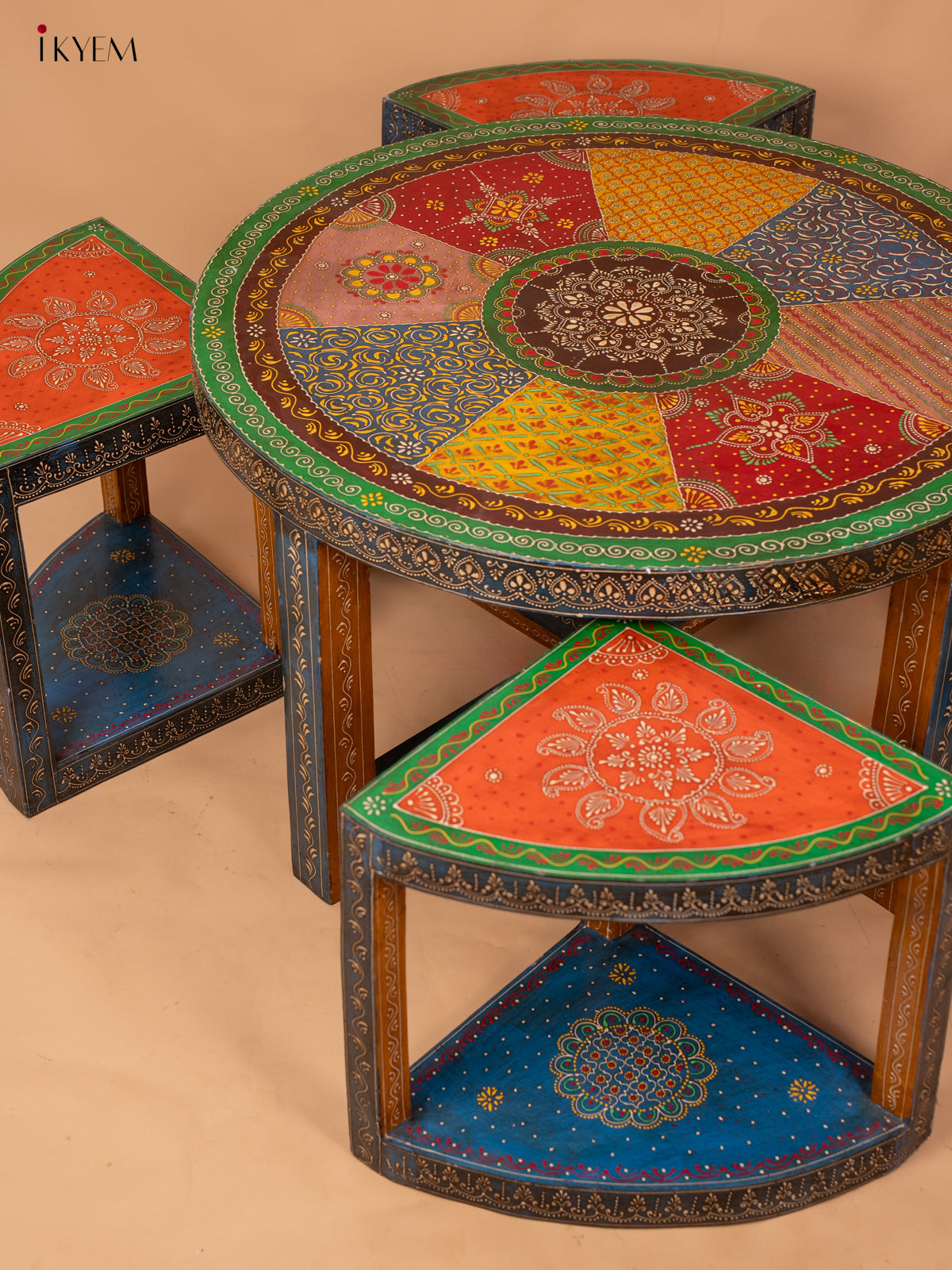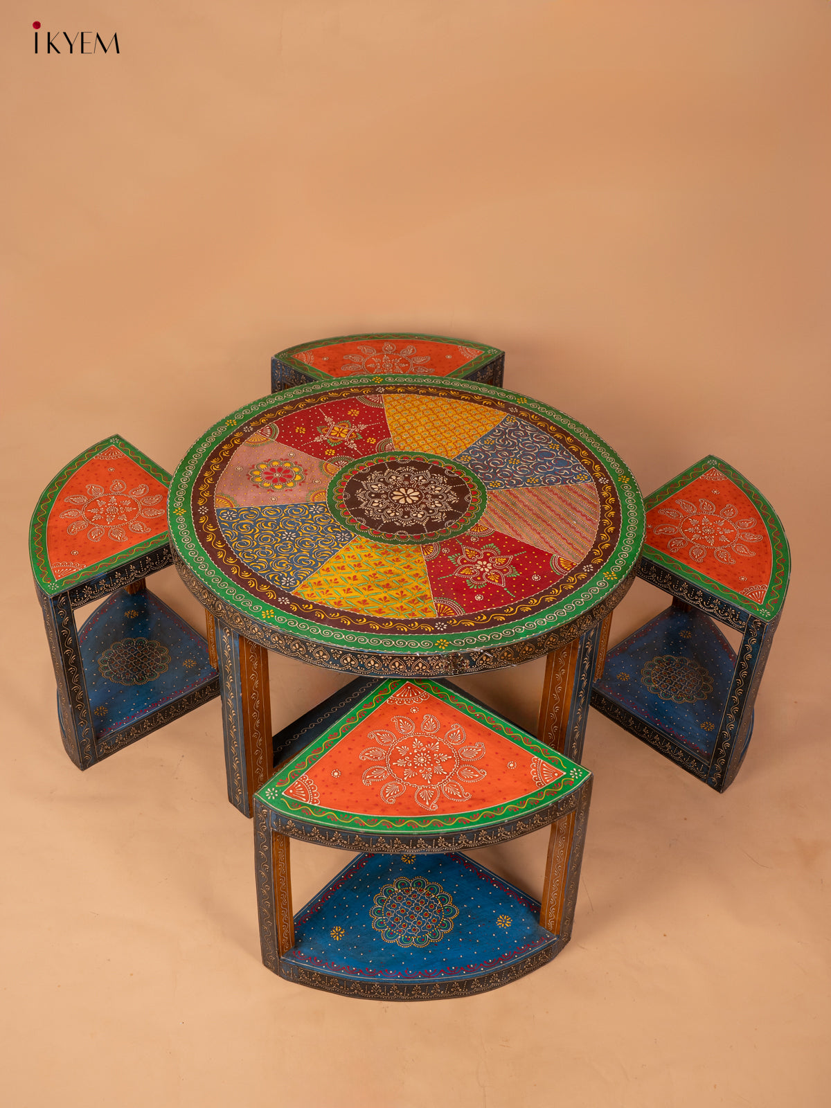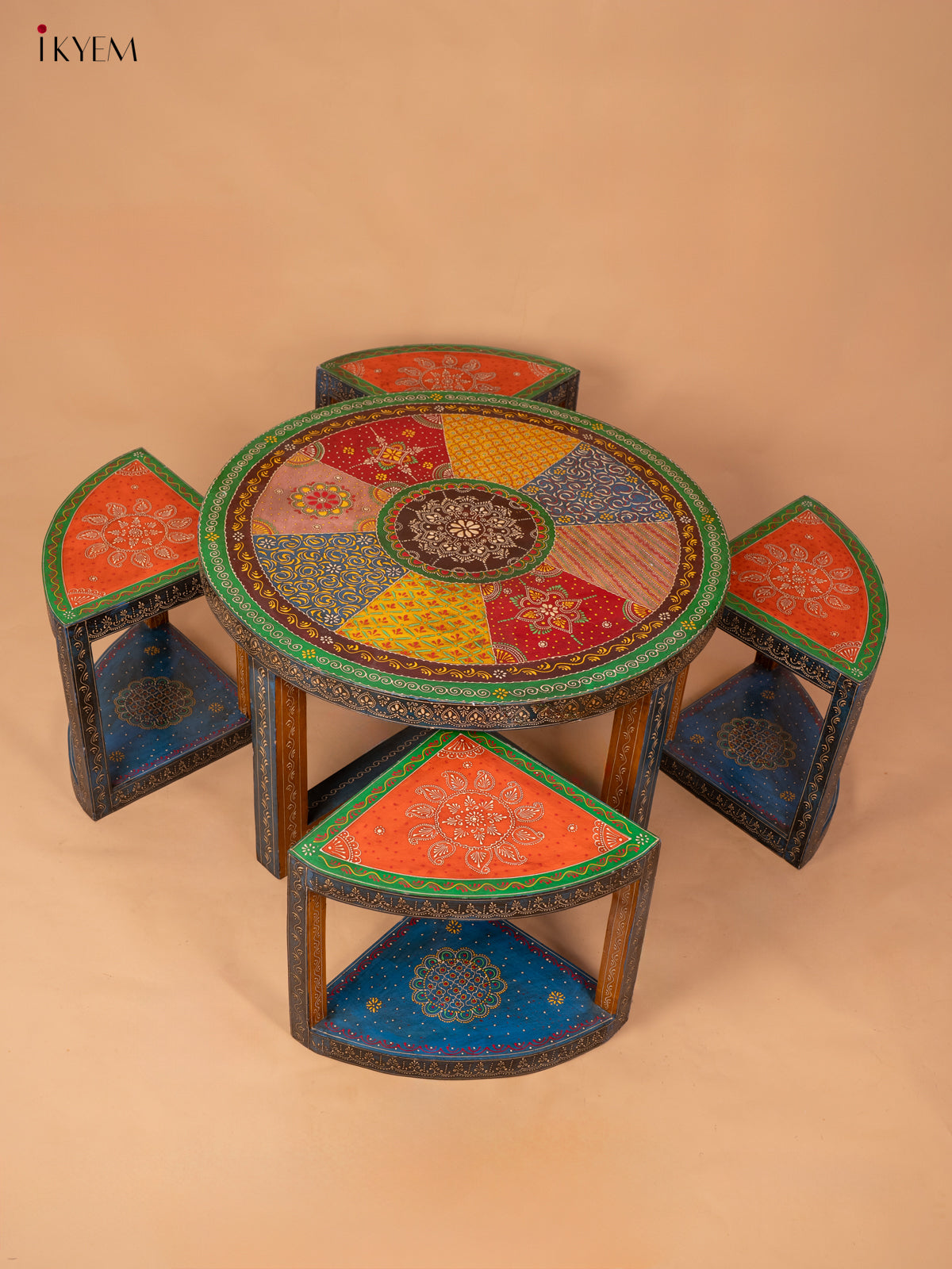 - This wooden hand-painted four-seater set with a centre table offers a stylish and unique design that enhances any living area.