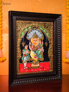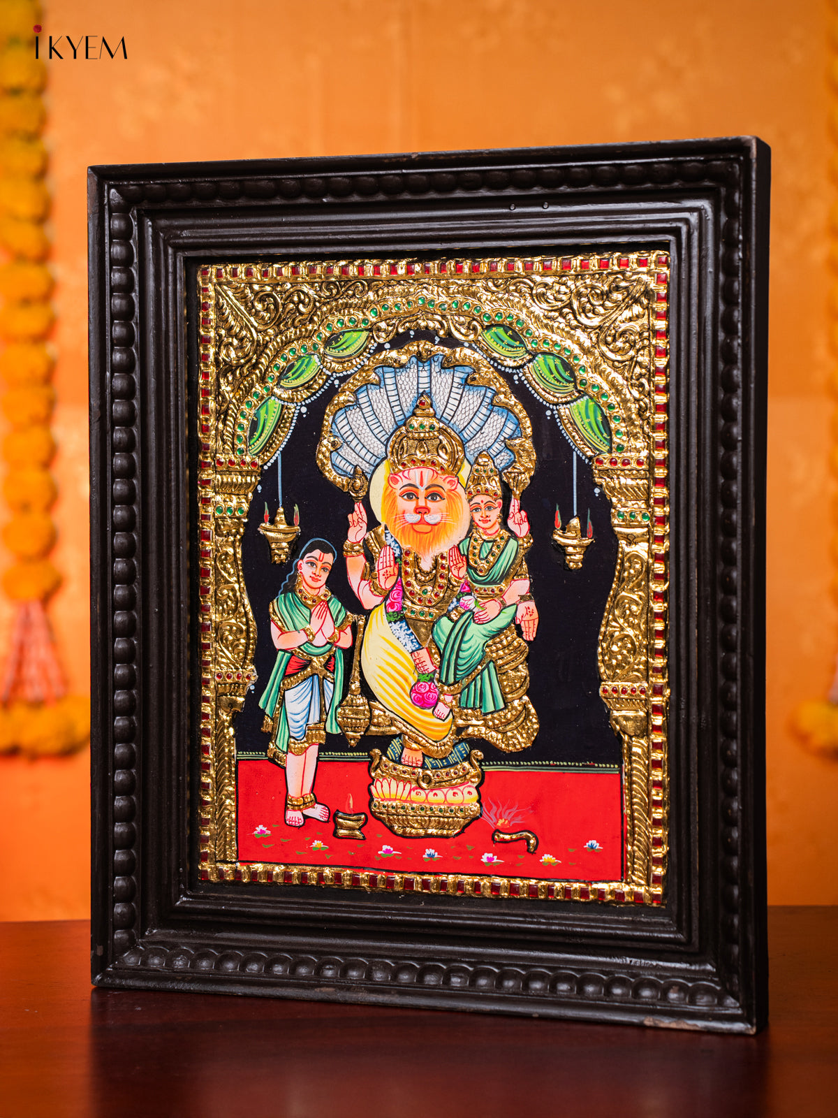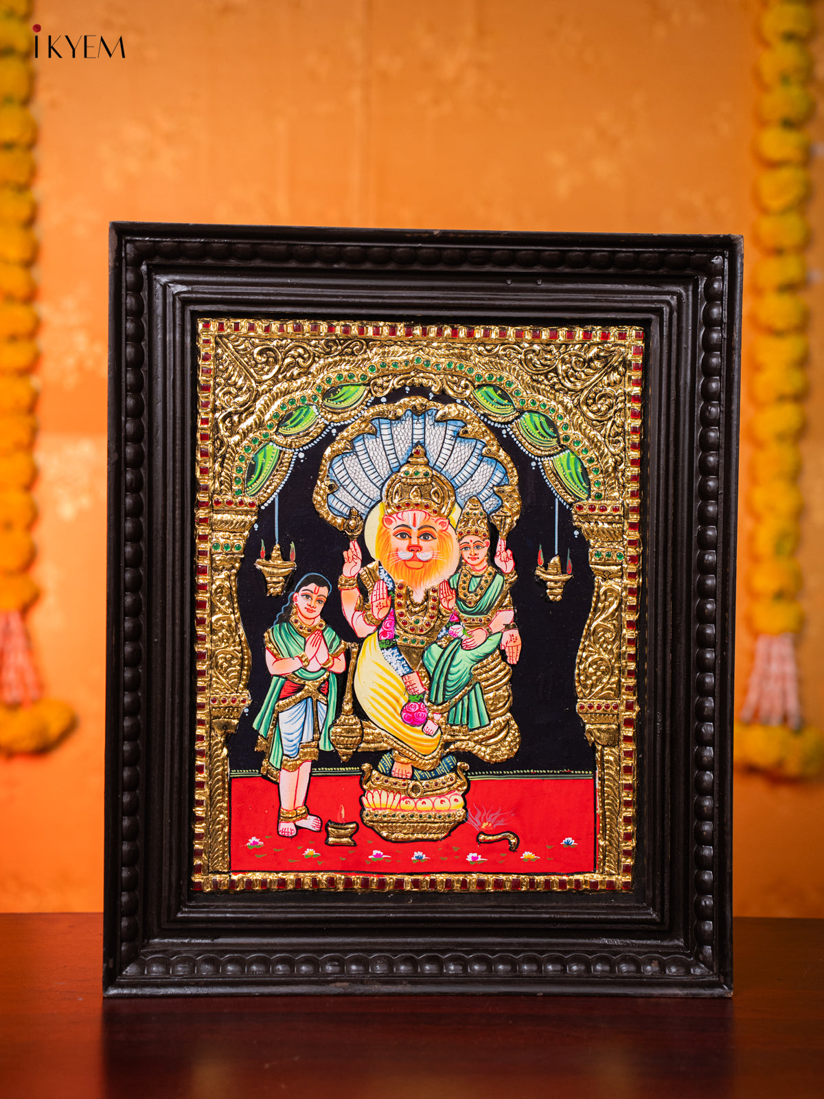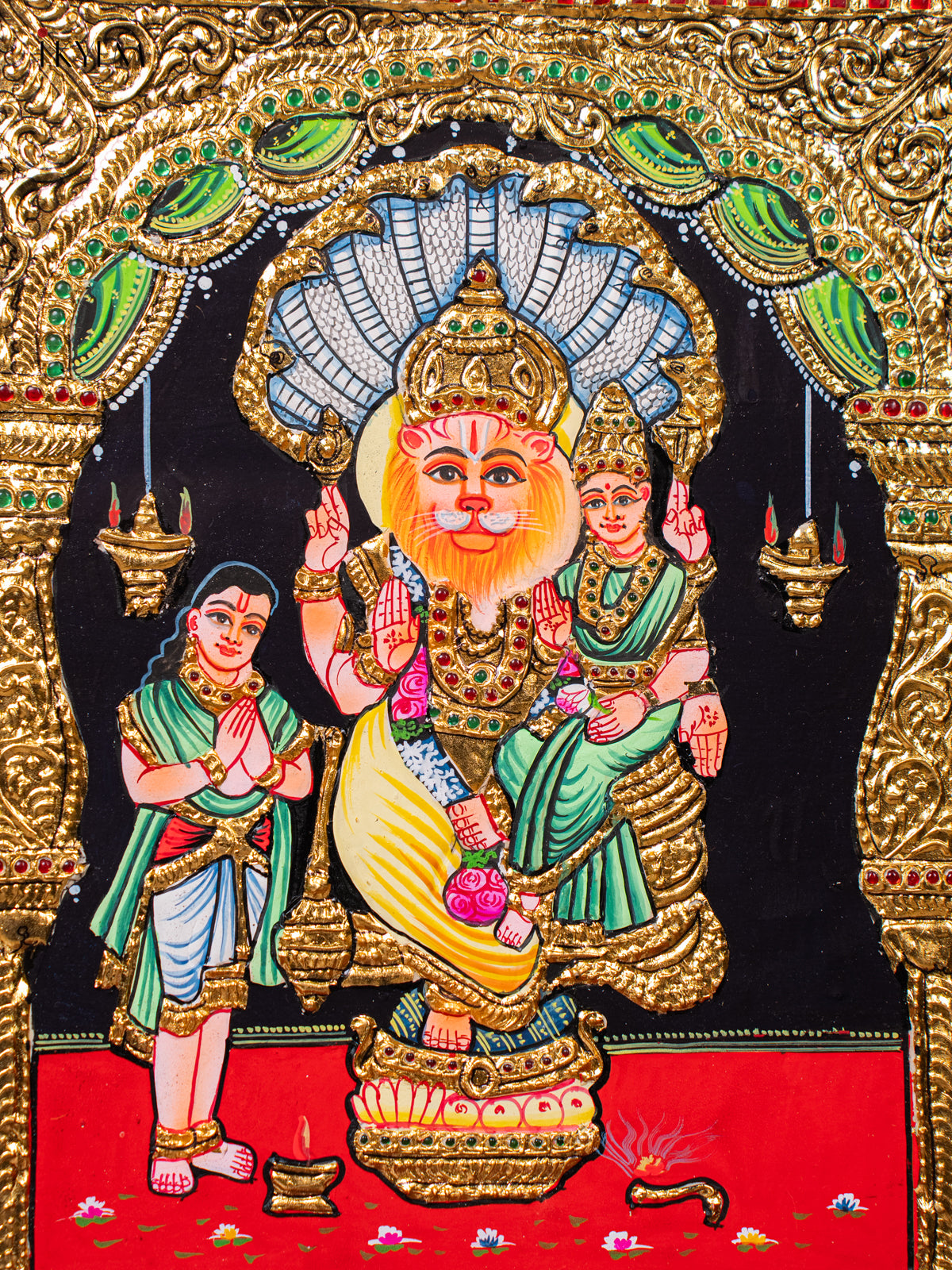• This magnificent Tanjore Paintings canvas depicts Lord Narasimha, the man-lion avatar of Vishnu, seated with Goddess Lakshmi, symbolizing strength and protection.