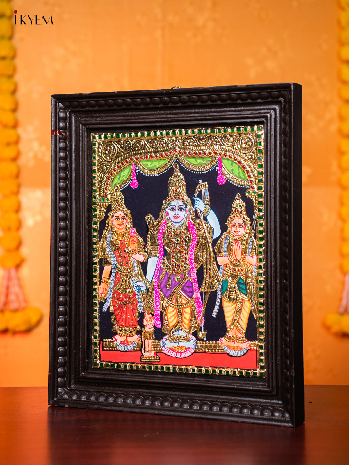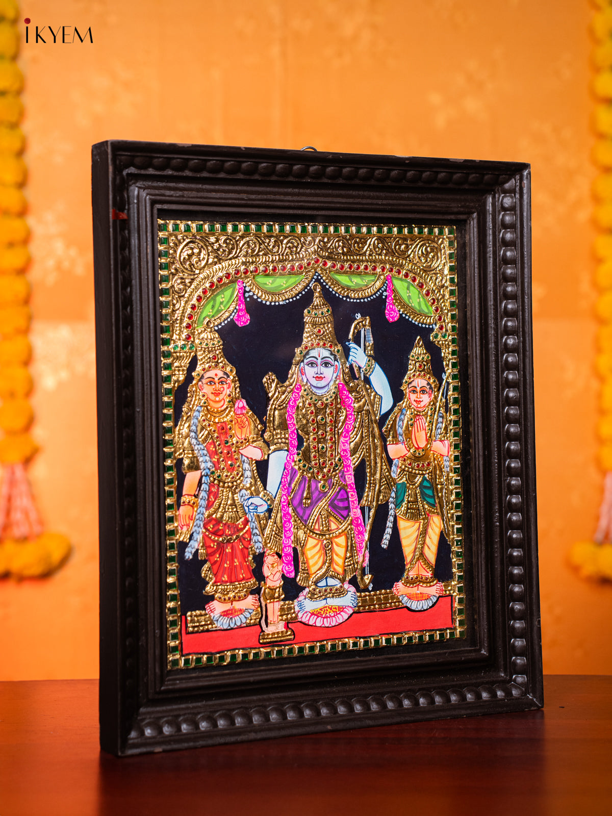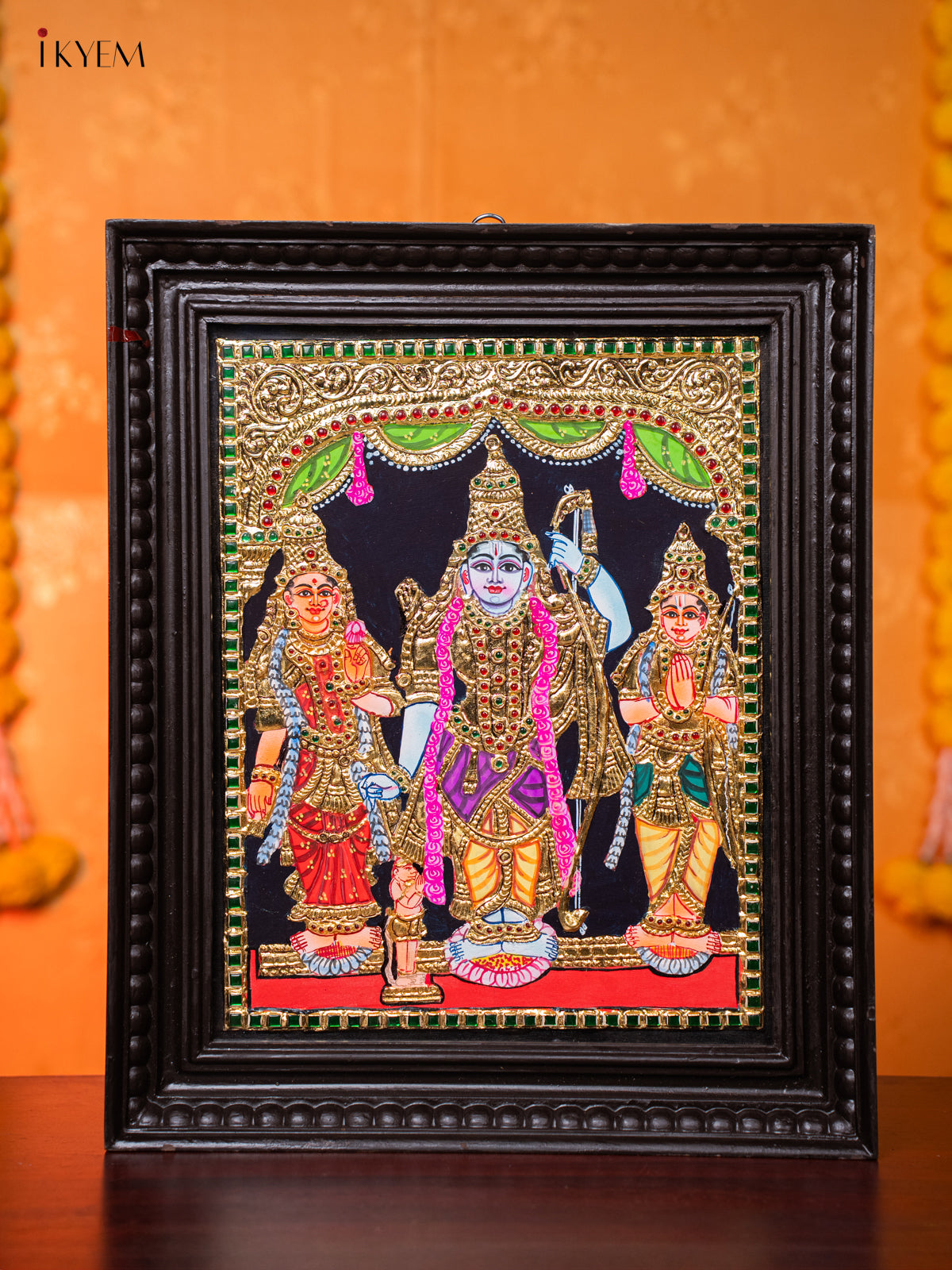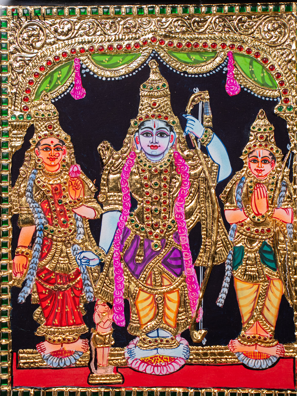 • Featuring Lord Rama, Sita, Lakshmana, and Hanuman under an ornate arch, this artwork is adorned with rich gold foil, vibrant hues, and semi-precious stones.