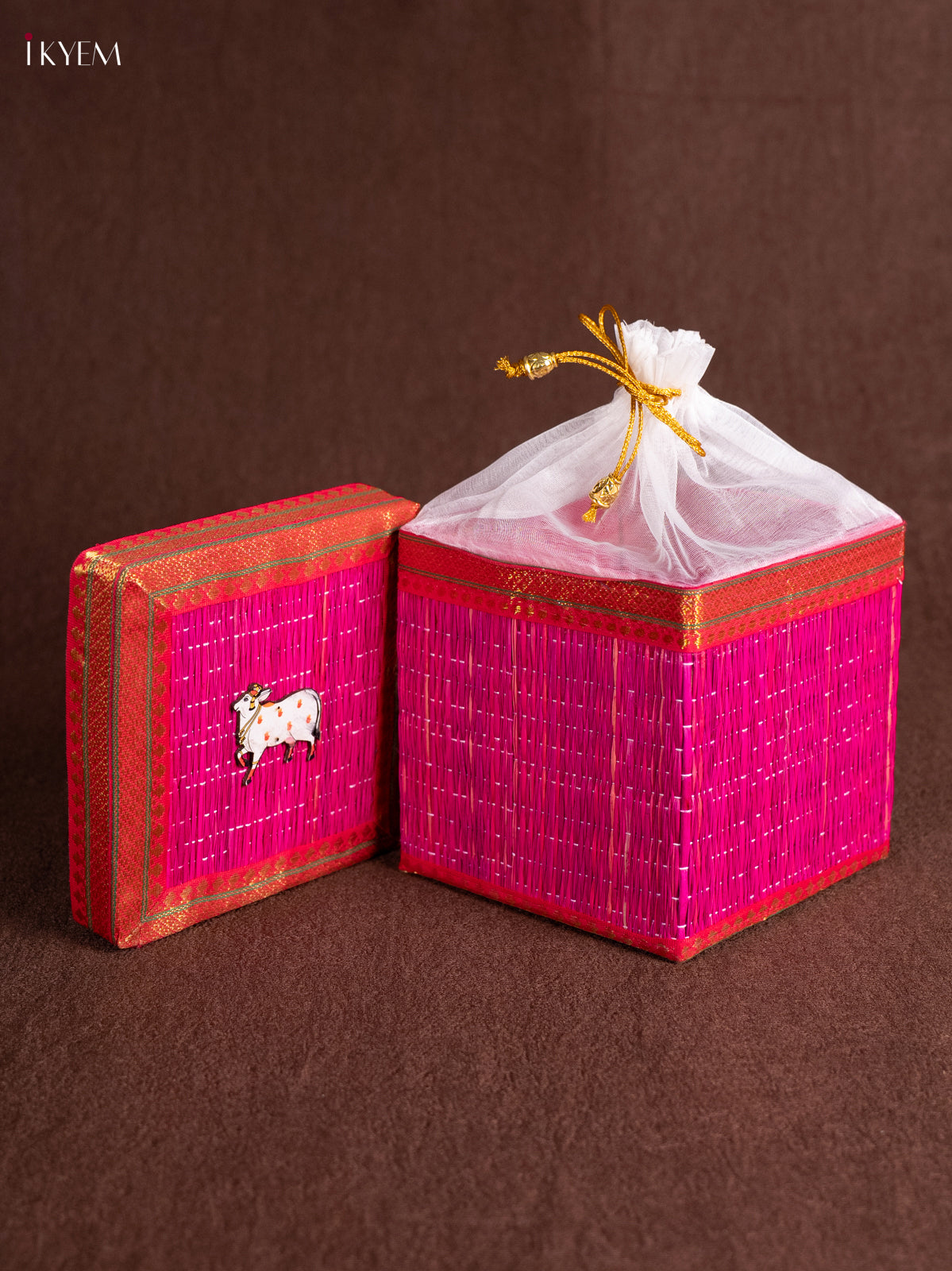 Present your gifts with traditional charm using the Cow Motif Korai Gift Box with Net Potli in elegant pink. Measuring 7 in (Height) × 6 in (Length) × 6 in (Breadth), weight 300g, it’s a perfect blend of cultural design and practical size for weddings, poojas, festivals, and return gifts.