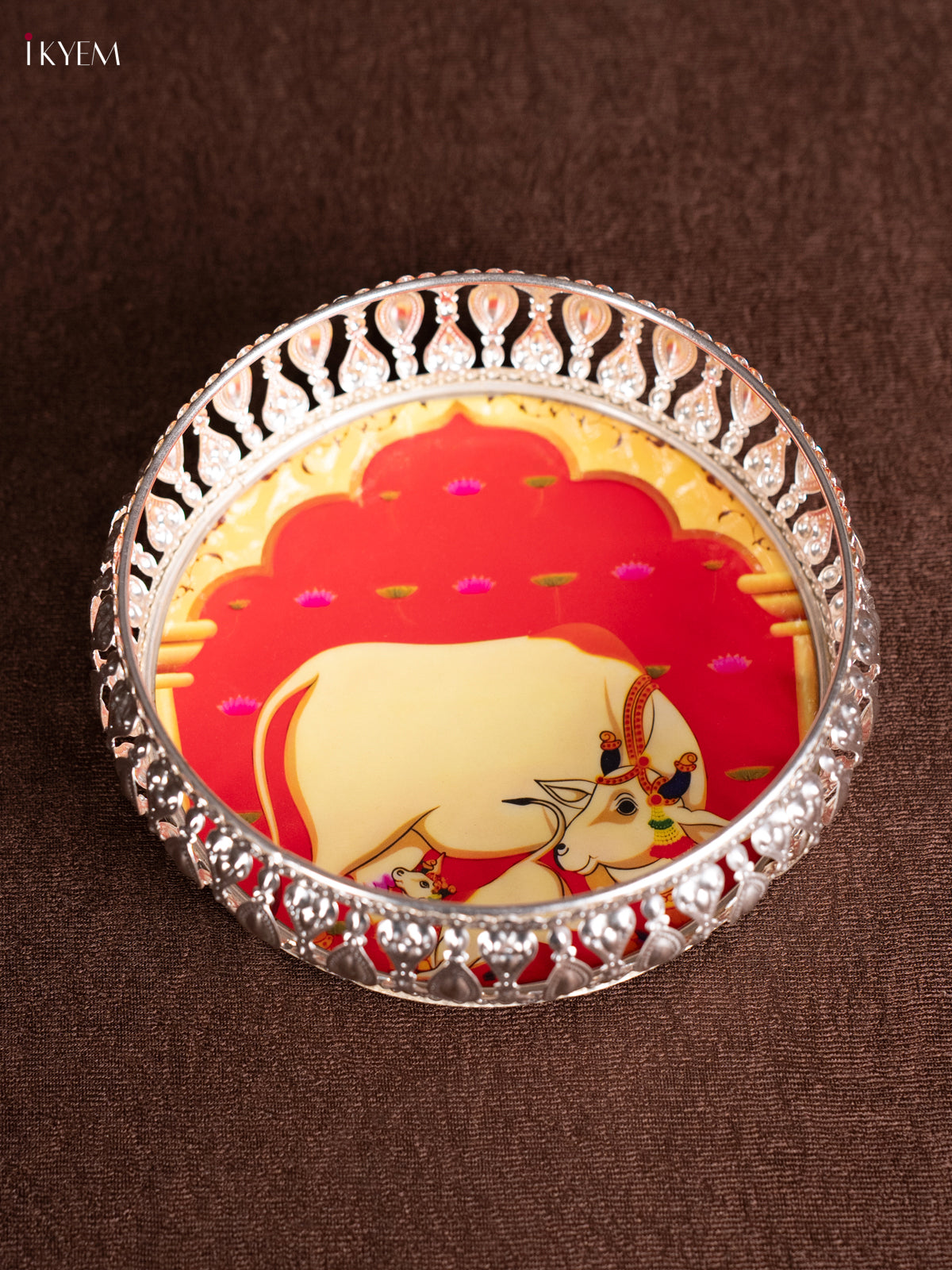 - Expertly crafted, this Digital Printed German Silver Tray boasts a stunning Cow & calf design in vibrant orange.