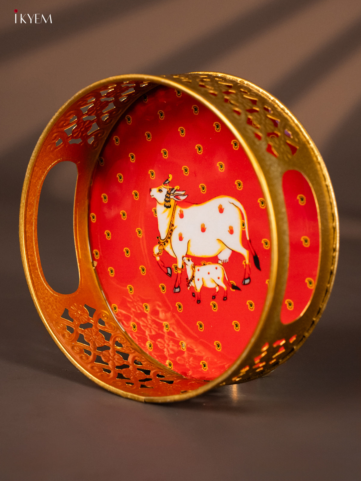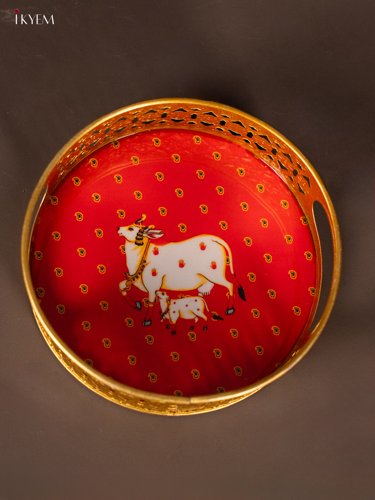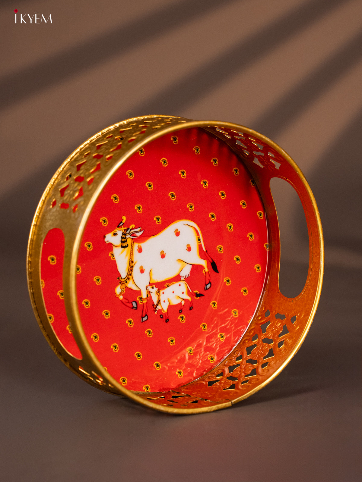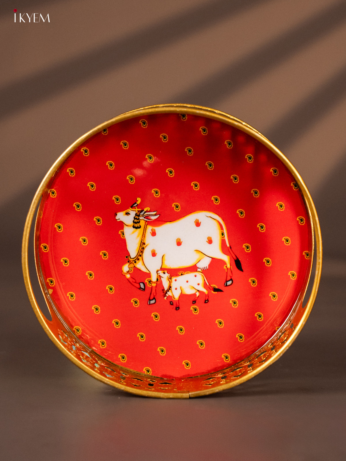 • This 6-inch round metal tray features a digitally printed red design of a cow and calf, reflecting traditional motifs.