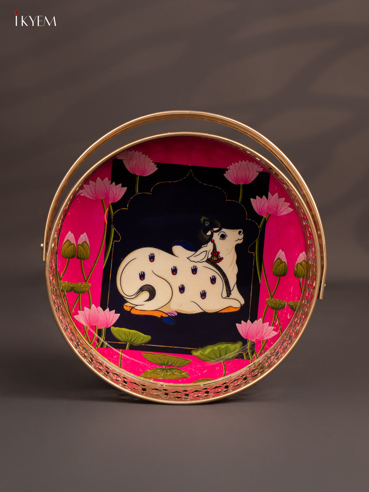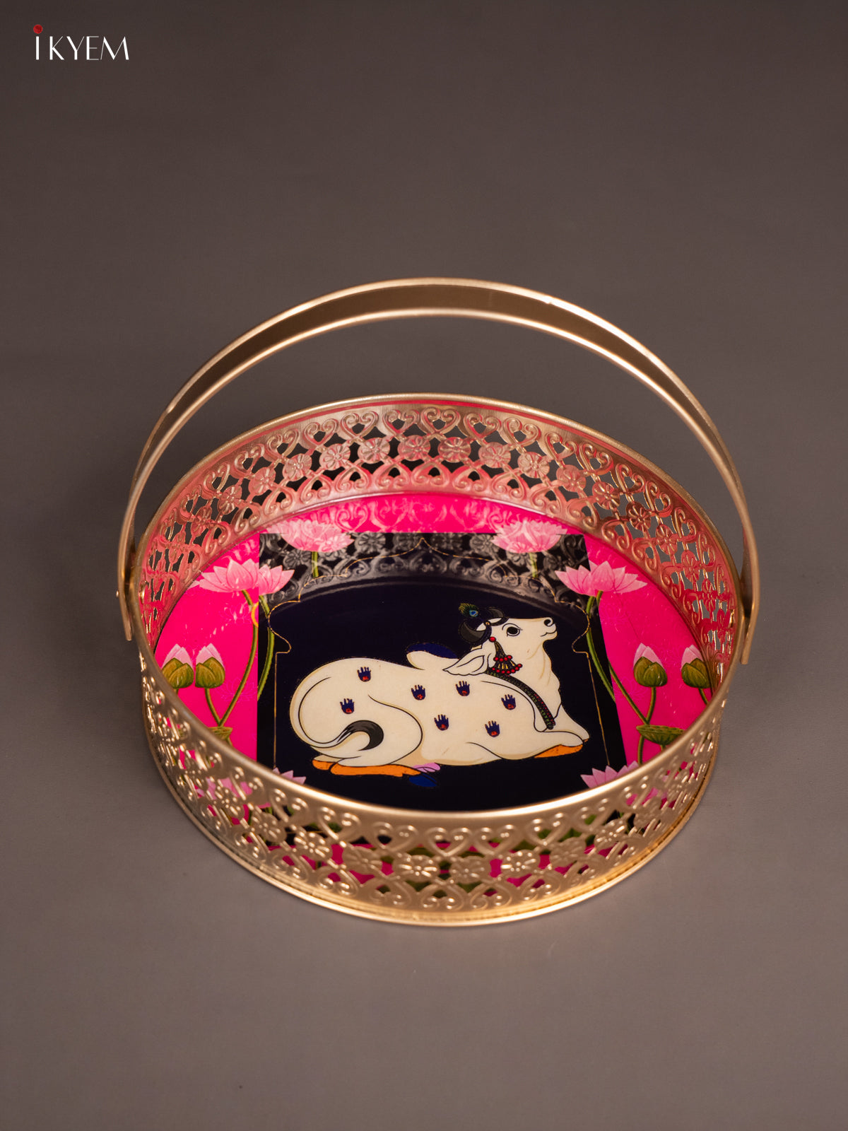 Pichwai Cow Digital Printed Metal Flower Basket - Pink - KJ18113