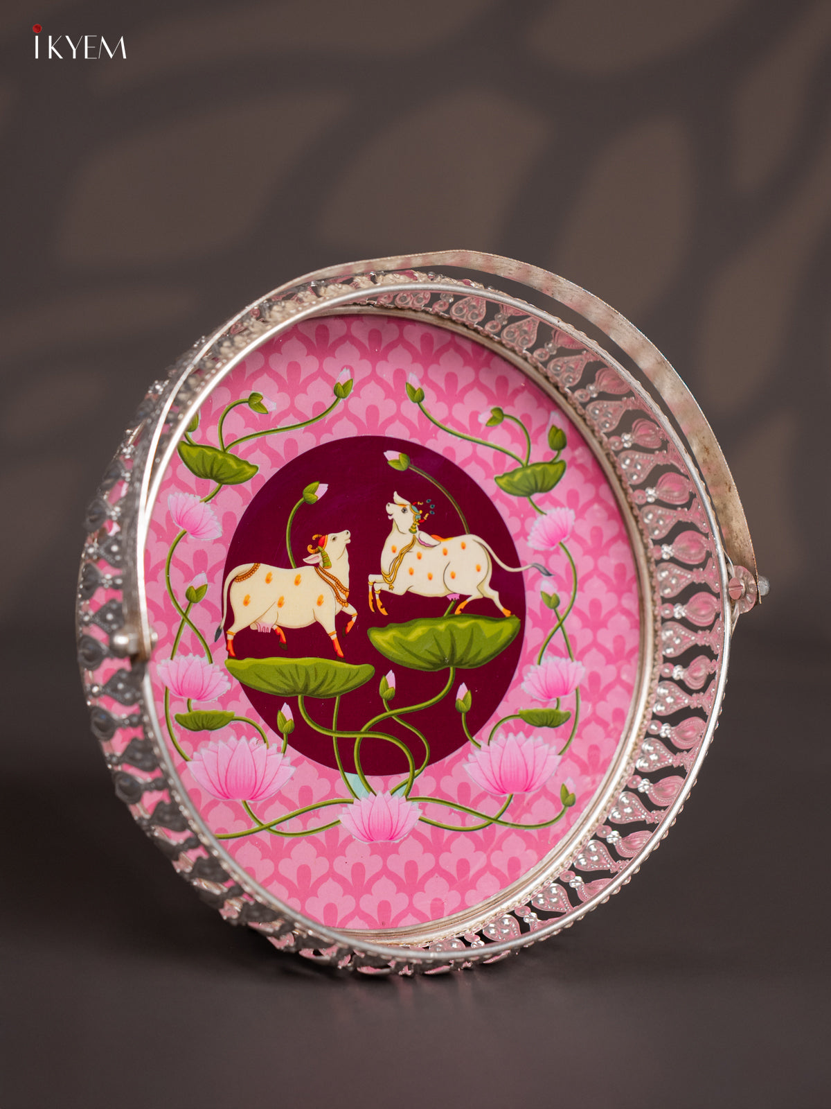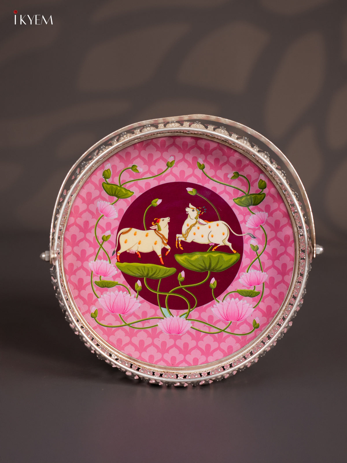 Digital Printed German Silver Tray With Handle - Cow Lite Pink - KJ31203