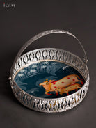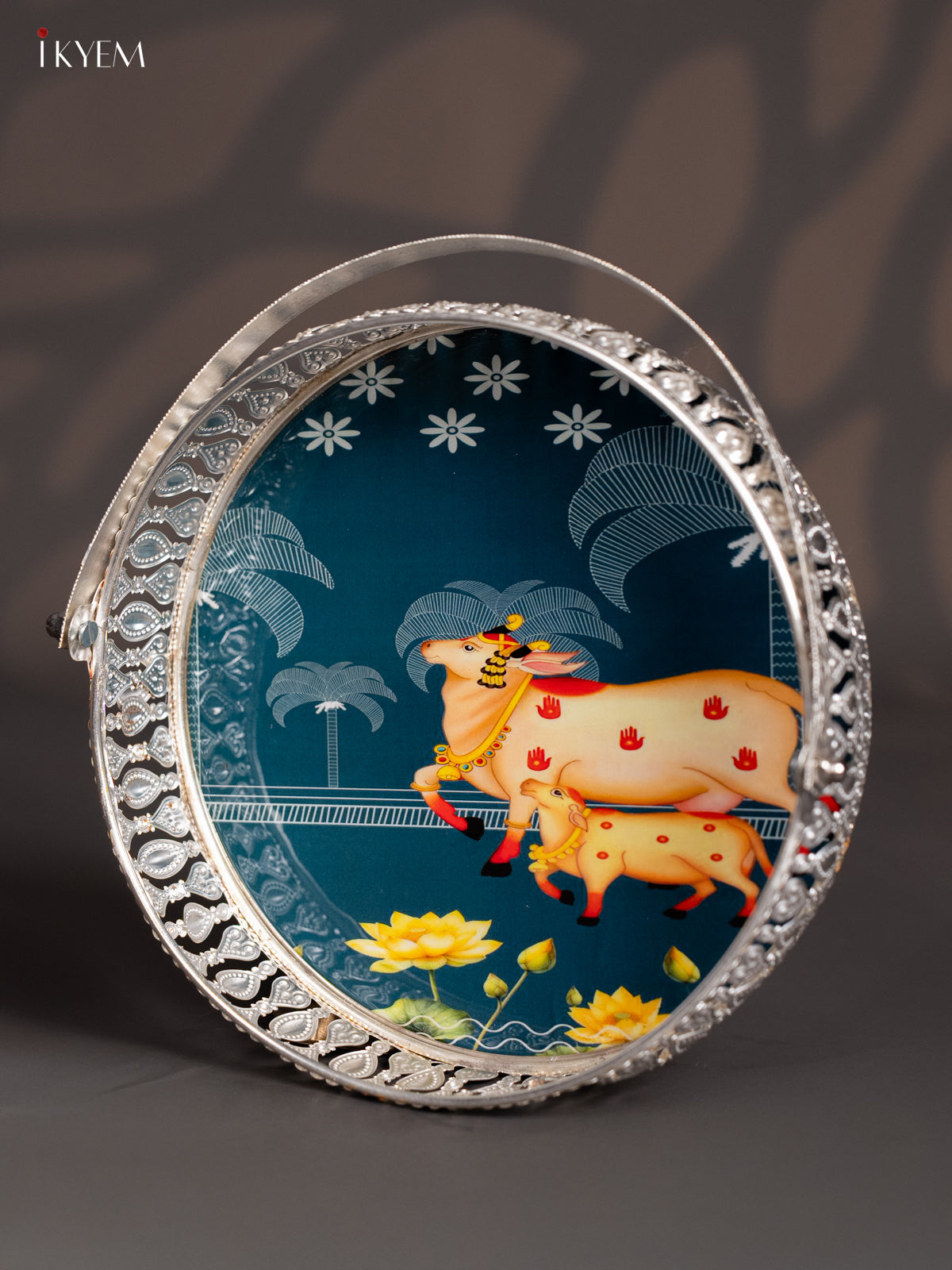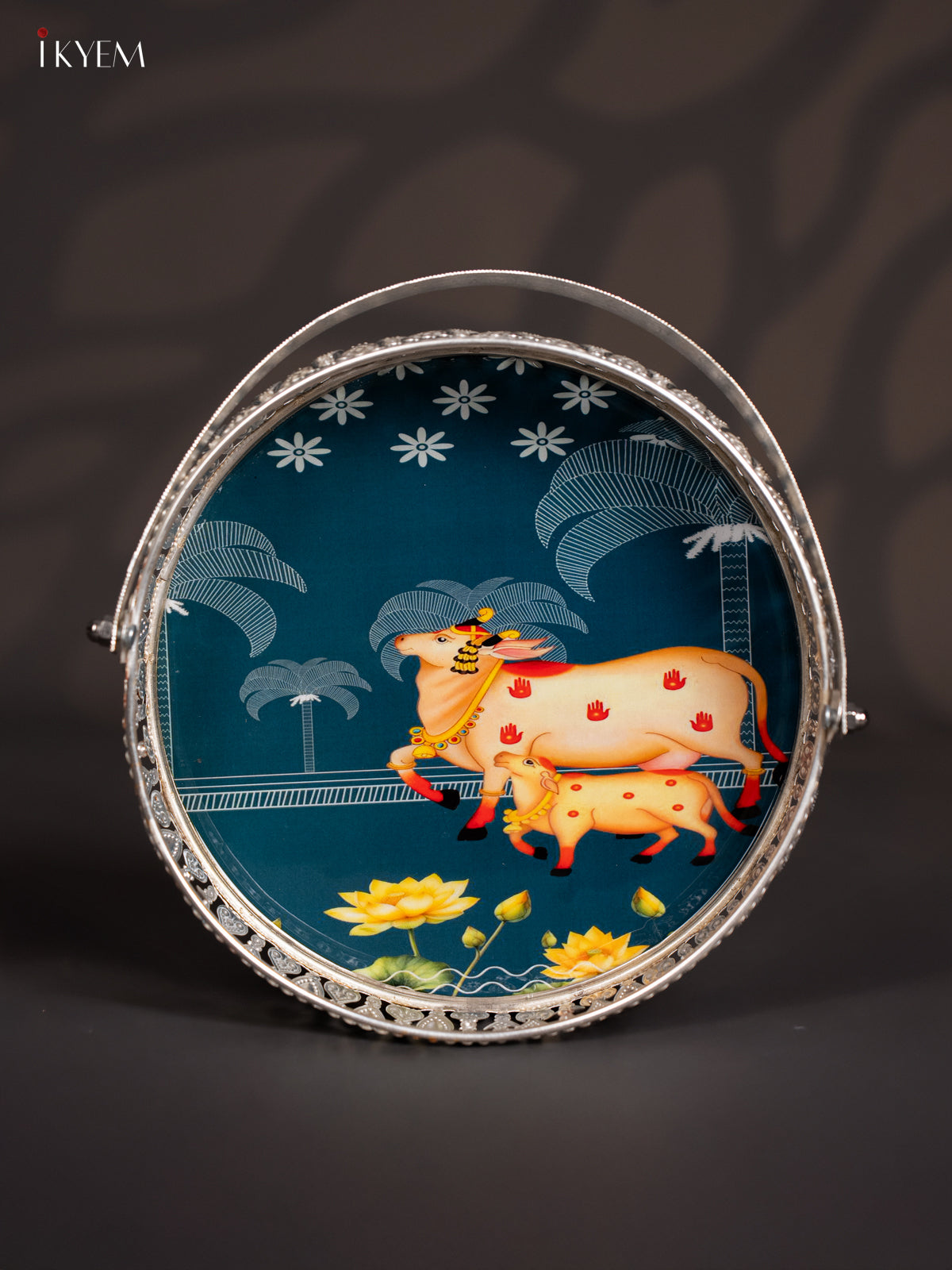 Digital Printed German Silver Tray With Handle - Cow&calf Dark blue - KJ31205