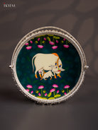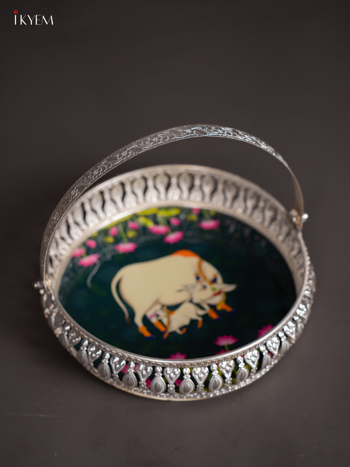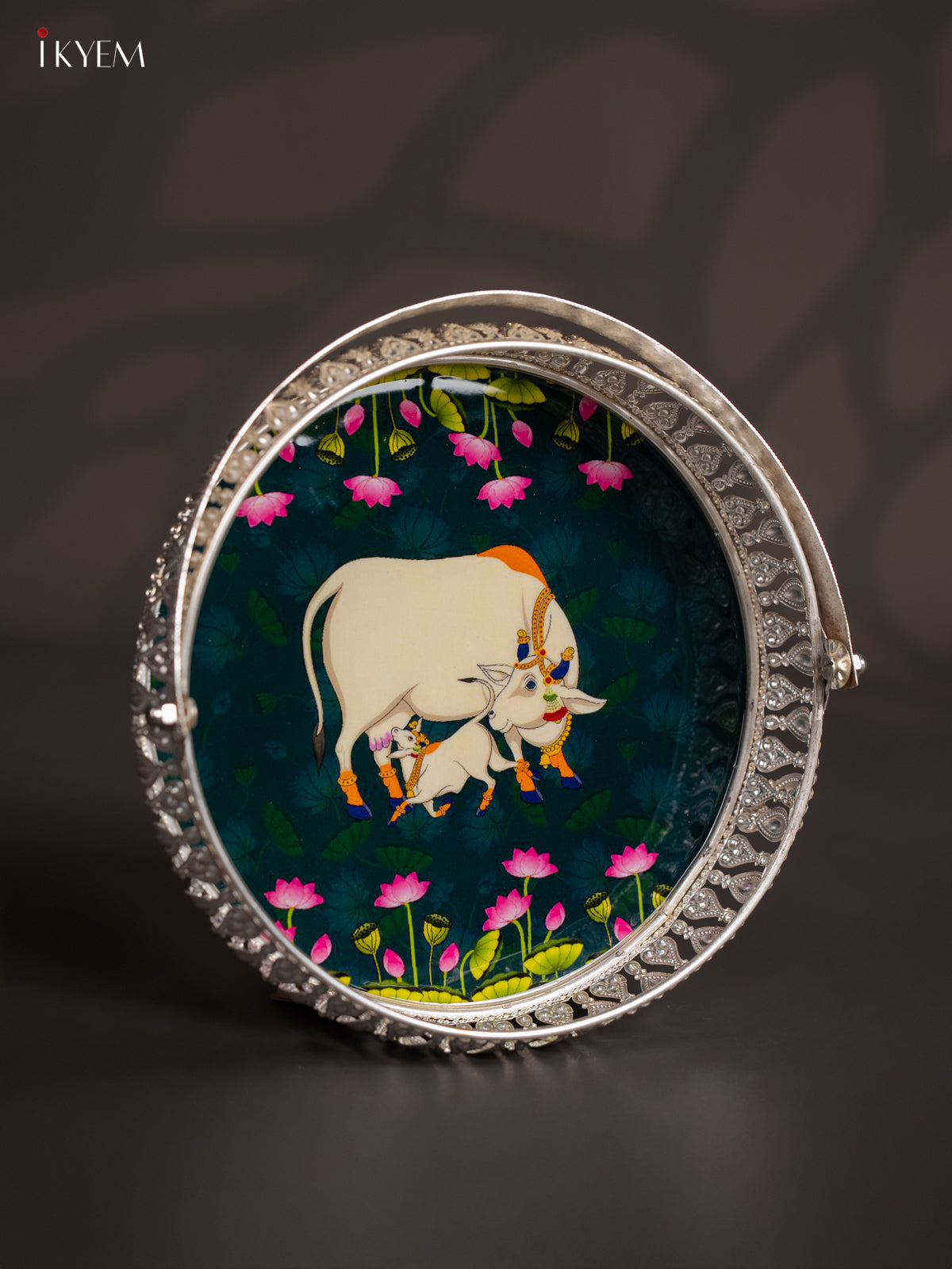 - Elevate your home décor with this exquisite German silver tray featuring a striking digital-printed design inspired by traditional Pichwai art.
