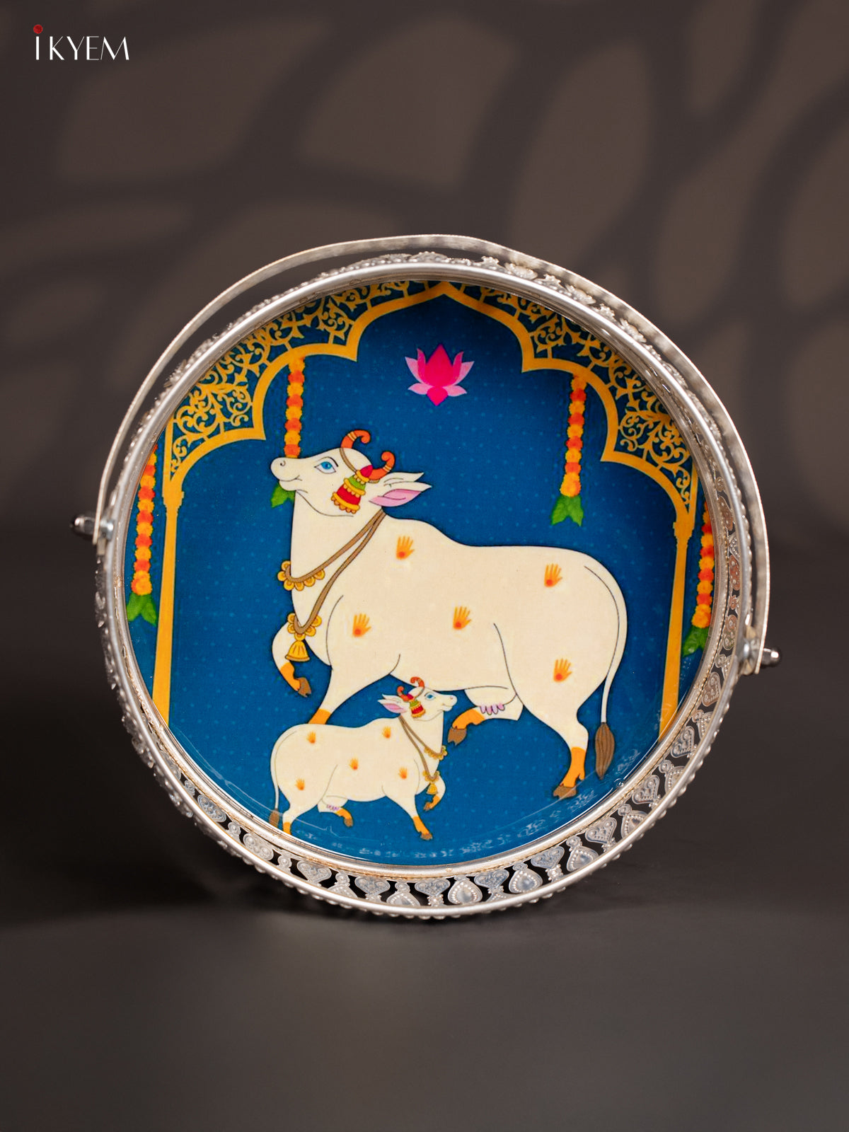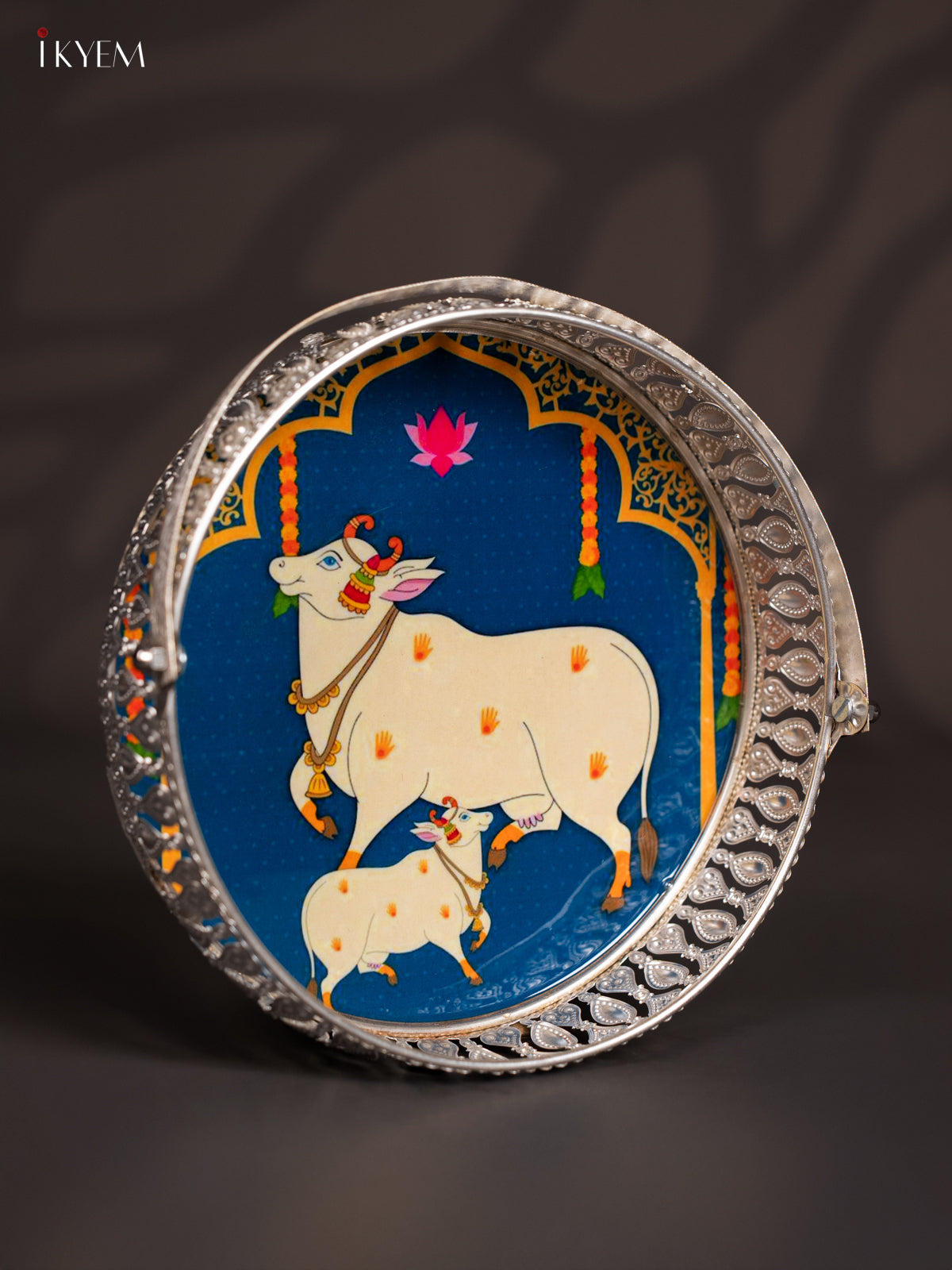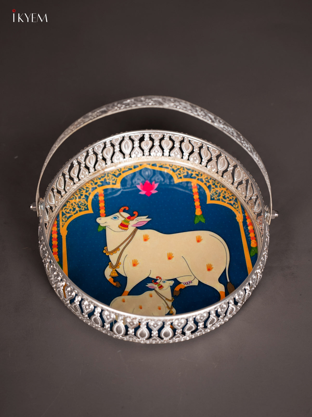 - Elevate your home décor with this exquisite German silver tray featuring a striking digital-printed design inspired by traditional Pichwai art.