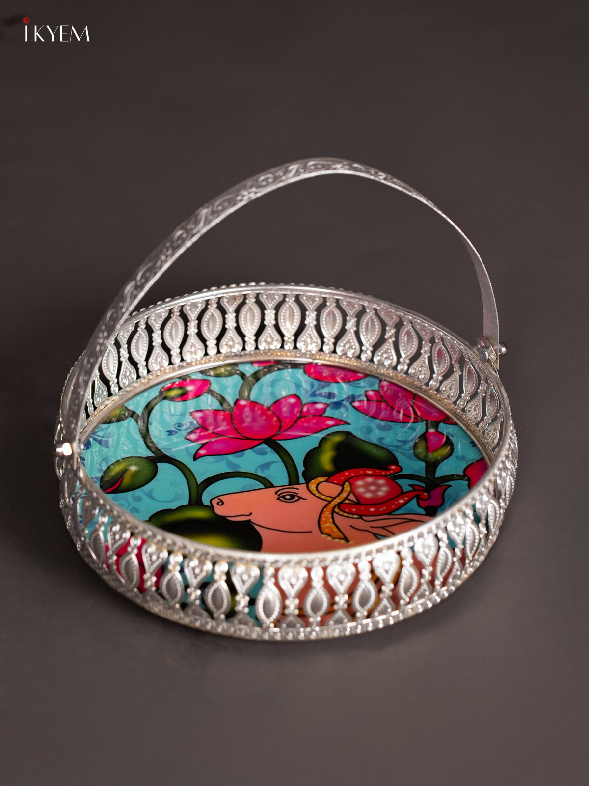 Digital Printed German Silver Tray With Handle - Cow Ramar blue