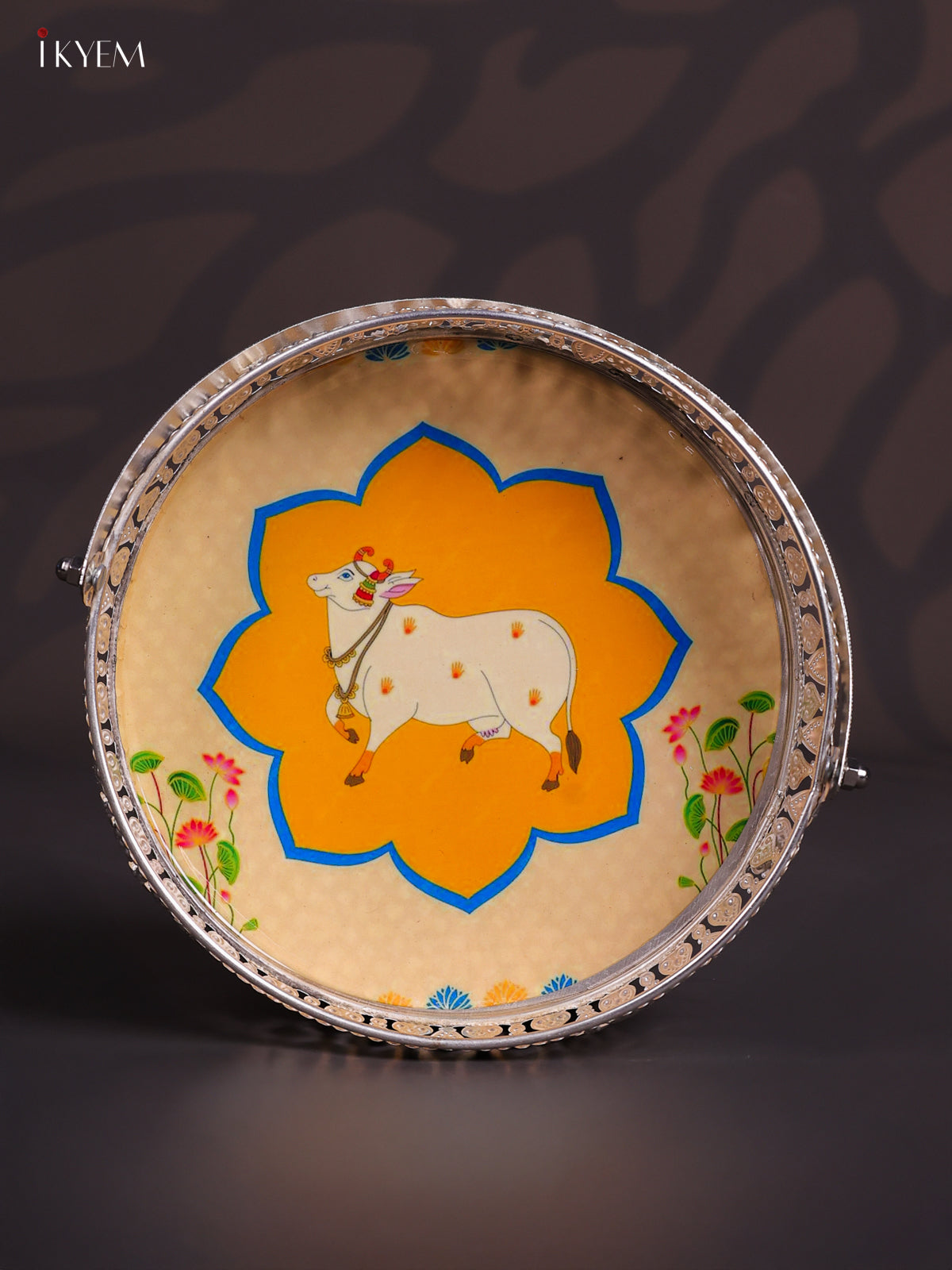 Digital Printed German Silver Tray With Handle - Cow Yellow