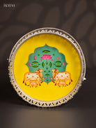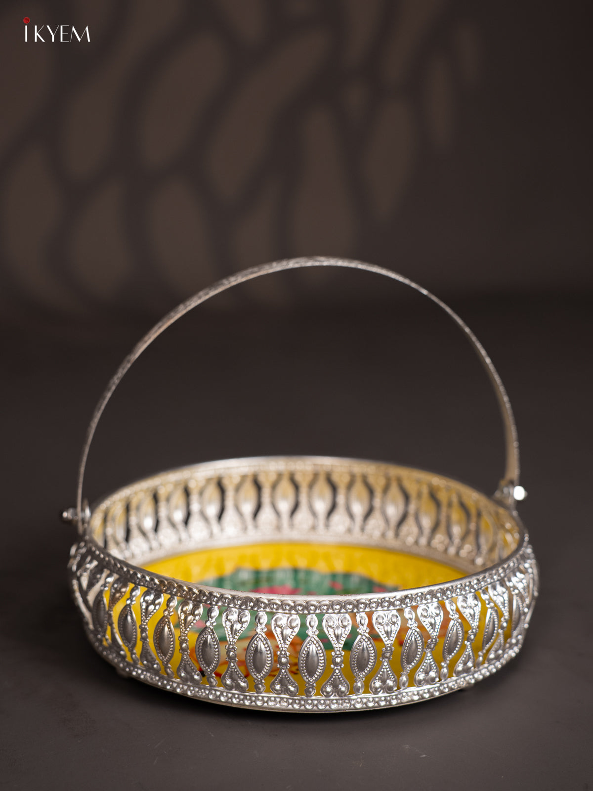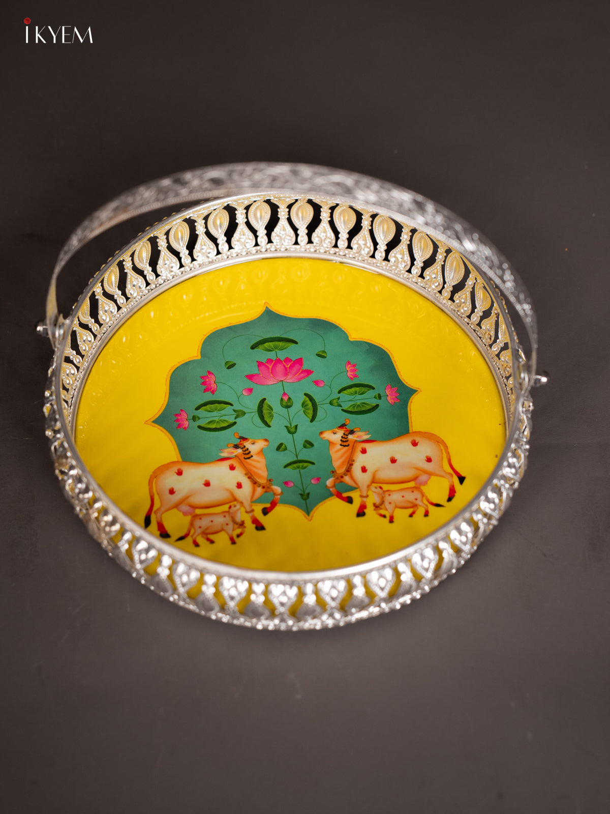 Digital Printed German Silver Tray With Handle - Cow&calf Yellow with Green