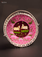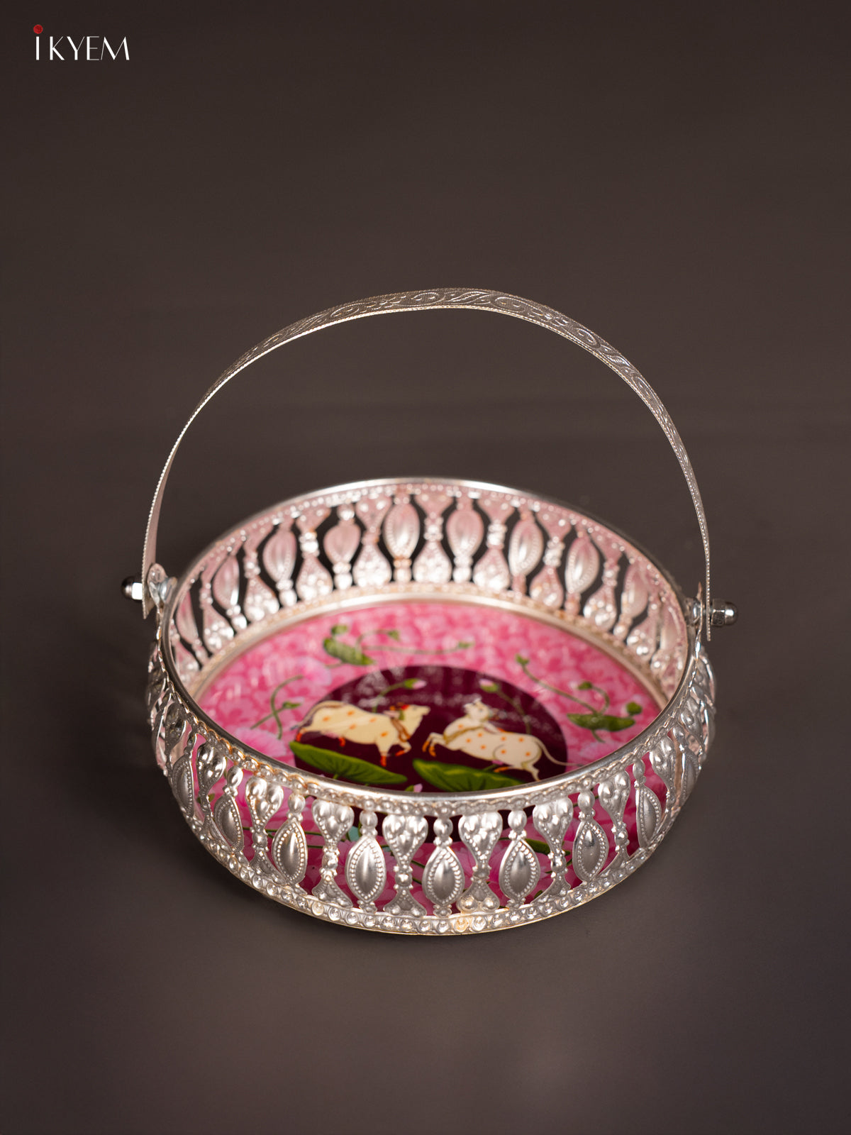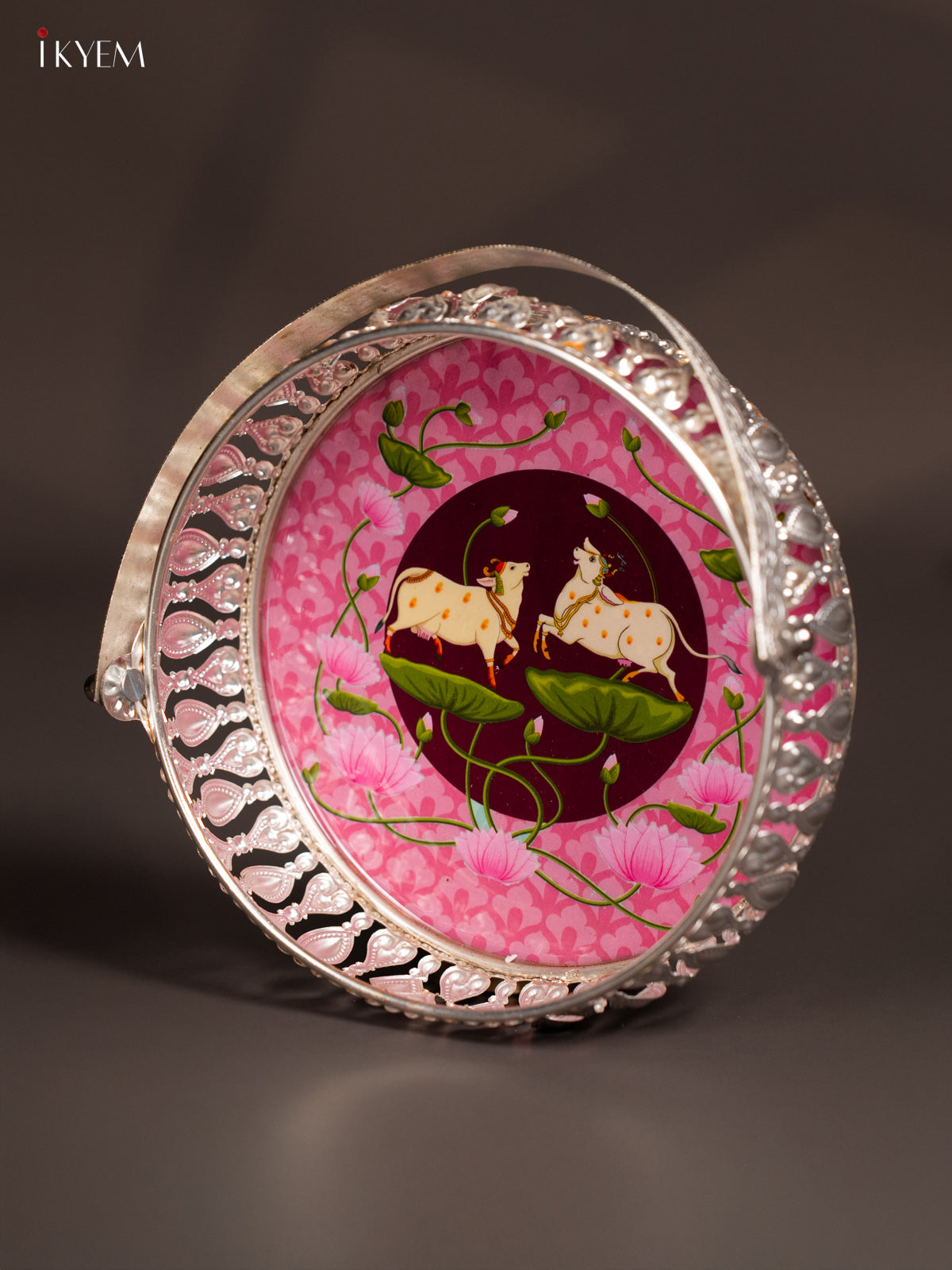 Digital Printed German Silver Tray With Handle - Cow lite Pink - 6 inch