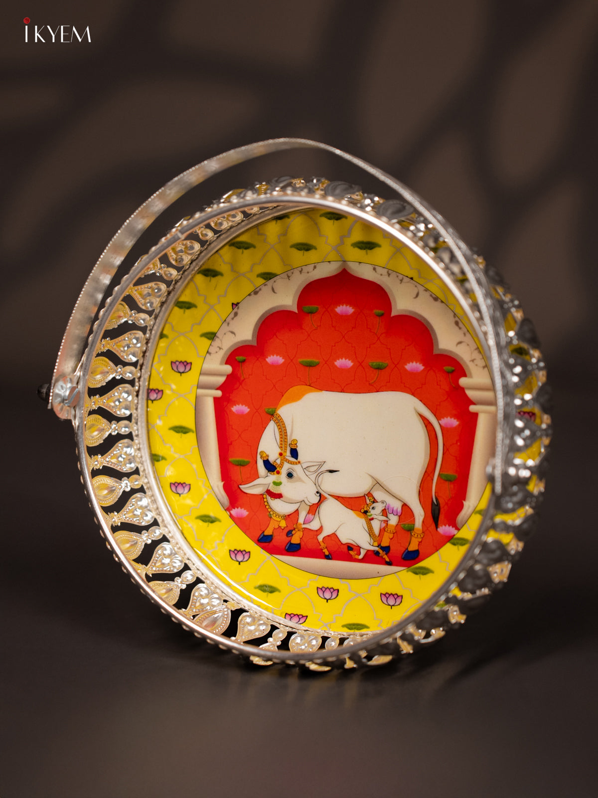 Digital Printed German Silver Tray With Handle - Cow&calf Yellow with orange - 6 inch