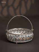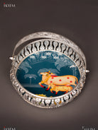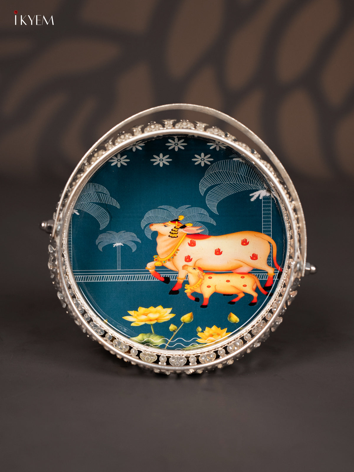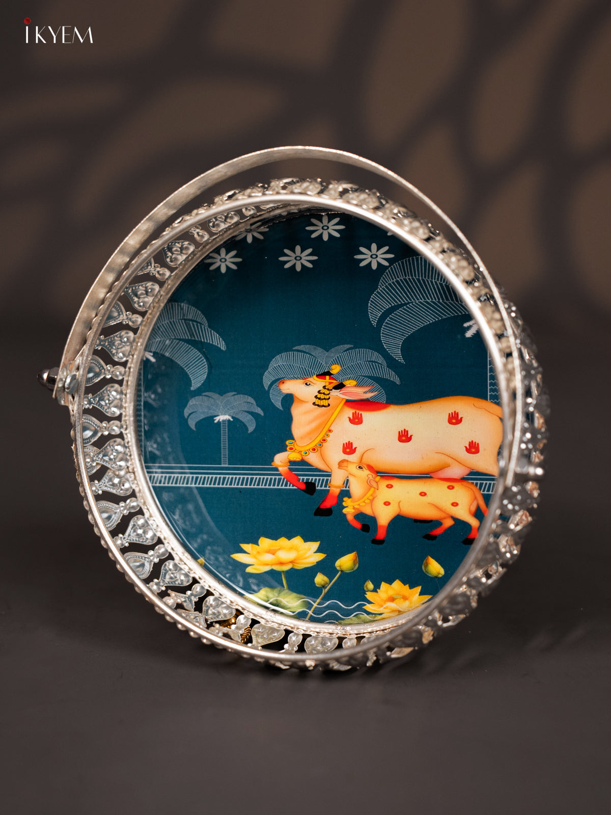 Digital Printed German Silver Tray With Handle - Cow&calf Dark blue - 6 inch