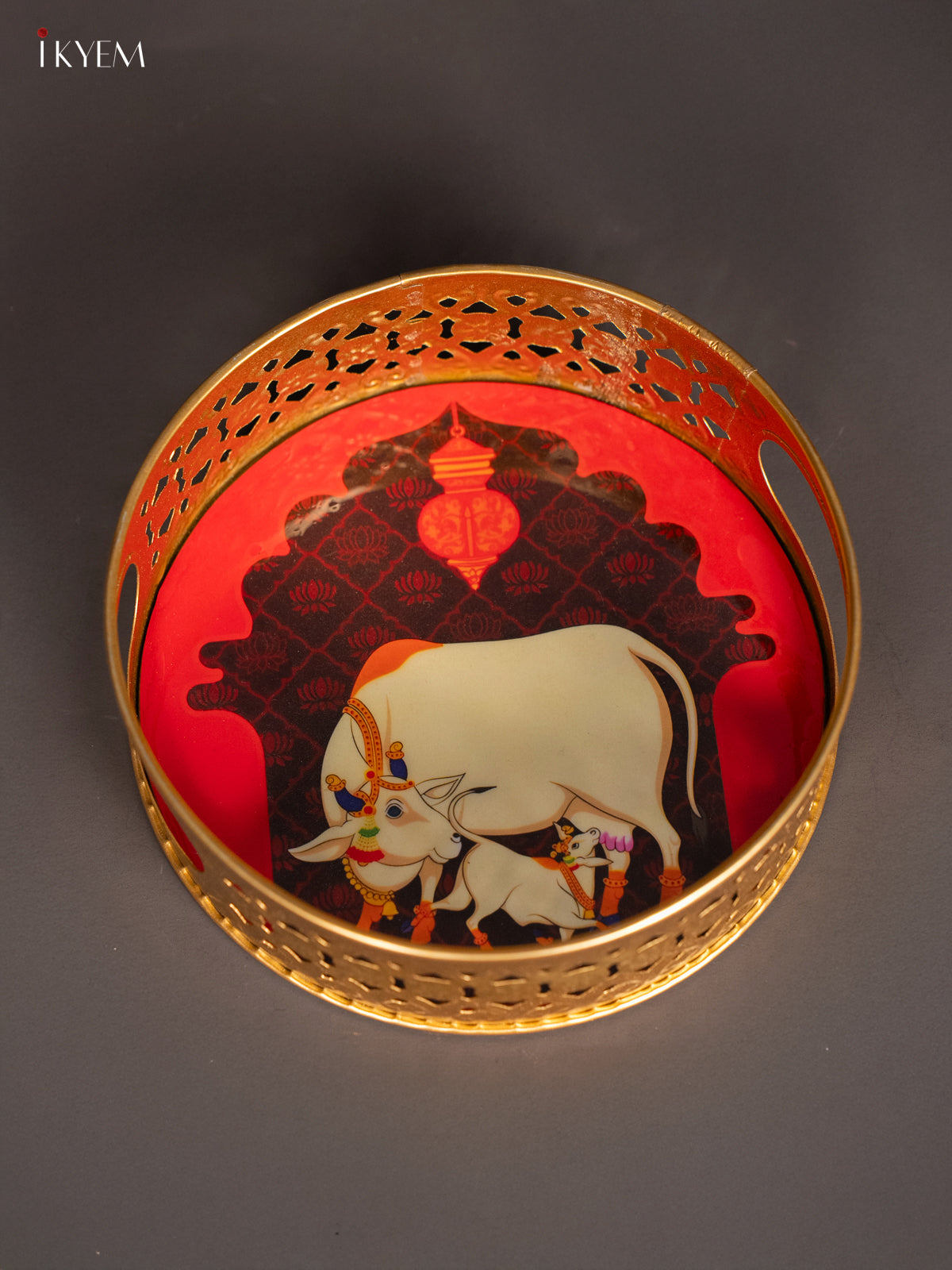 Discover this elegant 6-inch Metal Digital Pichwai Tray featuring a traditional Cow & Calf design — perfect for home decor, festive gifting, or pooja rituals. Crafted with care, it measures 6 inches × 6 inches × 2 inches and weighs about 120 g. Perfect for home décor, pooja rituals or festive gifting; this durable metal tray blends artistry with everyday utility.