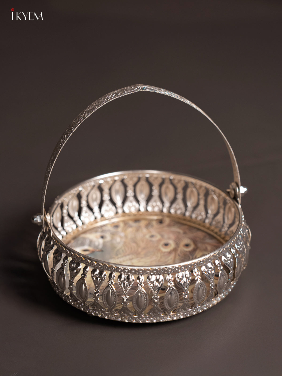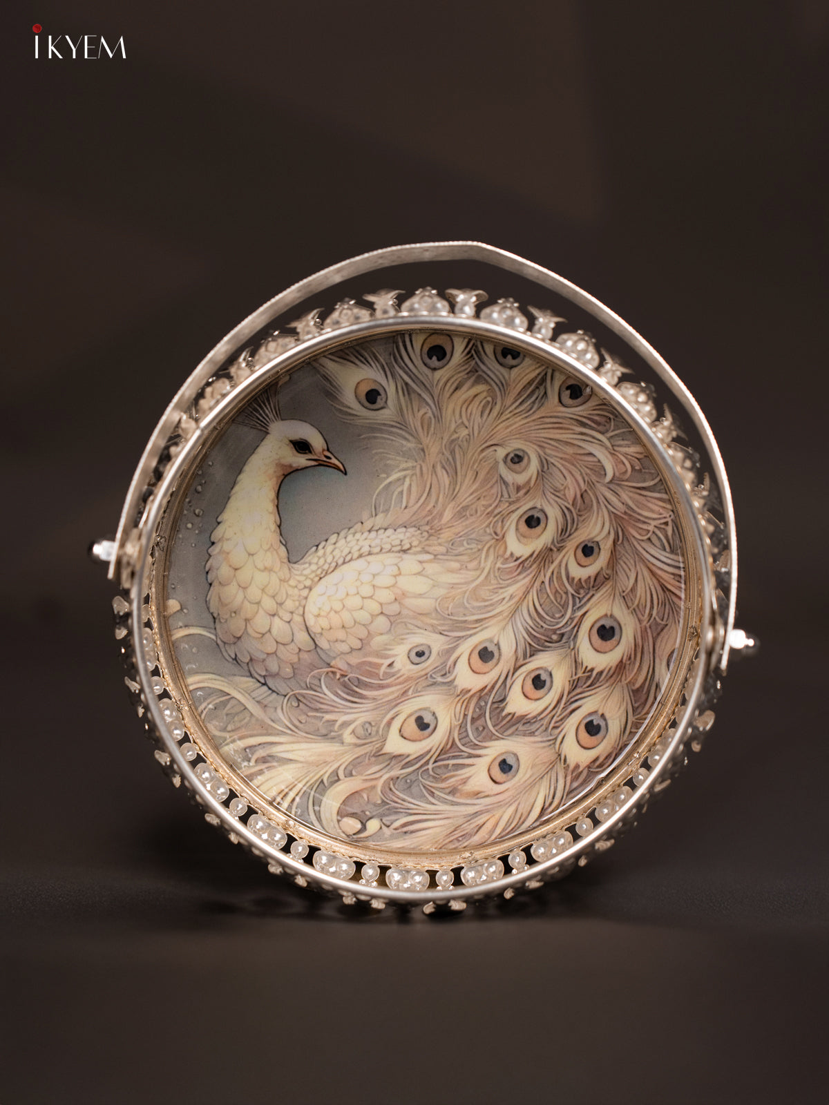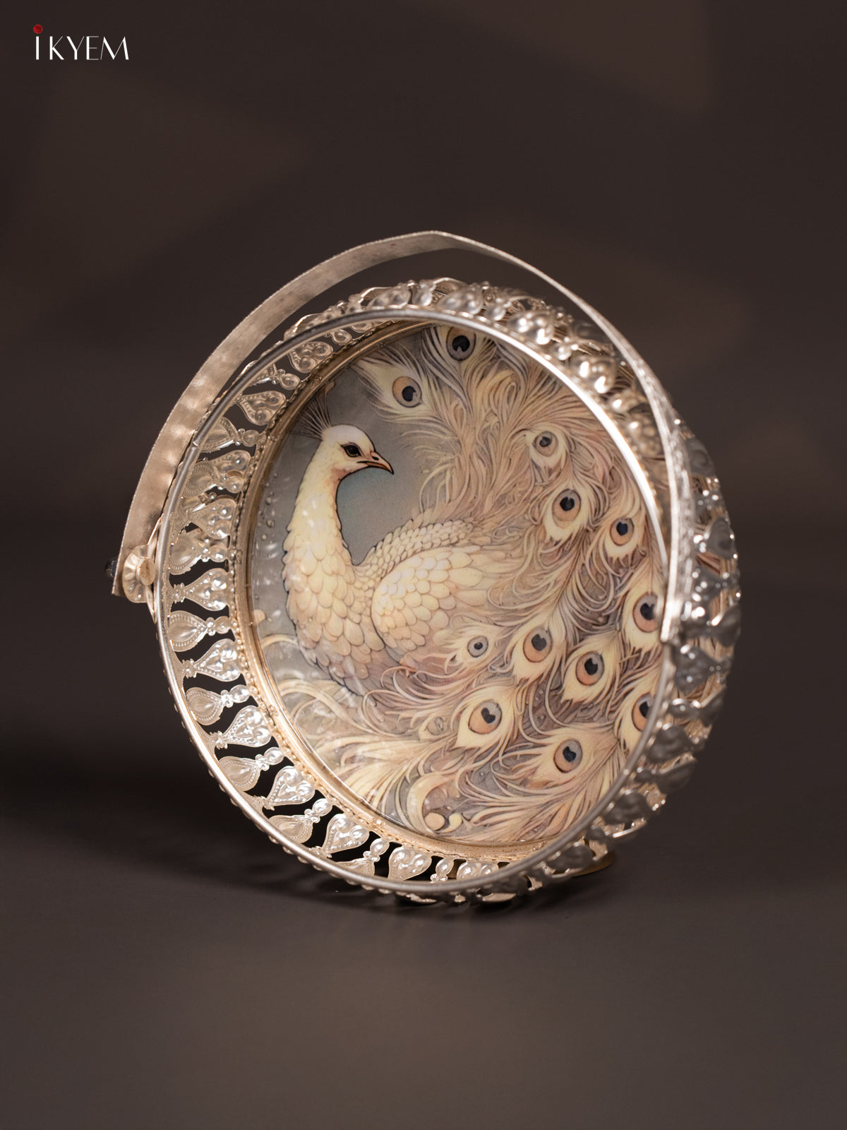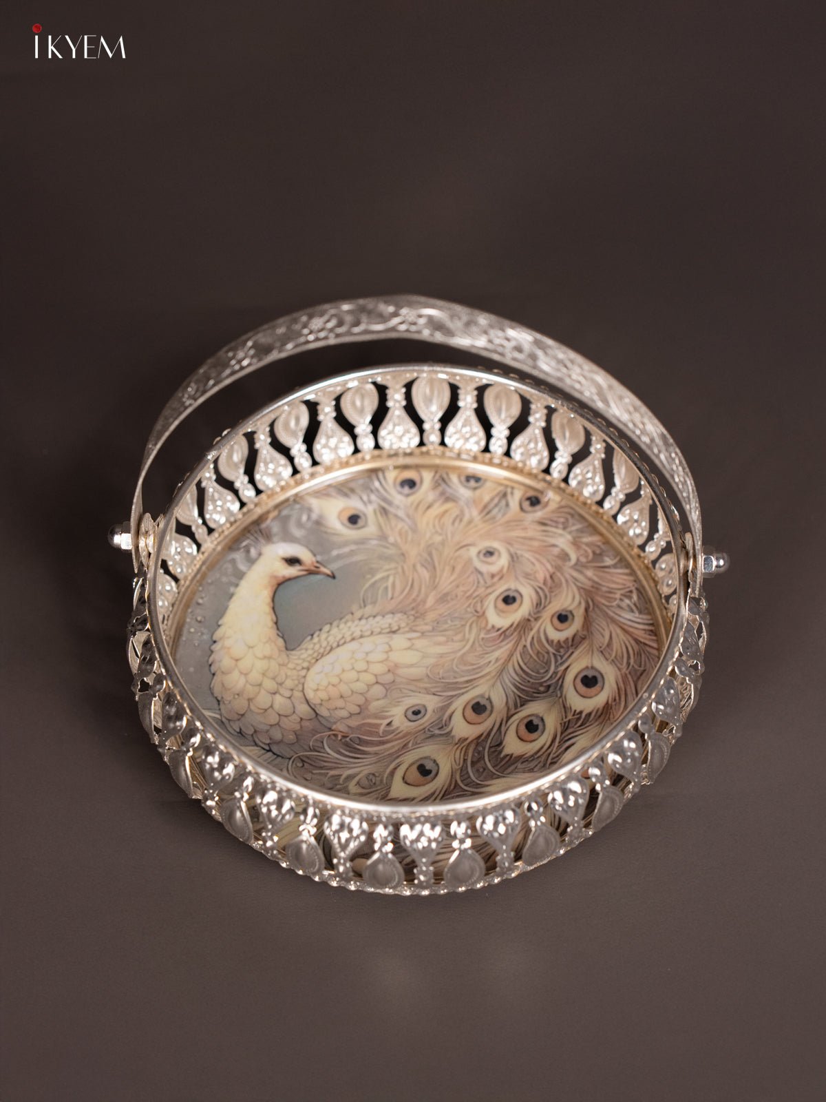 Digital Printed German Silver Tray With Handle - White Peacock - 6 inch