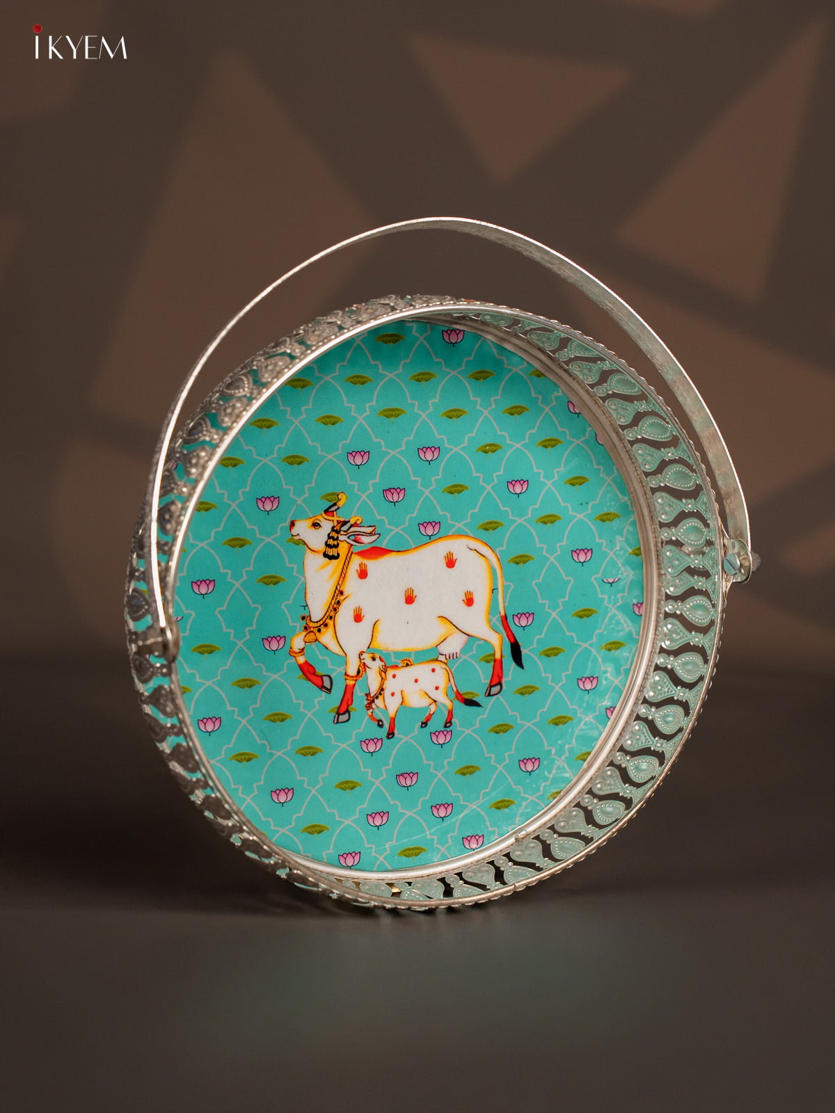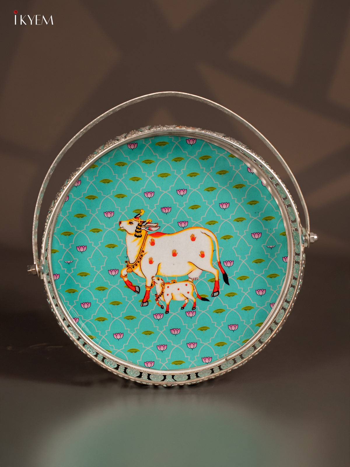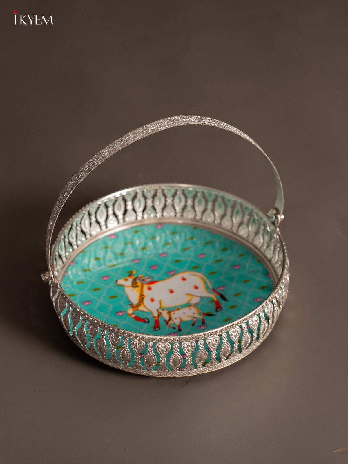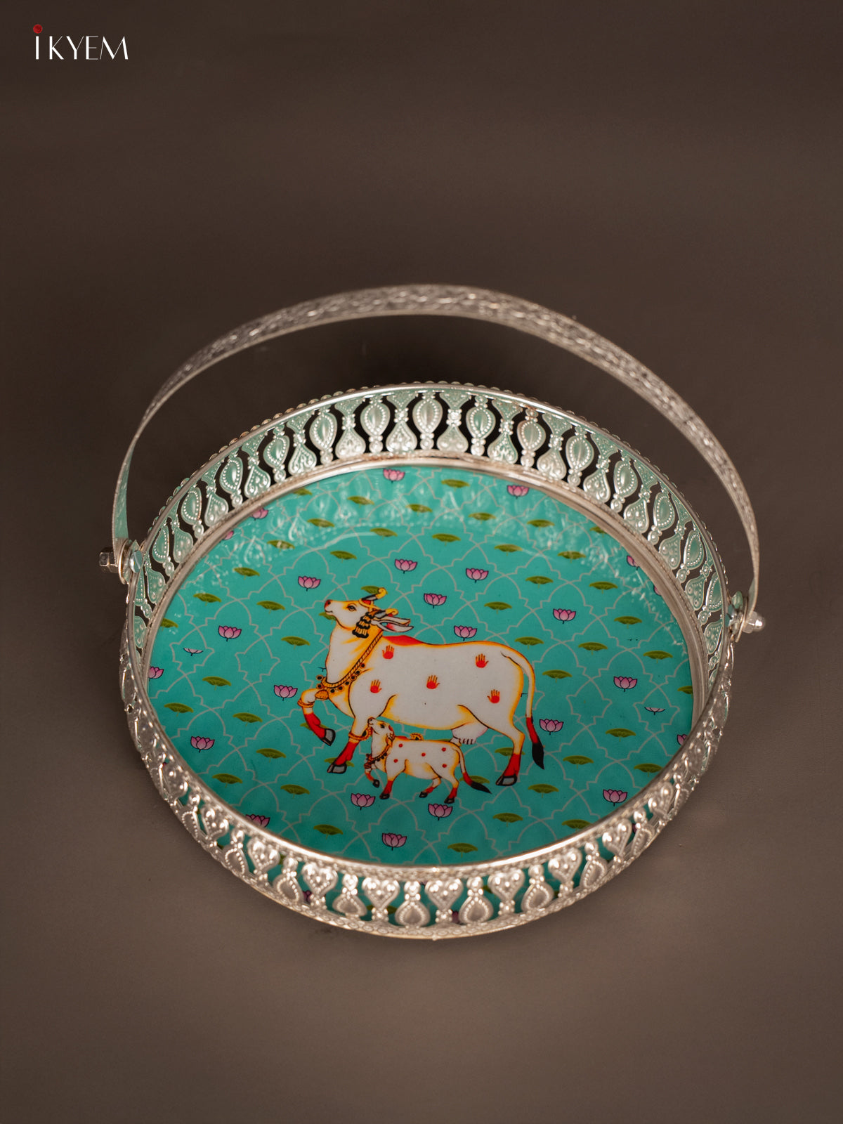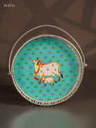 Digital Printed German Silver Tray With Handle - Cow&calf Sky blue