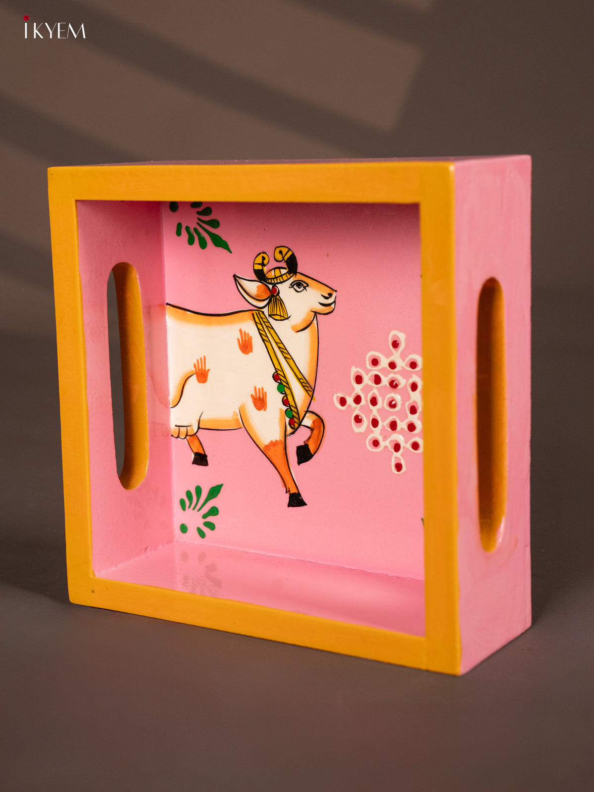 Graceful Pink Hand painted Wooden Tray With Pichwai Cow - KG28132