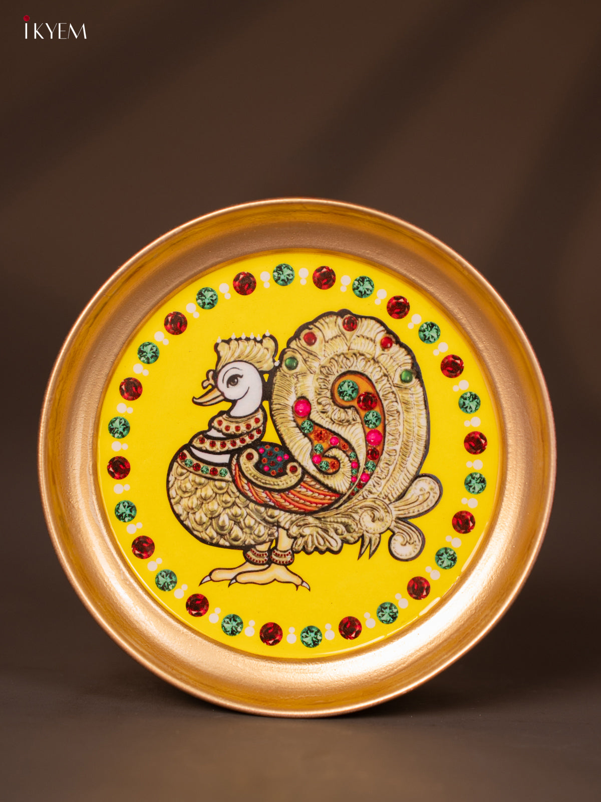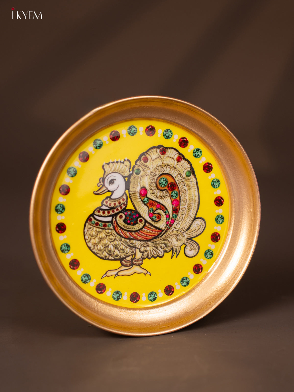 - This 6-inch Annapakshi printed yellow brass plate is an elegant choice for pooja celebrations and traditional return gifts.