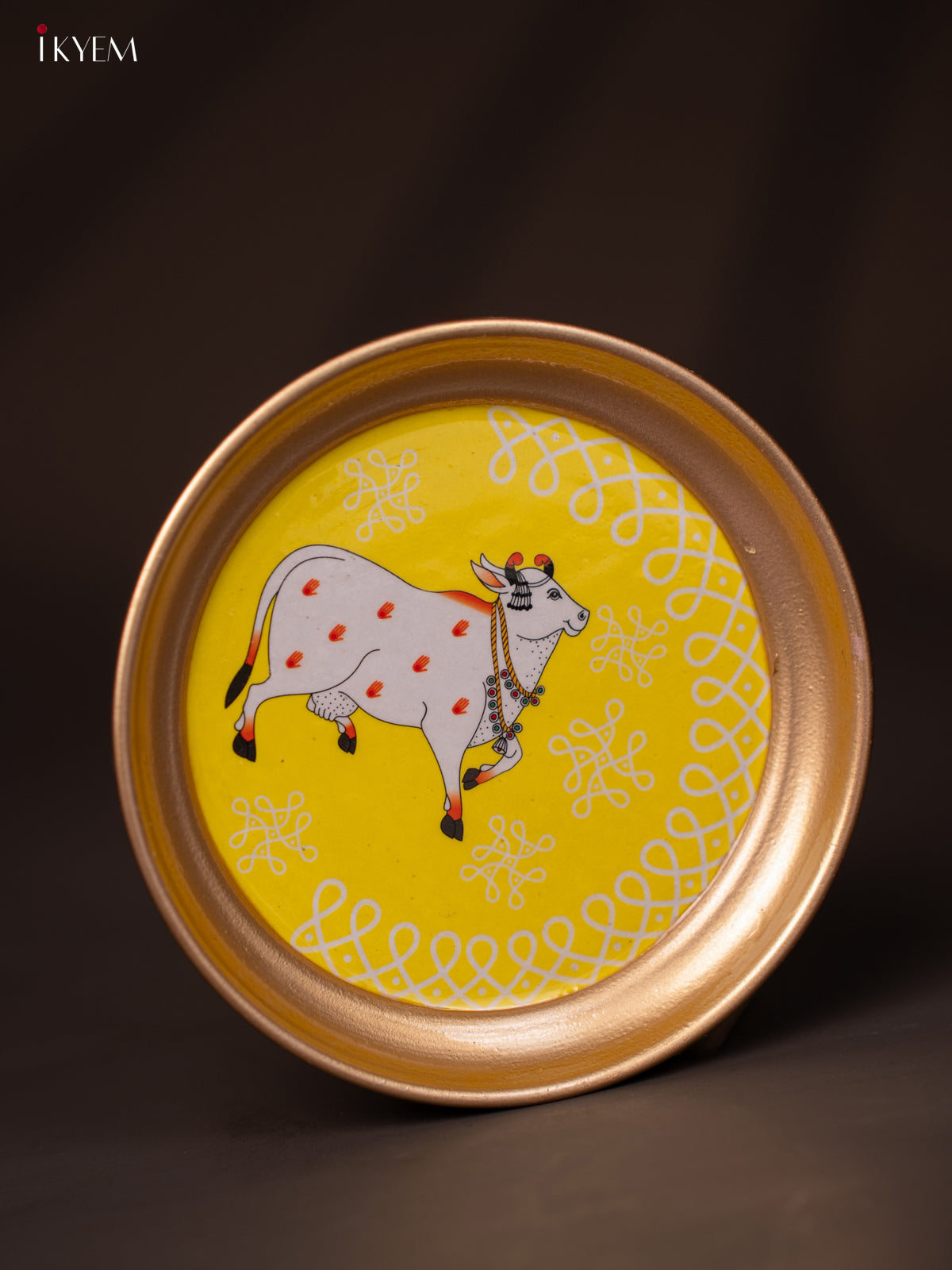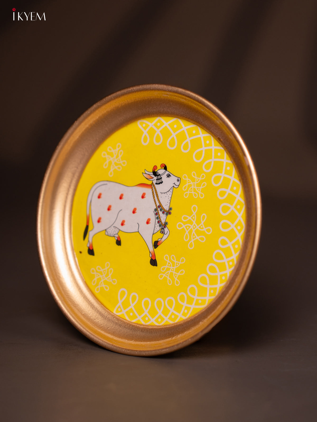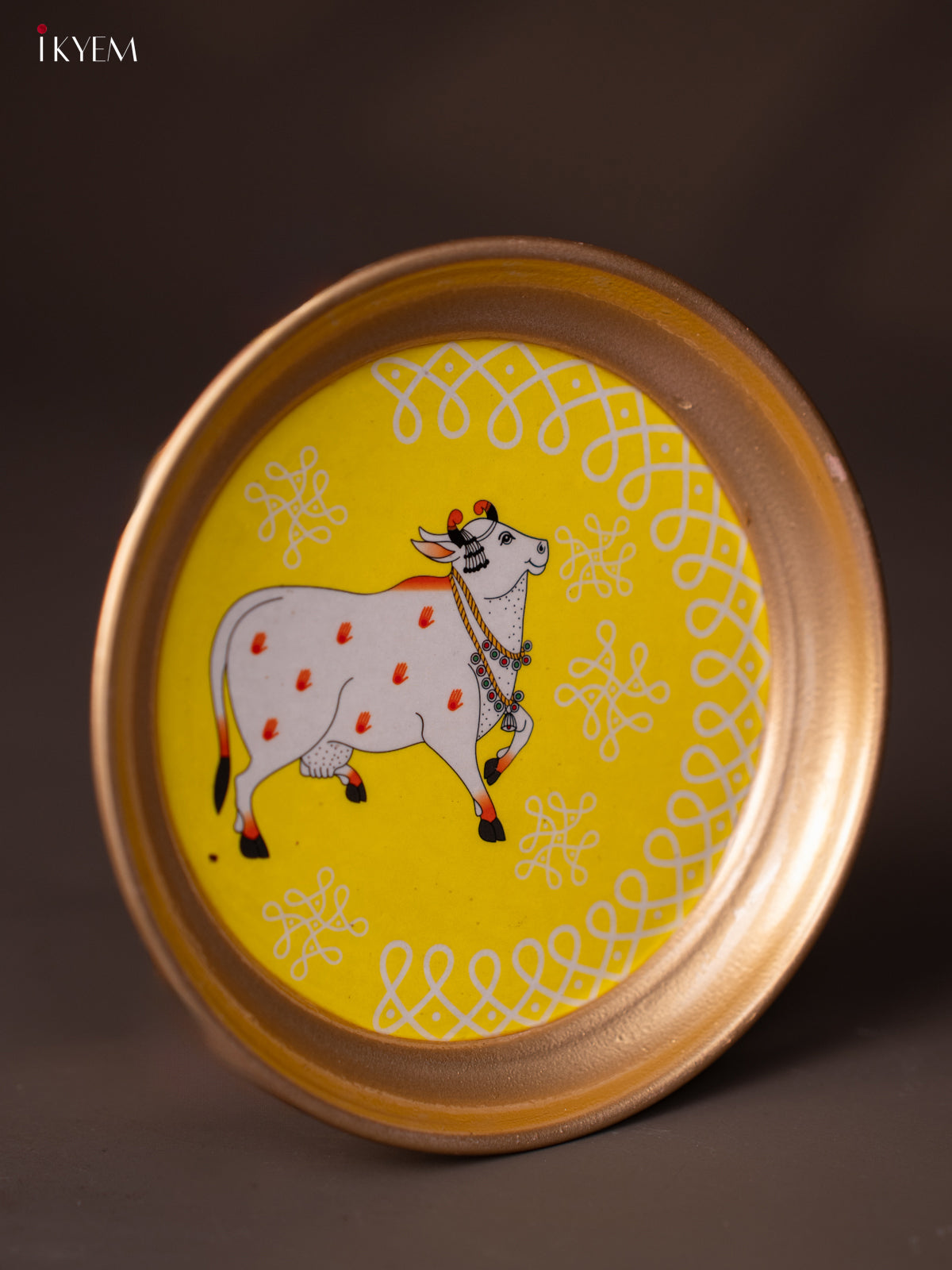 Cow & Kolam Printed Yellow Brass Coated Plate - 6 Inches - KG25150
