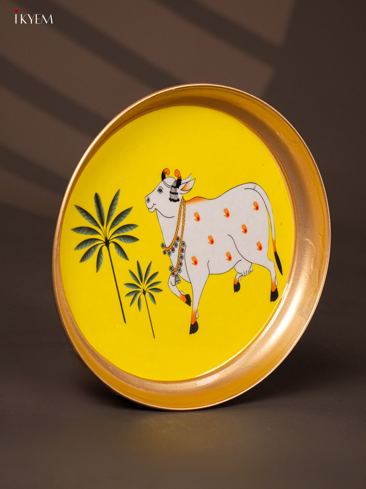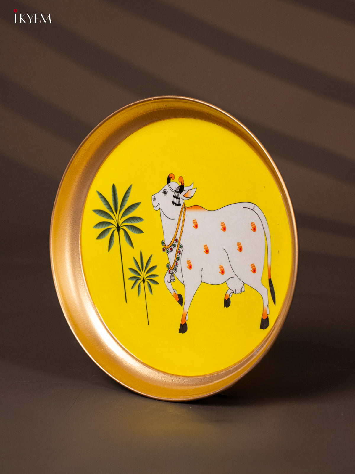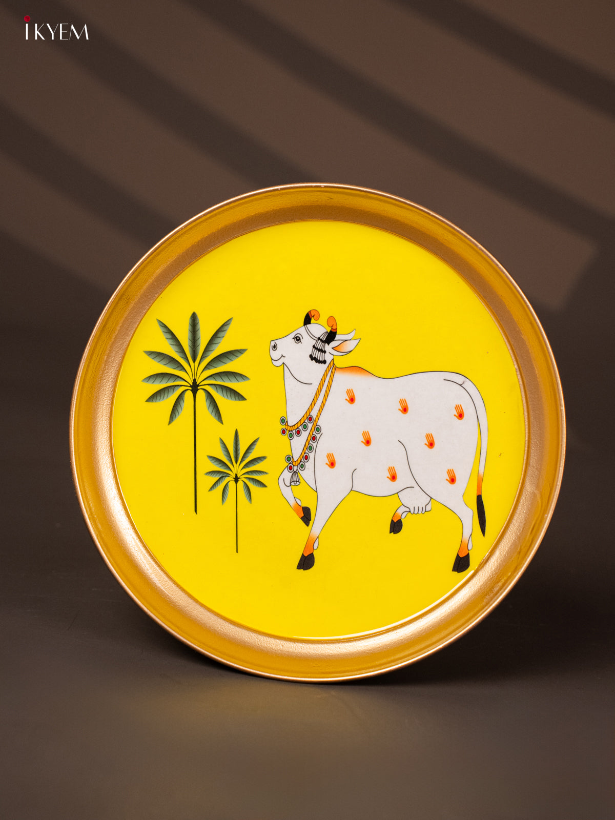 - This 8-inch yellow brass plate, adorned with a traditional cow and tree design, is perfect for pooja decor and festive occasions such as Navaratri and Varamahalakshmi.