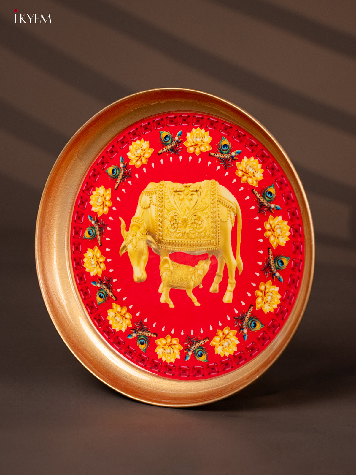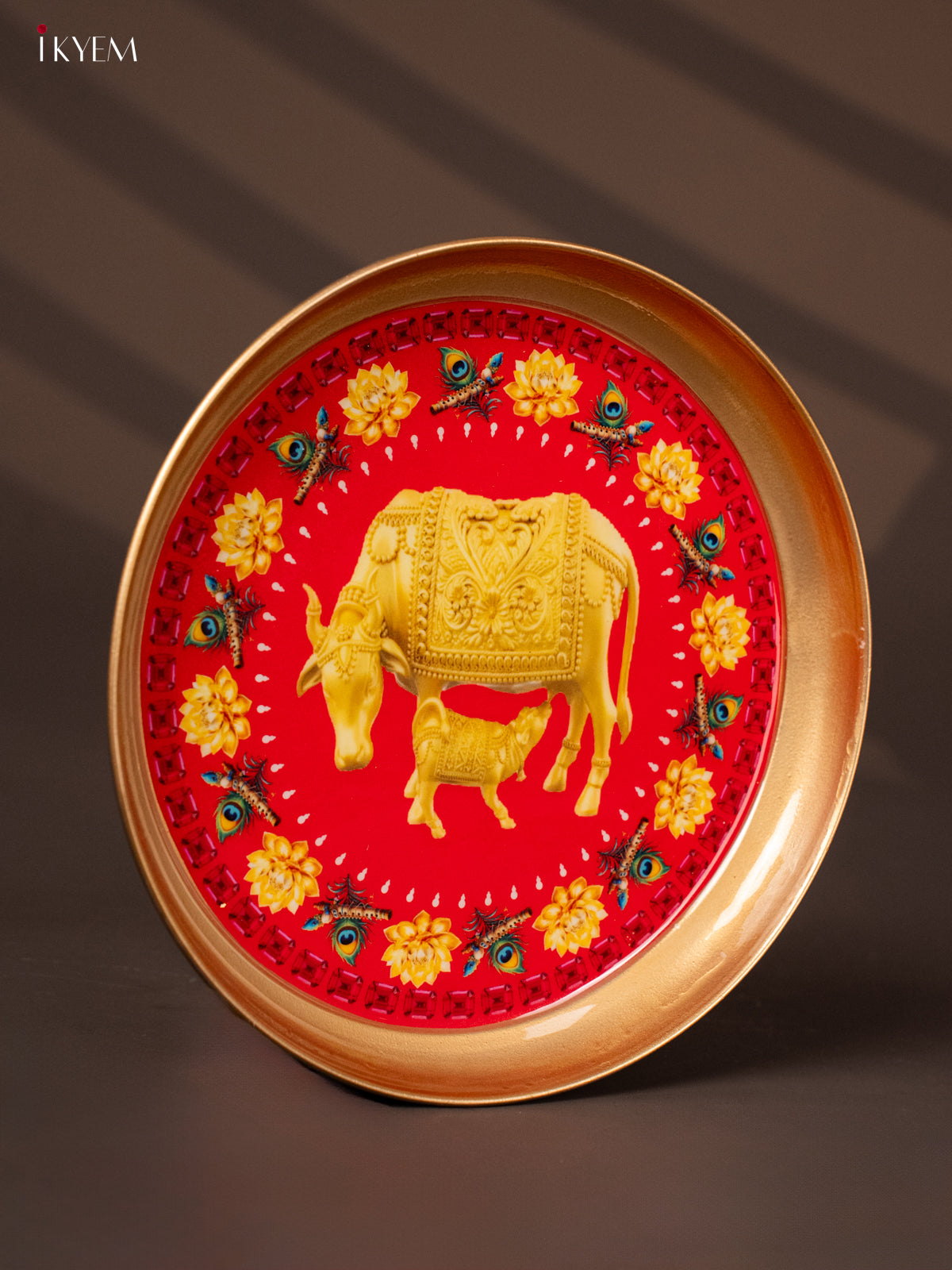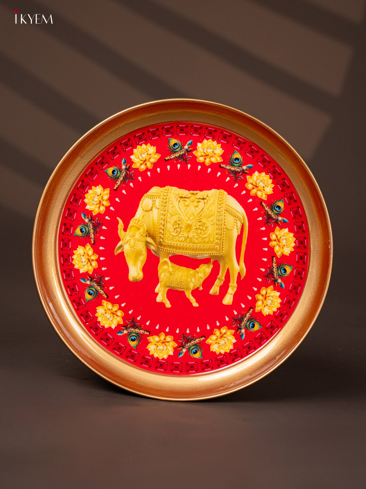 - This 8-inch red brass plate features an elegant cow and calf design with intricate floral prints, making it ideal for pooja celebrations and traditional ceremonies like Varamahalakshmi and Navaratri.