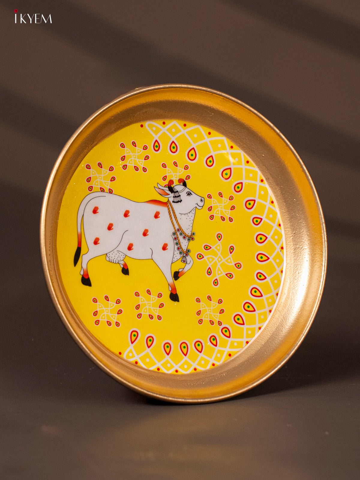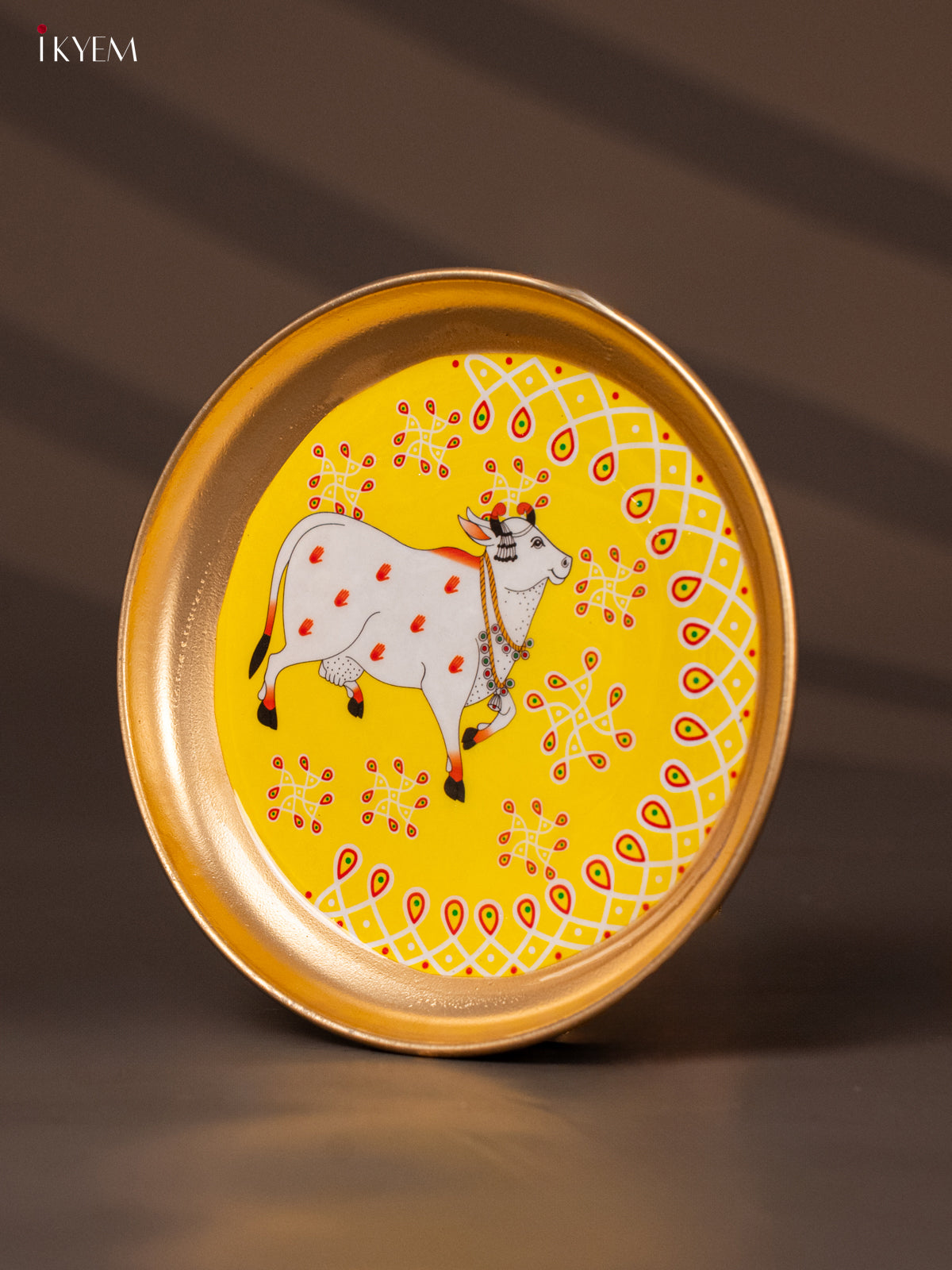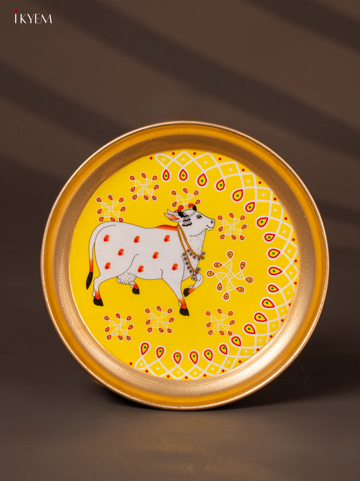 Cow & Red Kolam Printed Yellow Brass Coated Plate - 6 Inches - KG29114