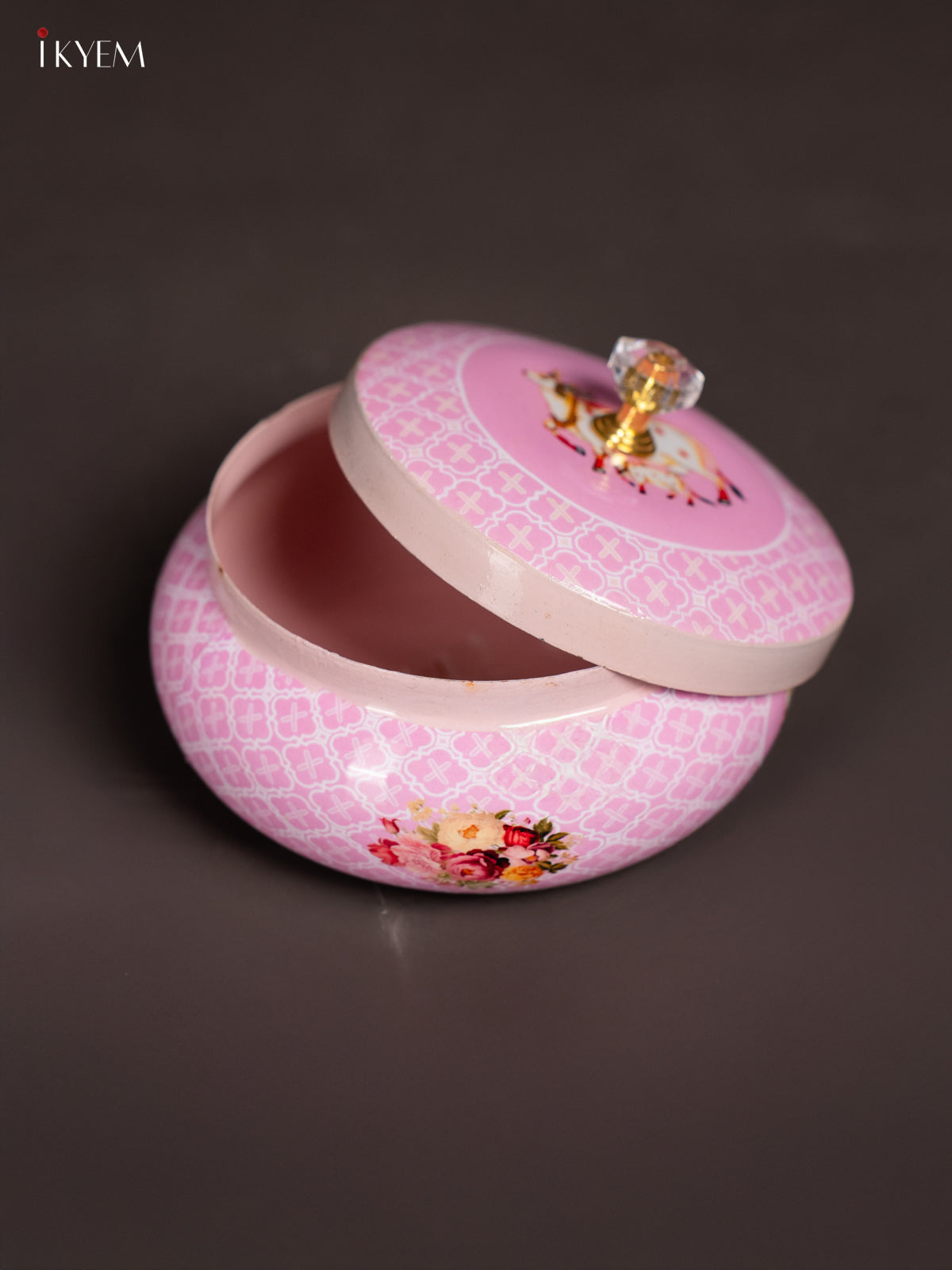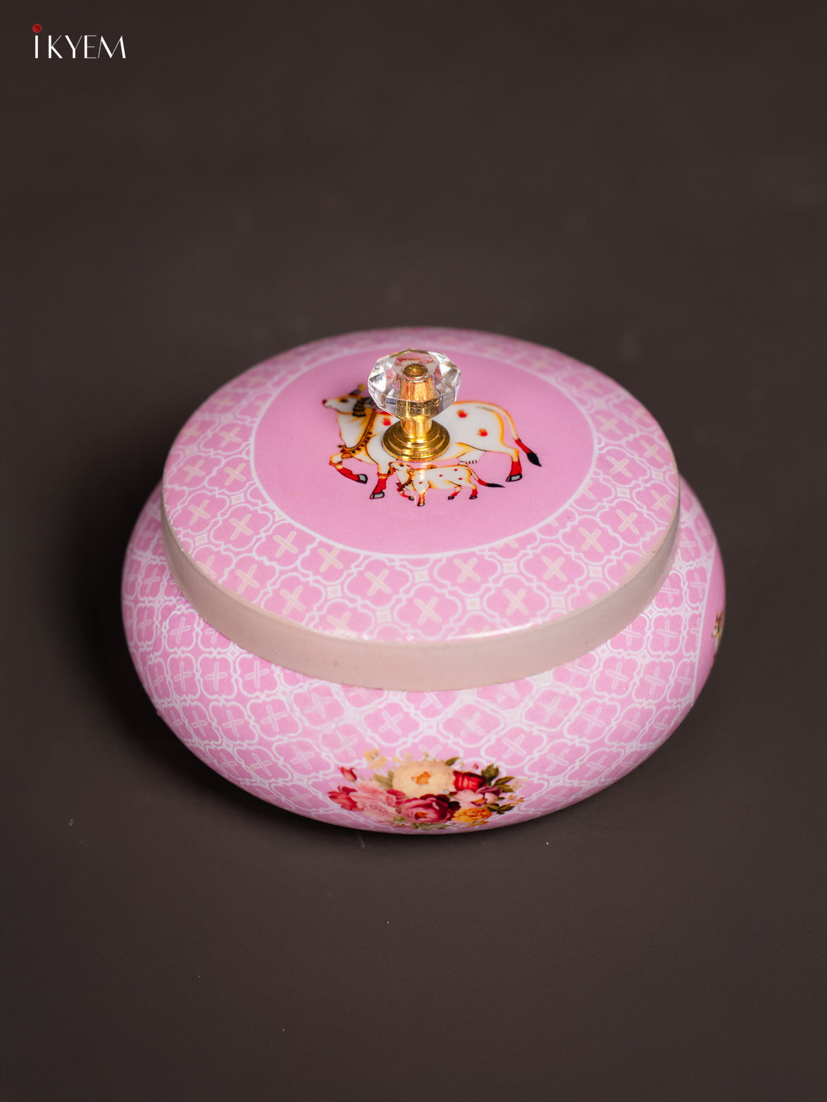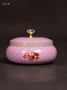 Introduce a splash of cheerful charm to your kitchen with this Metal Pichwai Nut Jar in Light Pink, beautifully adorned with a cow & calf design. Measuring 3 inches in height and weighing 230 g, the jar is perfectly sized to store dry fruits, nuts, or snacks with elegance.