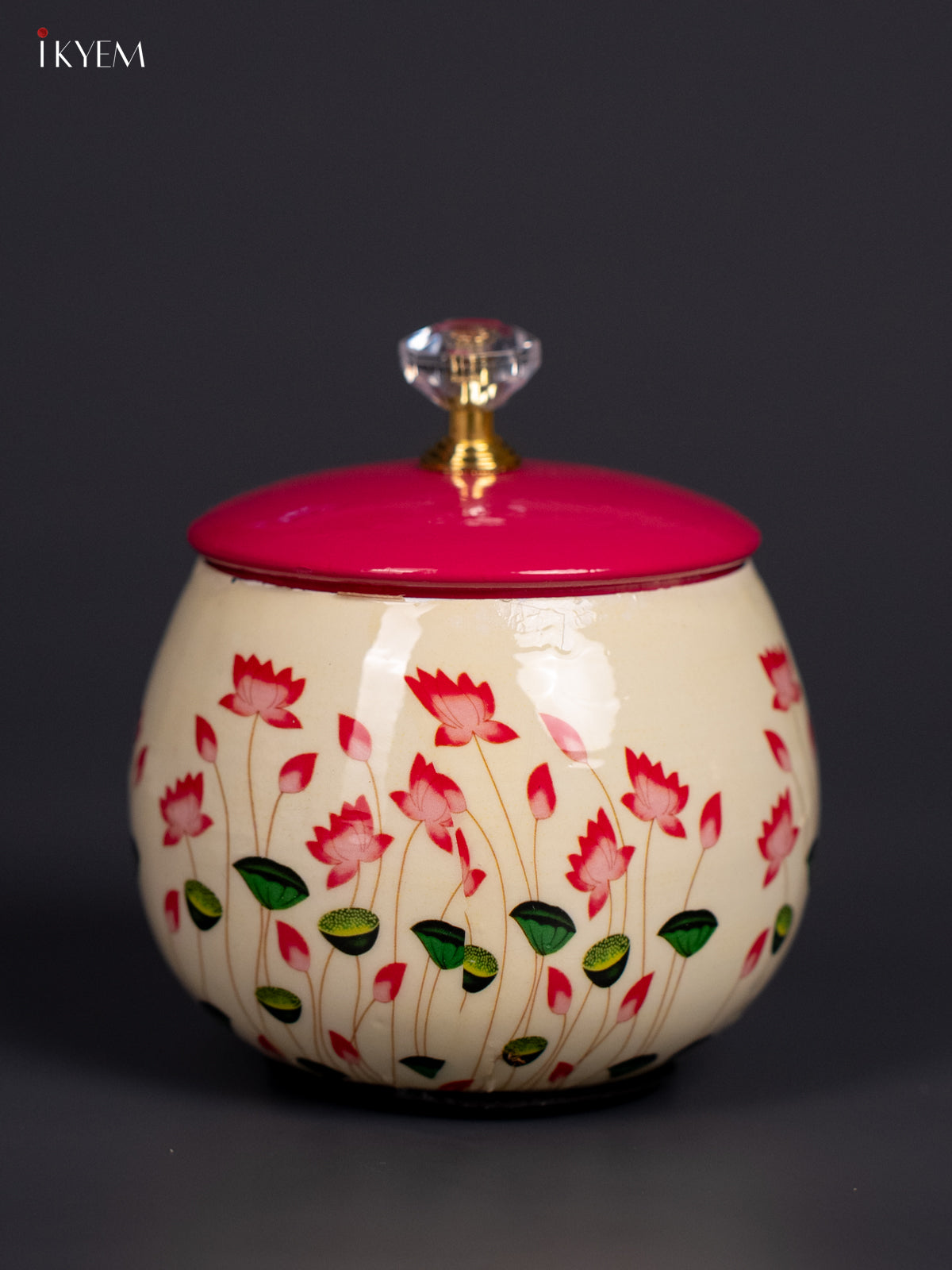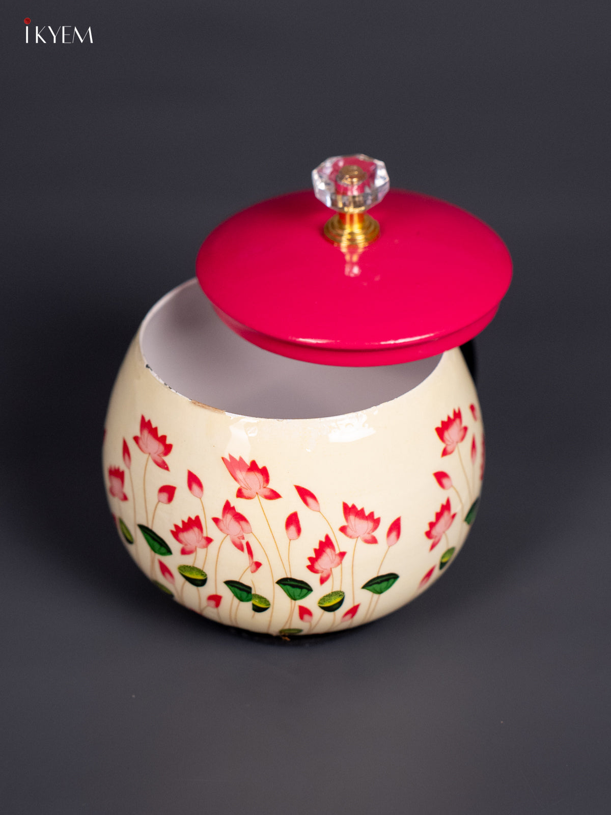 Pichwai Floral Digital Printed Metal Jar - 4 Inch - Off White - KJ18127