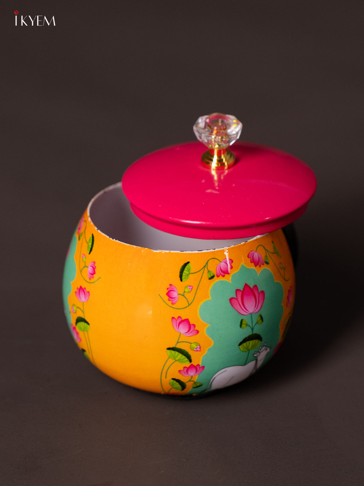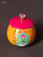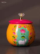 Store your dry fruits or snacks in this 4‑inch orange digital‑printed metal jar. Measuring 4″ L × 4″ W × 4″ H and weighing 165 g, the compact jar is lightweight yet sturdy, ideal for kitchen use, festive gifting or storing nuts and sweets. The traditional cow-themed print adds a cultural charm, making it a lovely accent for your pooja area or dining shelf.