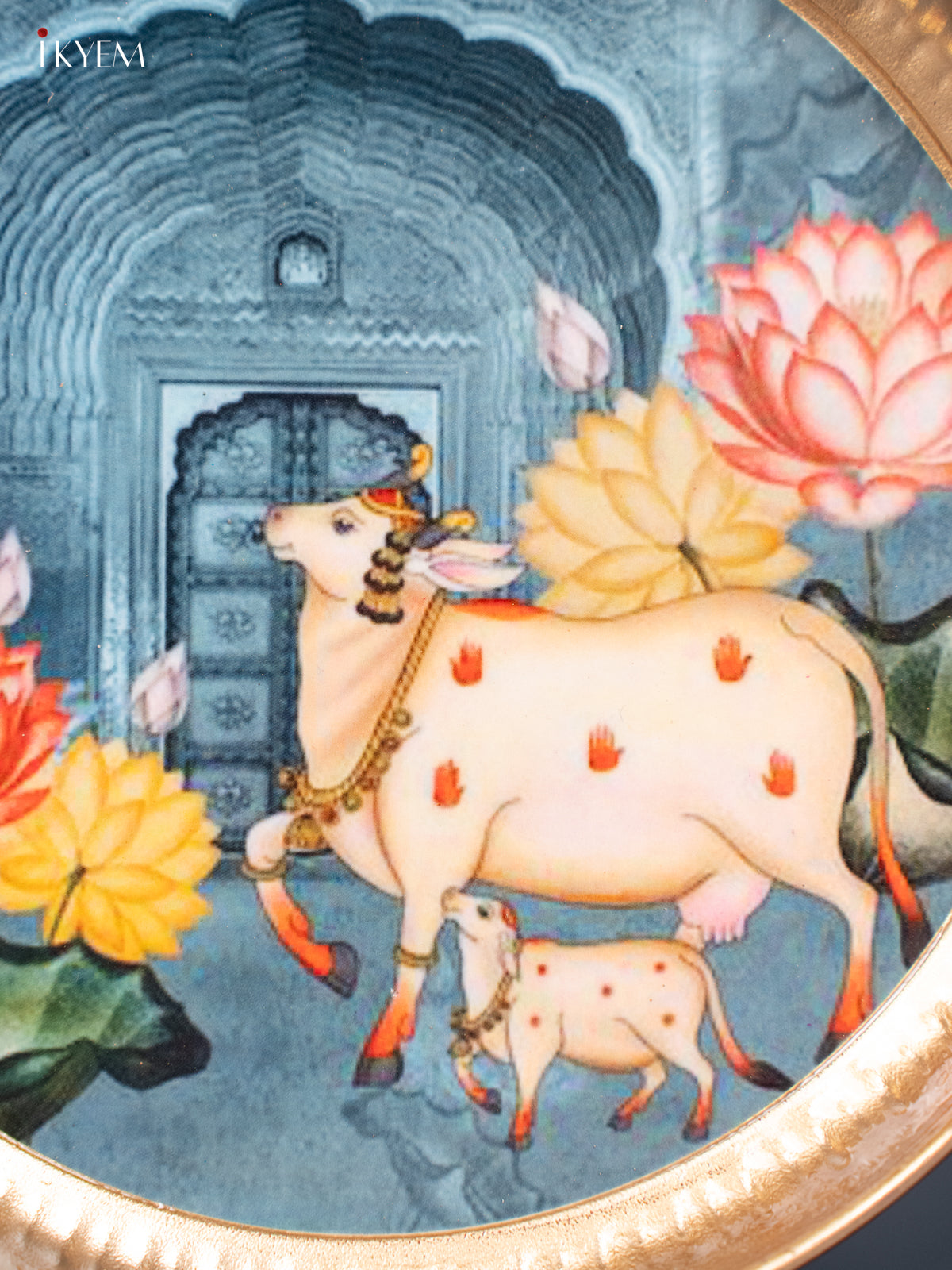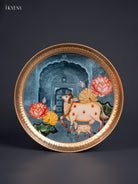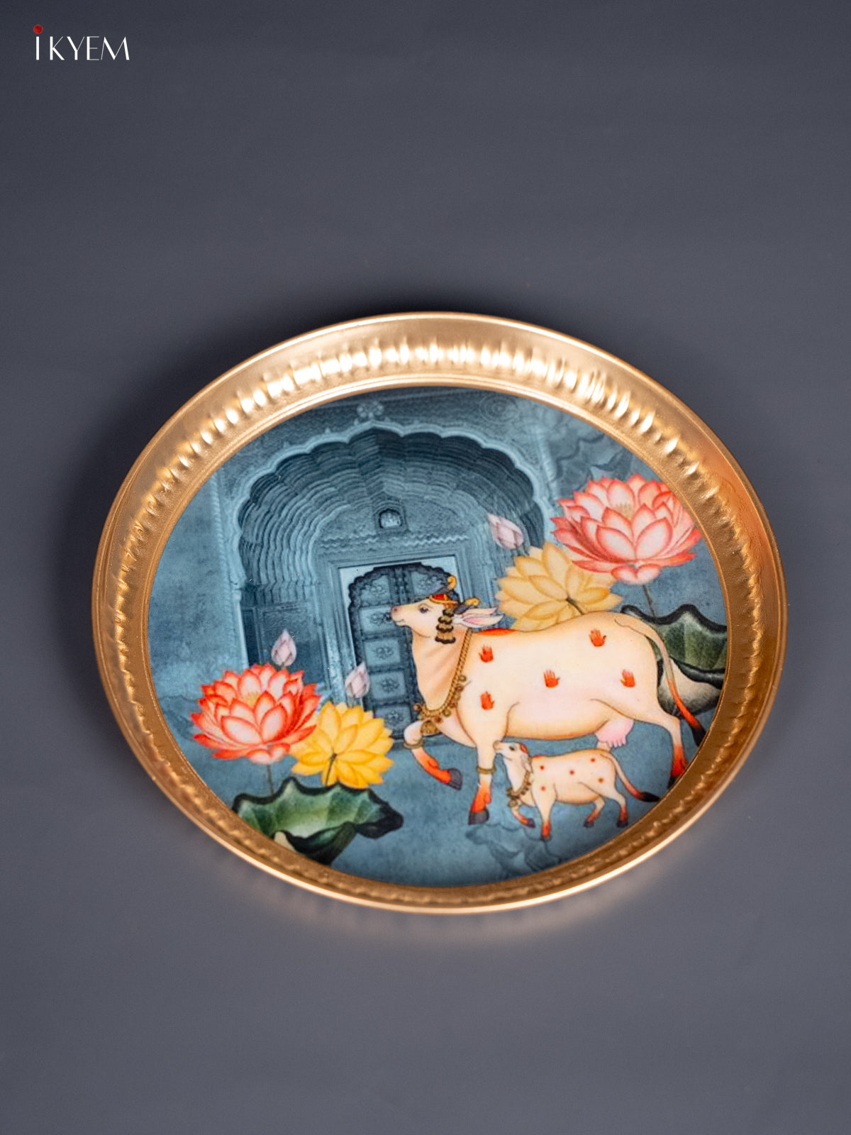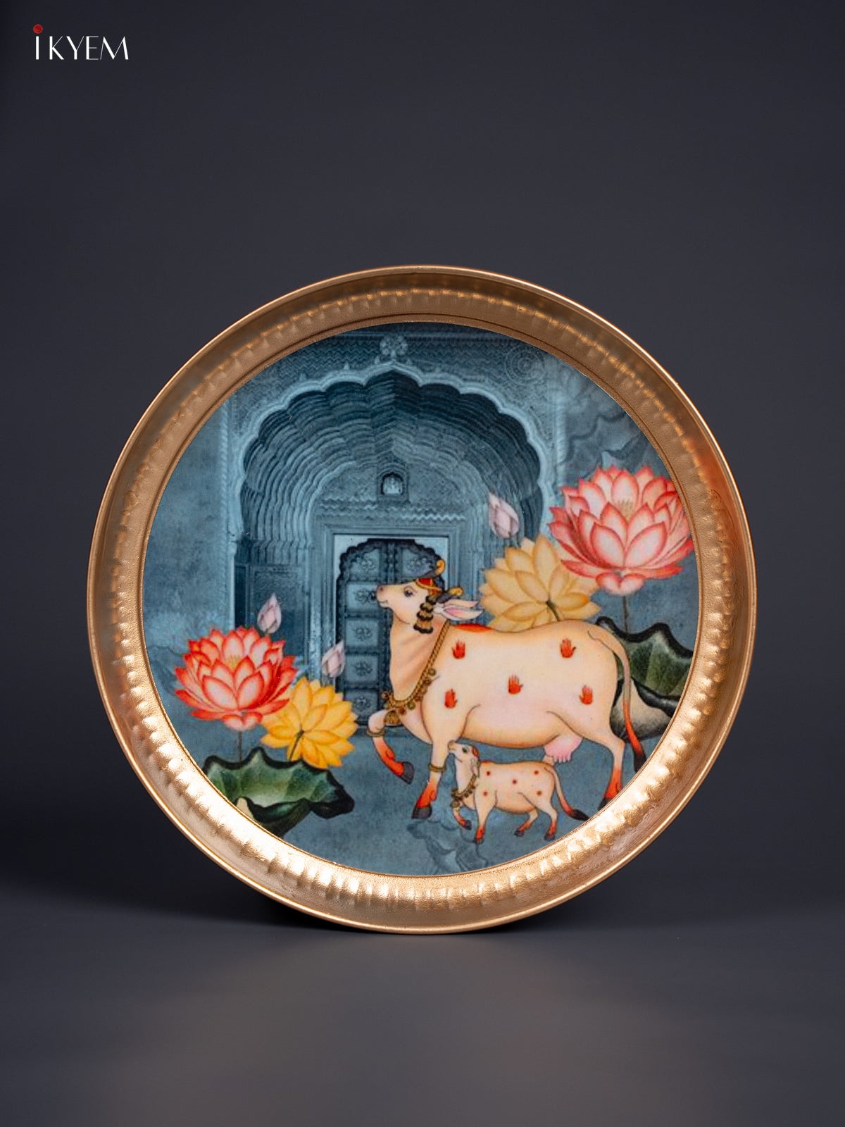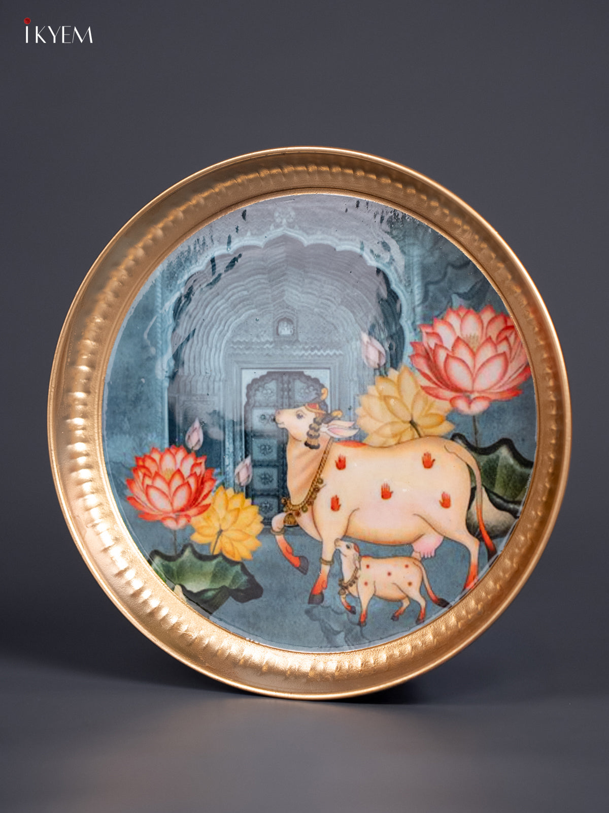 - Enhance your pooja space with this aesthetically printed metal plate featuring intricate pichwai designs in vibrant tones.