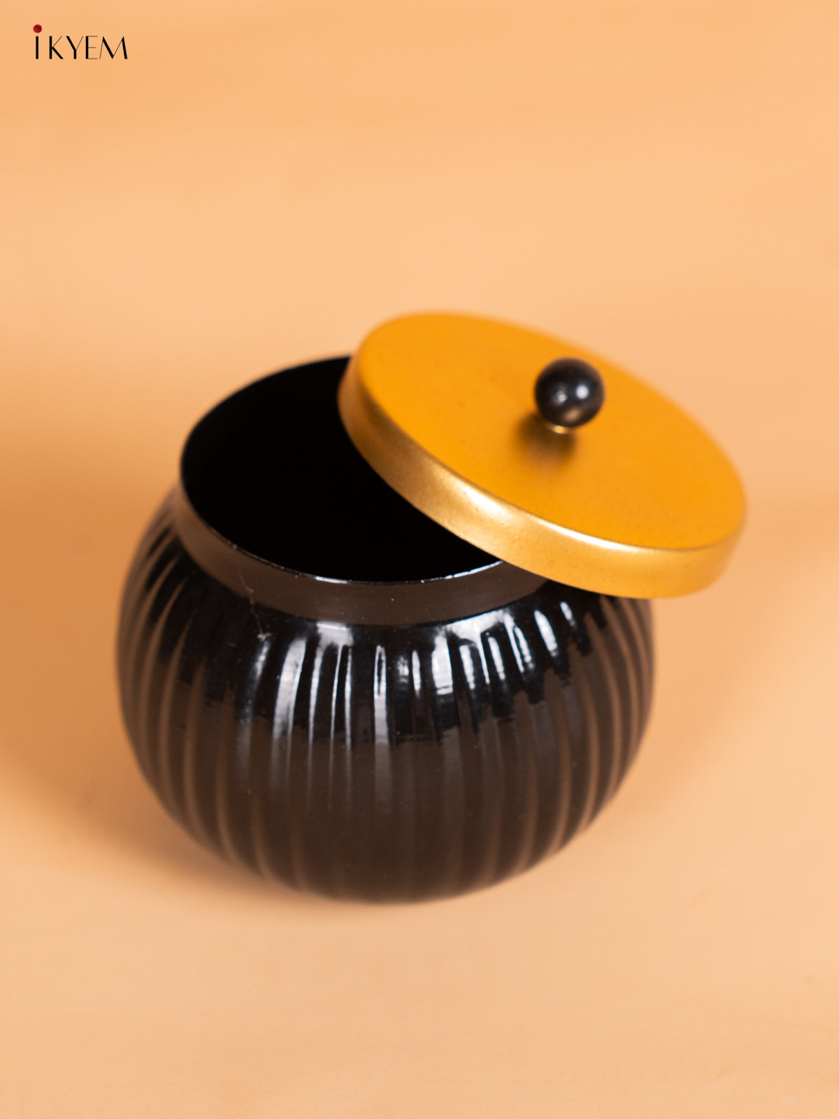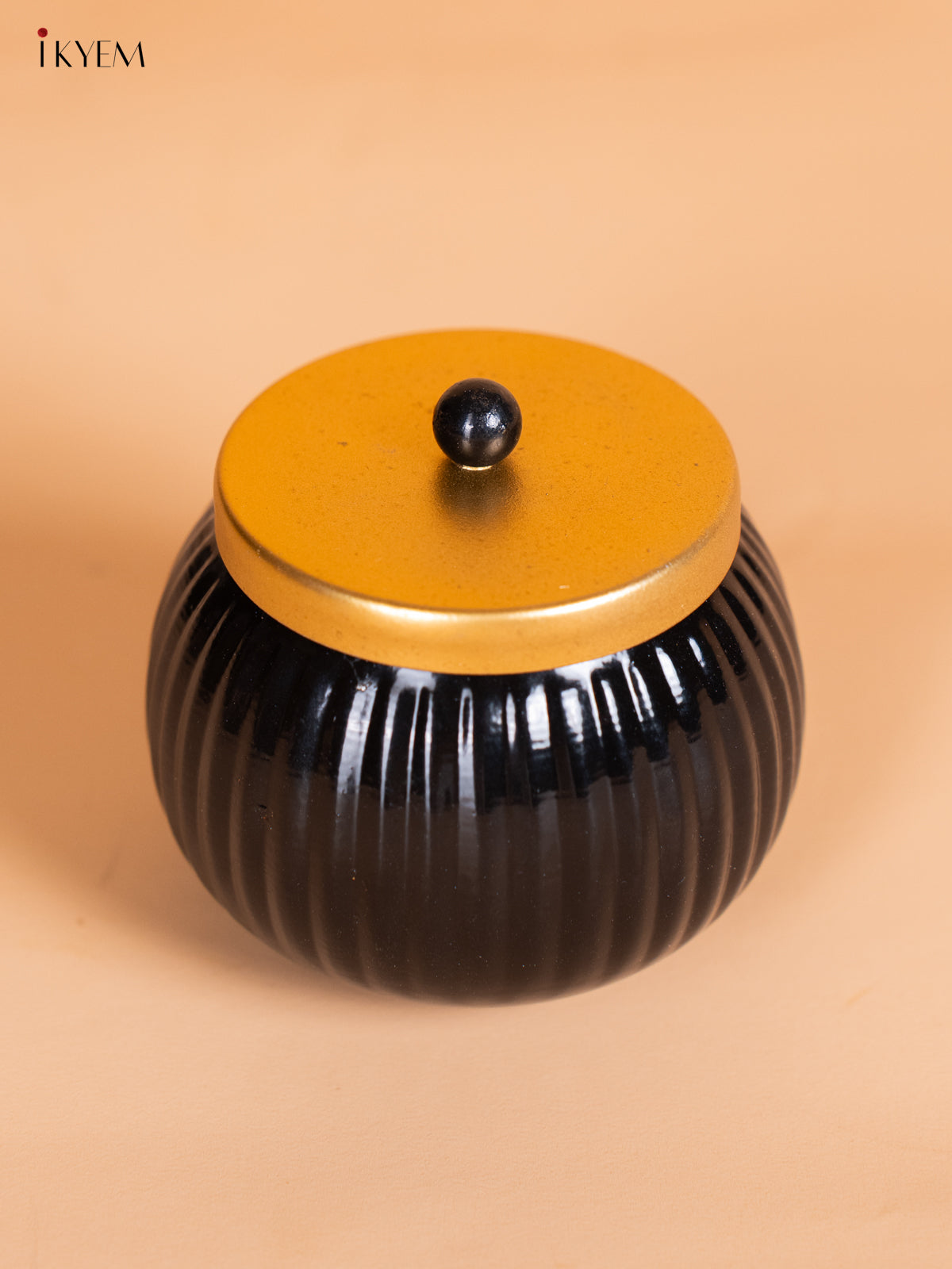 - Featuring a stunning sleek black body and a gold ribbed lid with a decorative knob.