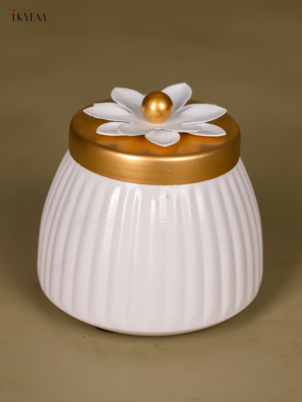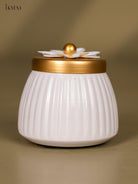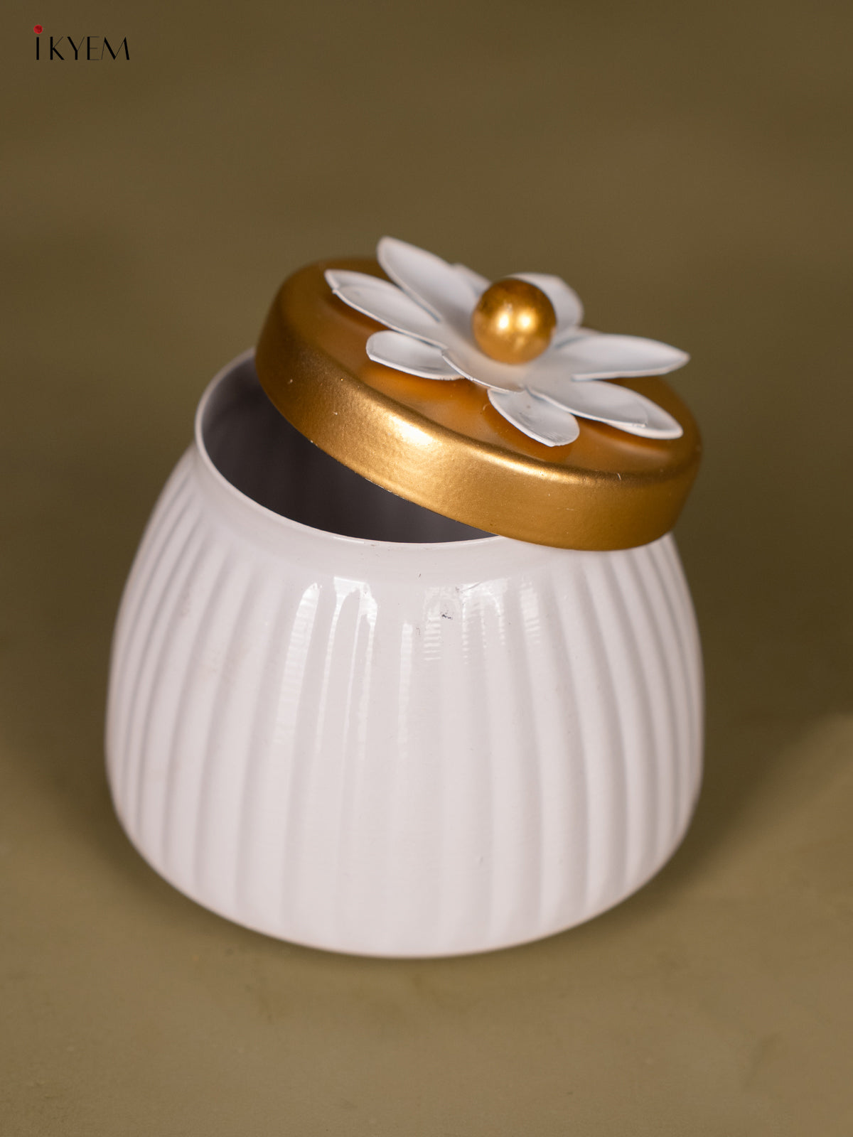 - Featuring a beautifully ribbed white body and a premium metallic gold lid, this jar stands out with its stunning floral topper crafted in glossy white and gold accents.