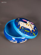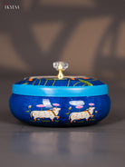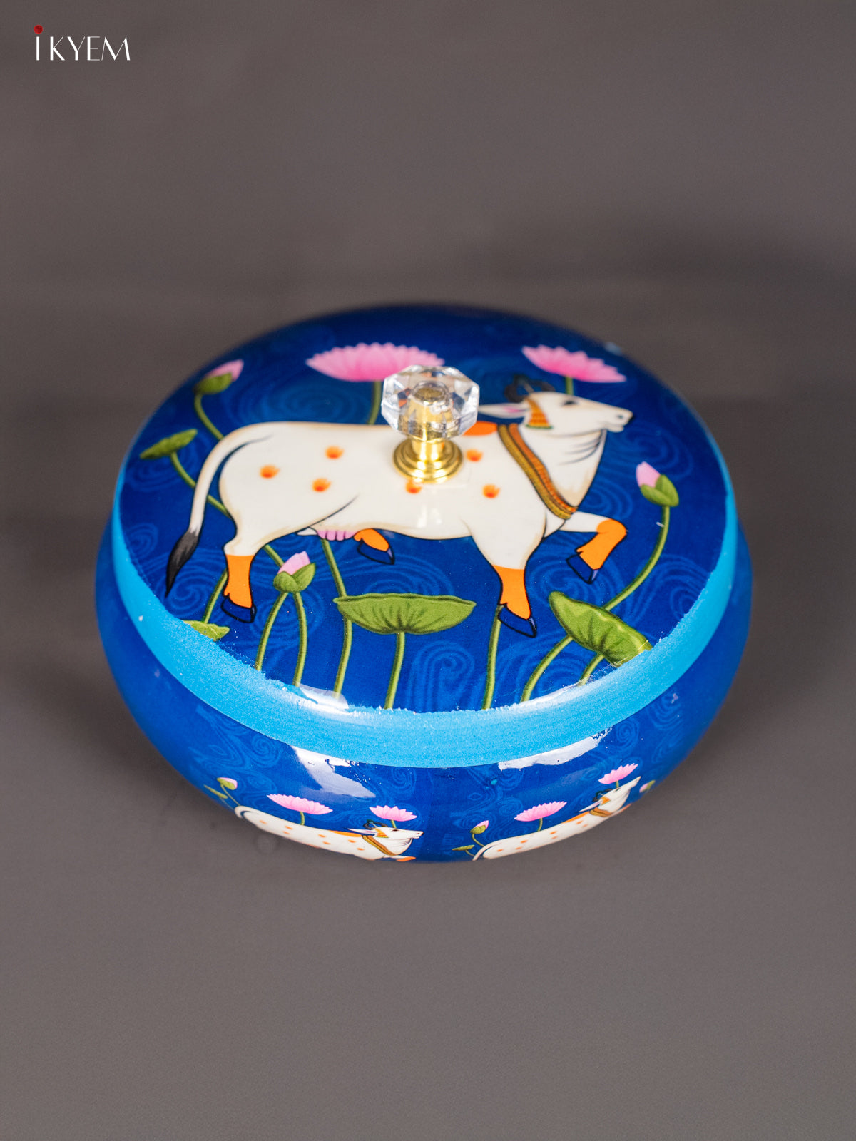 - Bring a vibrant touch of artistry to your home with this exquisite blue hand-painted nuts jar, featuring a beautifully detailed cow motif surrounded by lotus flowers.