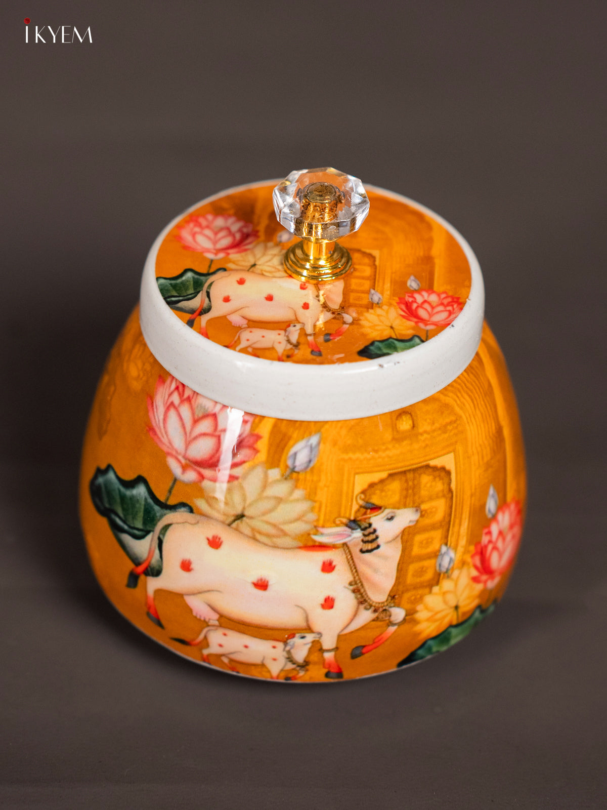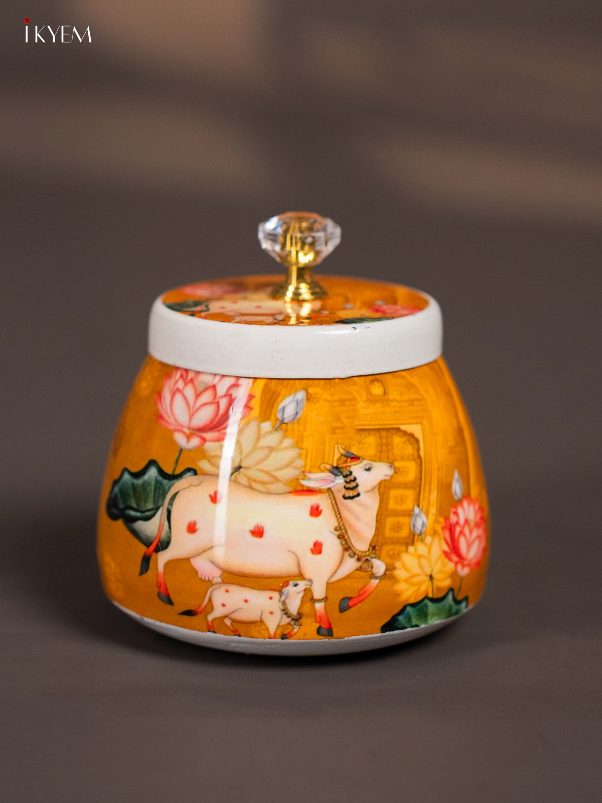 • Featuring vibrant artwork of a cow and calf surrounded by lotus motifs, it adds a touch of cultural charm to any space.This beautifully crafted 4-inch nuts jar is designed to bring a blend of tradition and elegance to your home.
