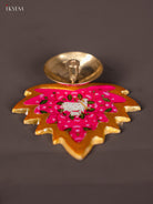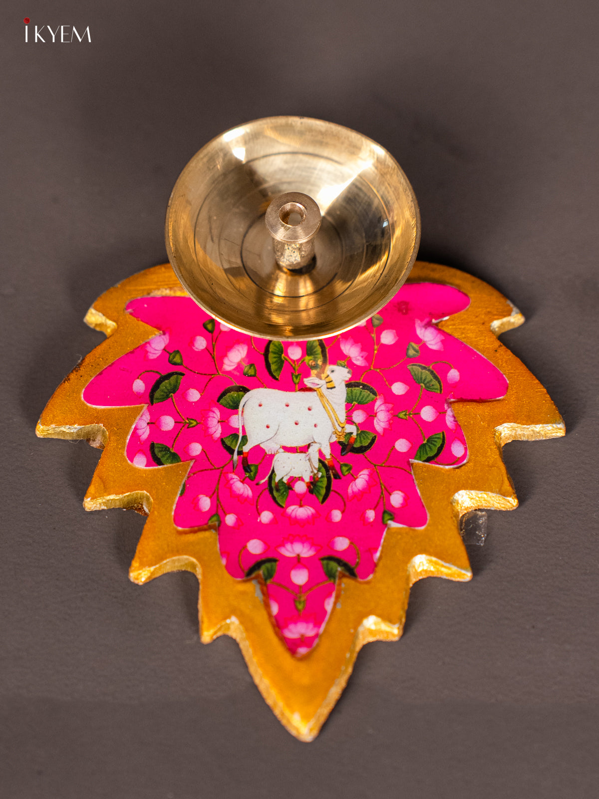 Cow & Calf Printed Leaf-Shaped Diya Holder - Pink - KK06126