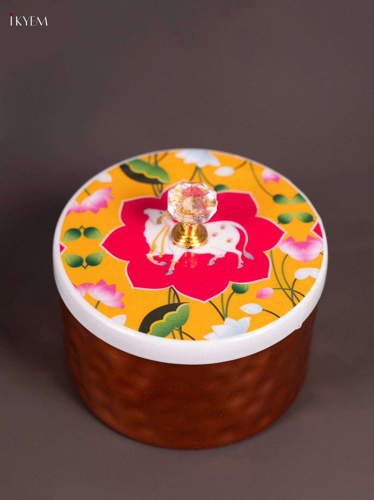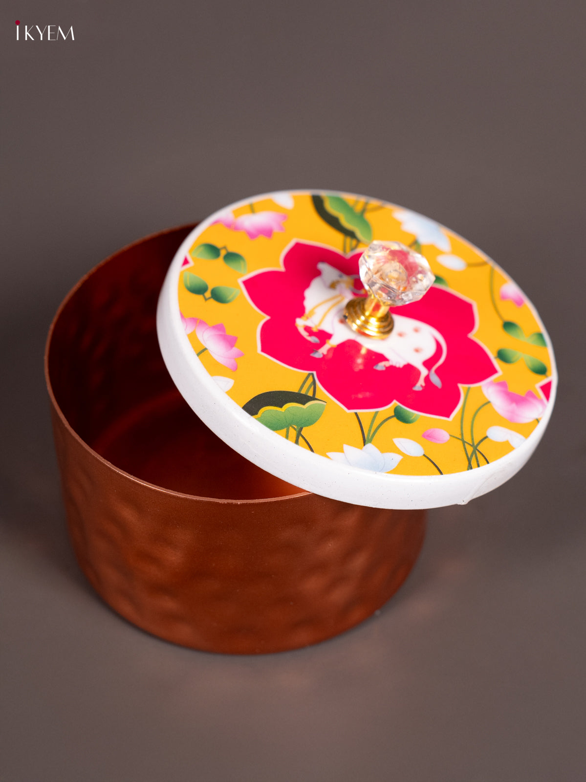 Shop the Cow Digital Printed Lid Metal Copper Nuts Box – Yellow, a charming copper‑finish storage box perfect for nuts, dry snacks, and festive gifting. Compact dimensions 4″ Length × 4″ Breadth × 3.2″ Height and lightweight 196 g make it ideal for everyday use and gifting occasions.
