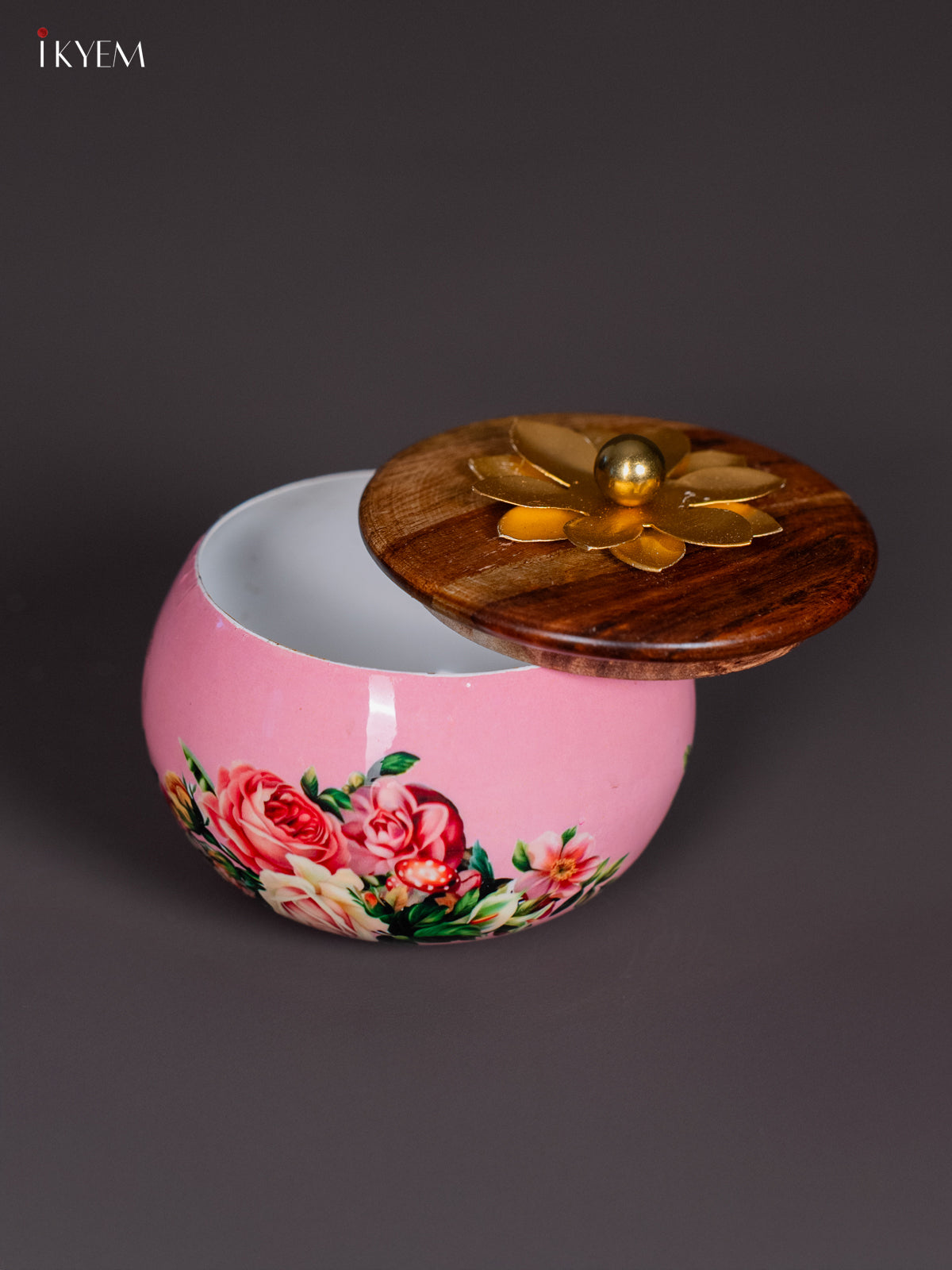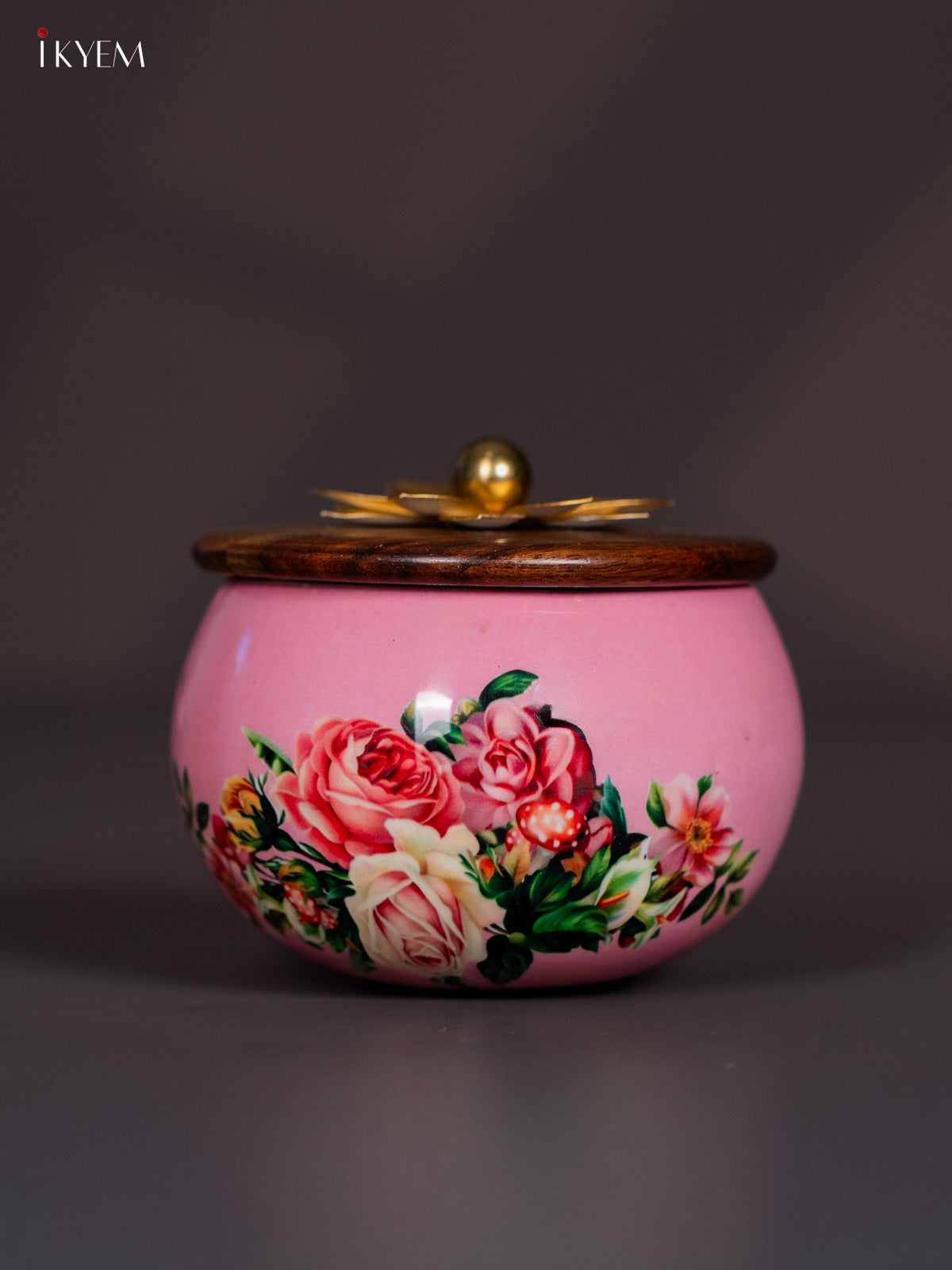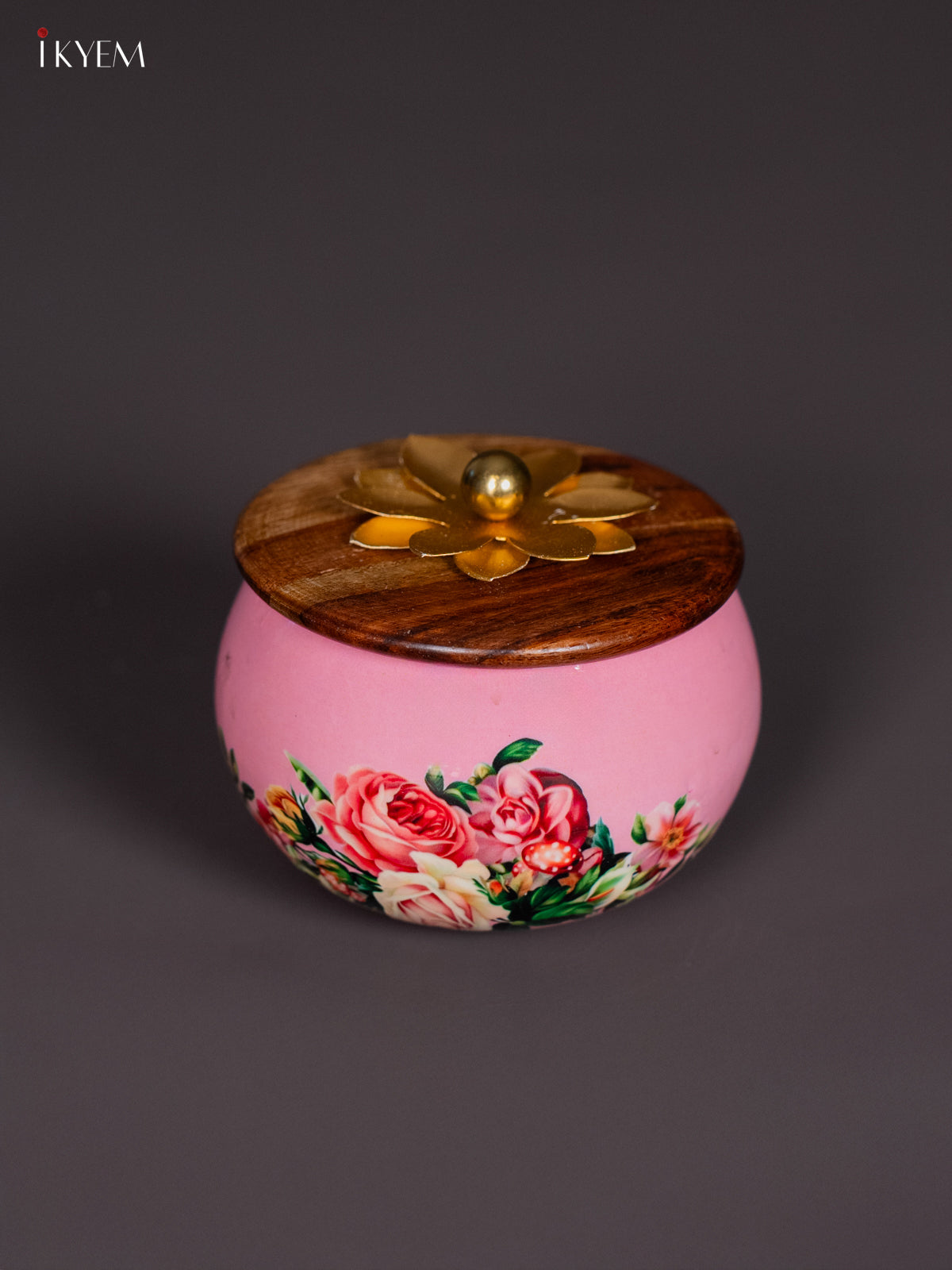 Bring home elegance with this exquisite metal jar featuring a soft pink floral digital print and a natural wooden lid that ensures freshness.