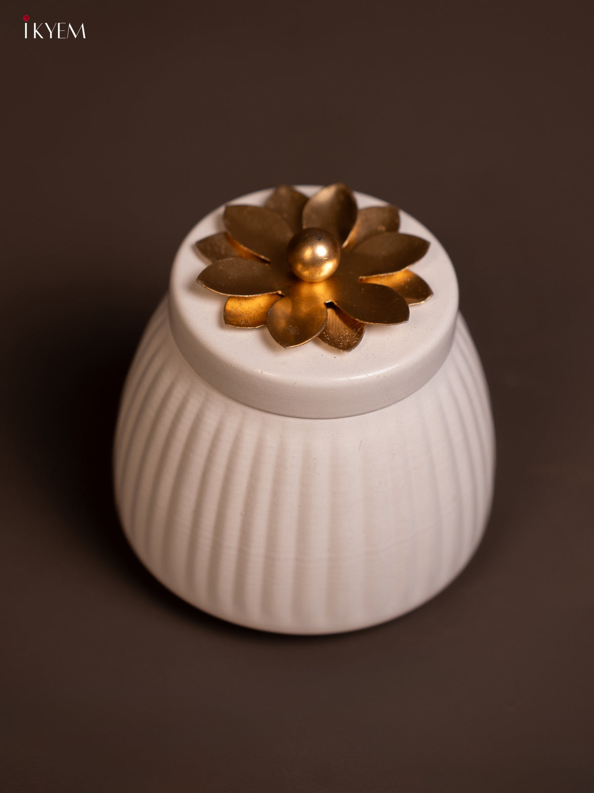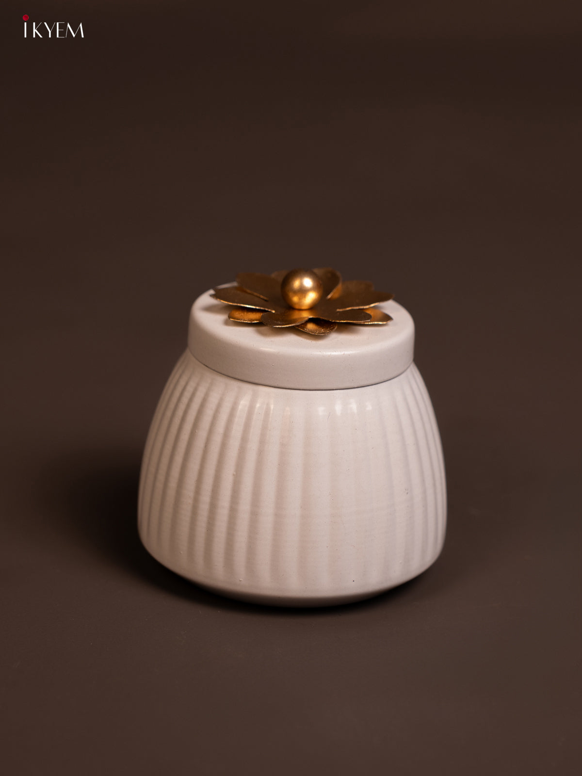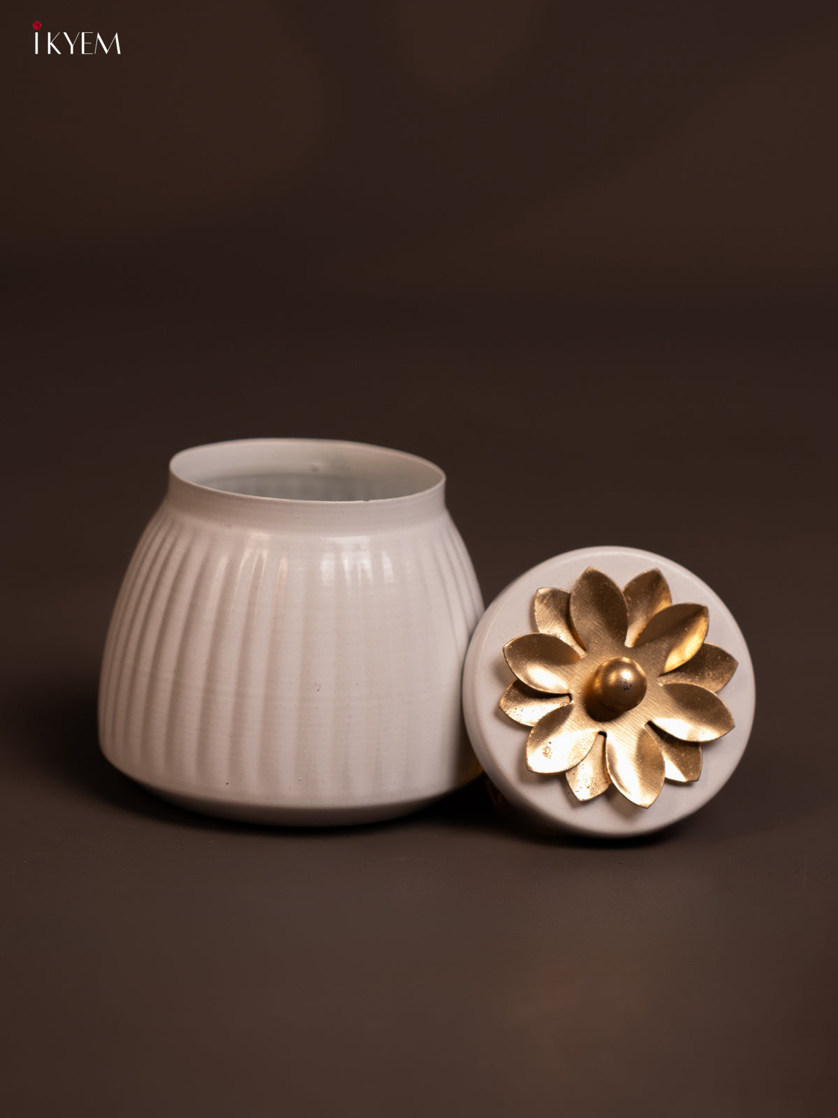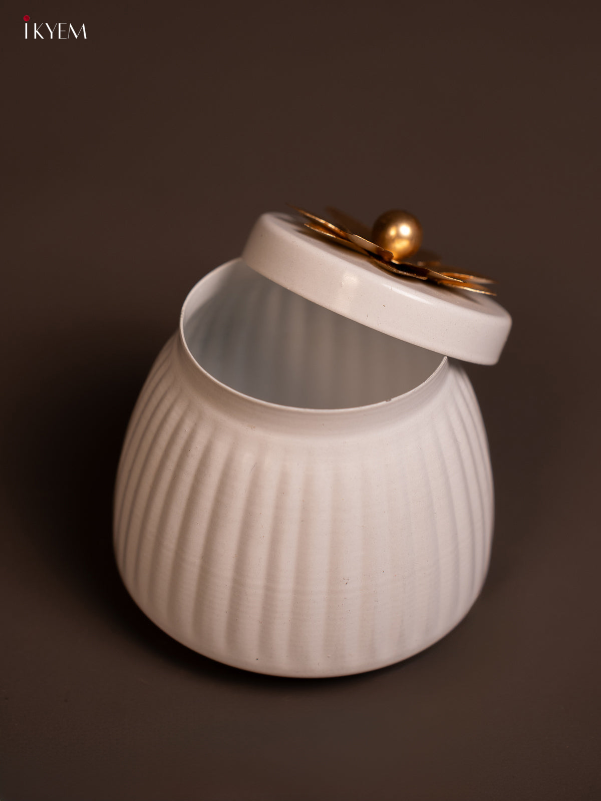 • Elegant metal dry fruit jar in pristine white with decorative brass floral top.