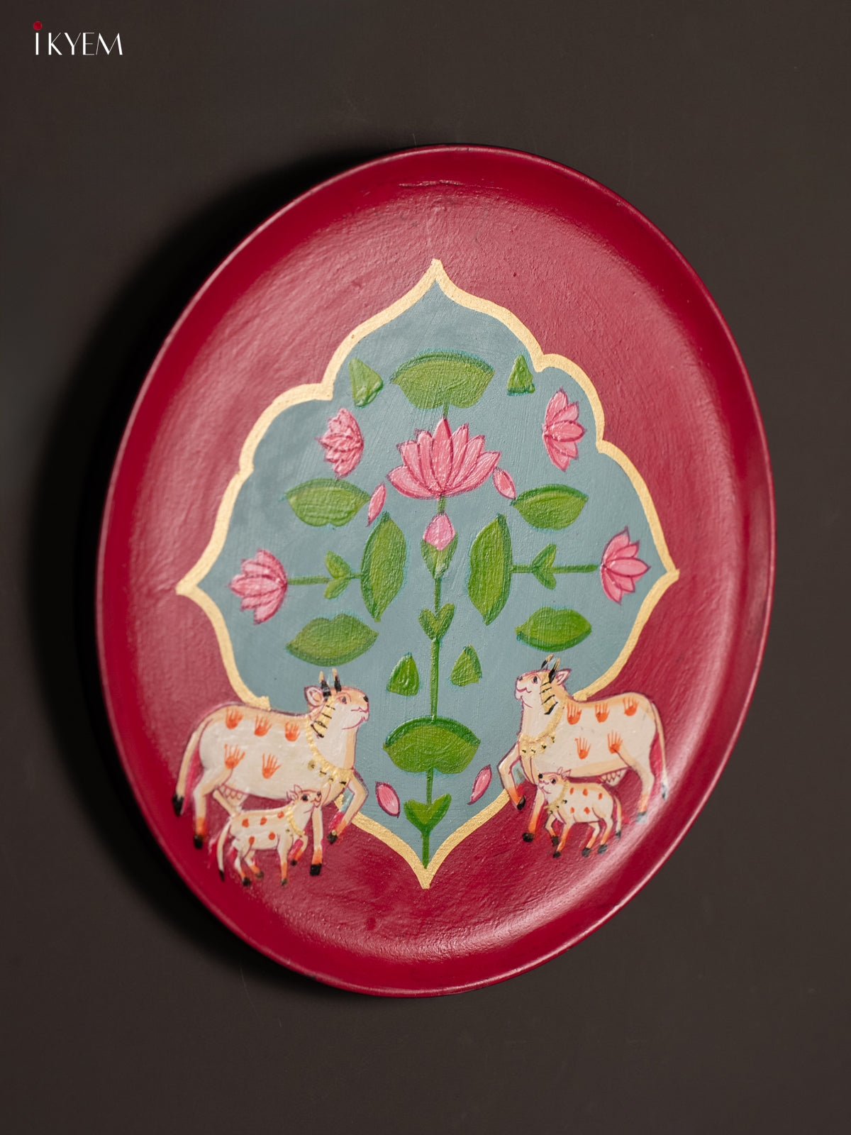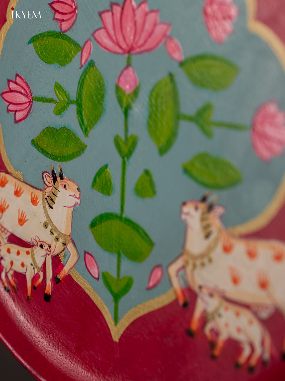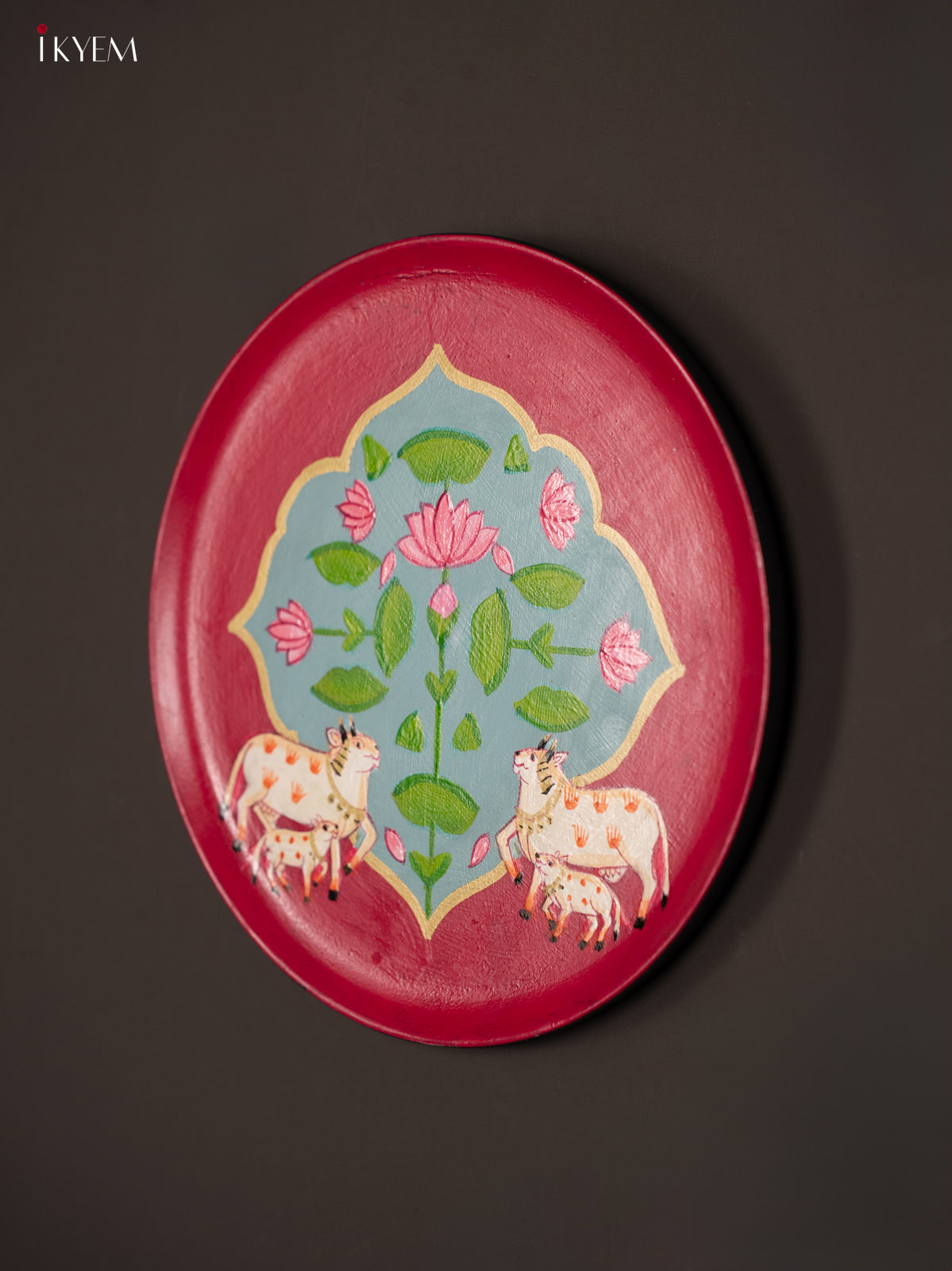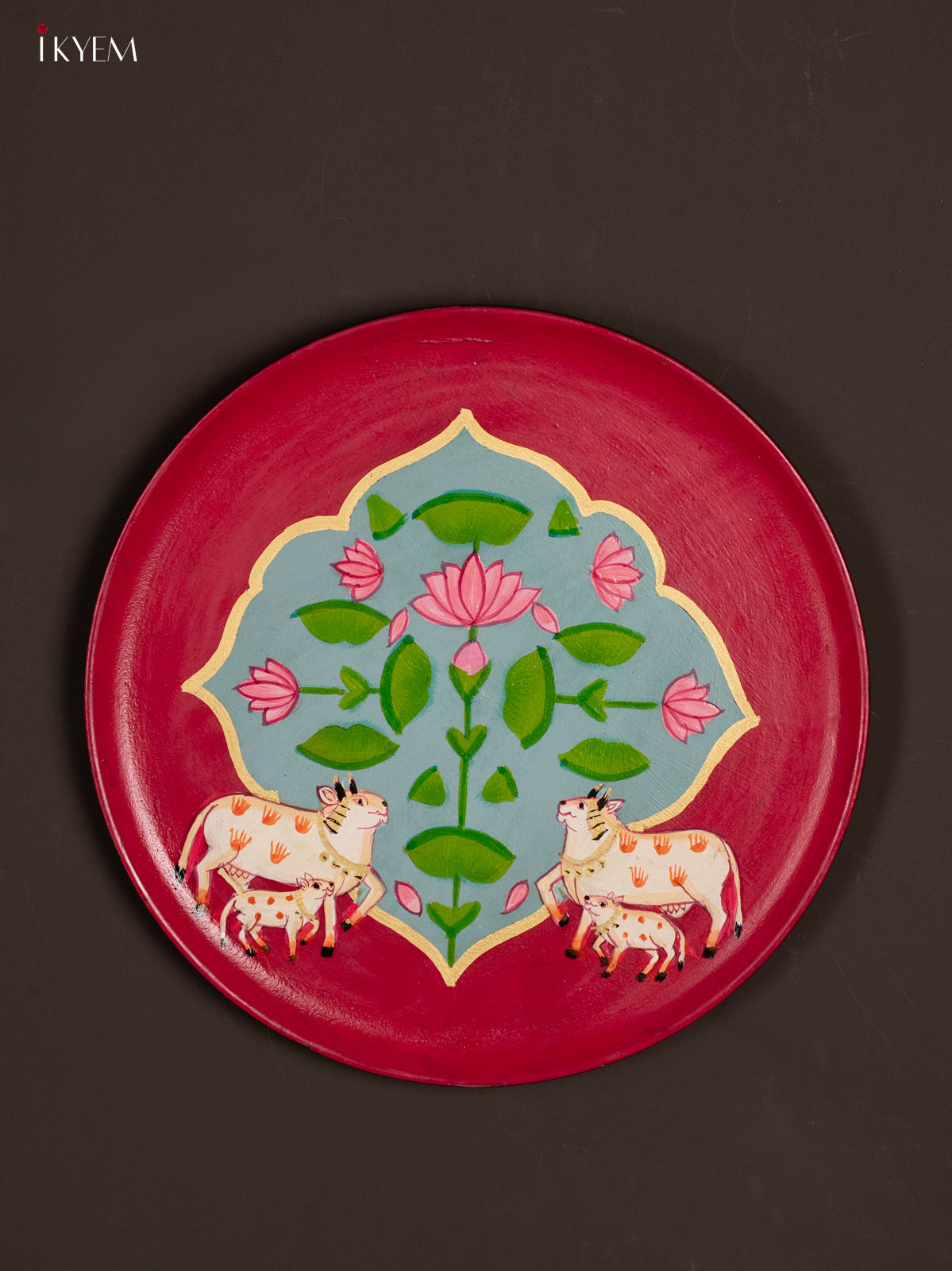 - This wooden hand-painted wall hanging plate features a traditional Pichwai design with a graceful cow & calf motif in vibrant pink hues.