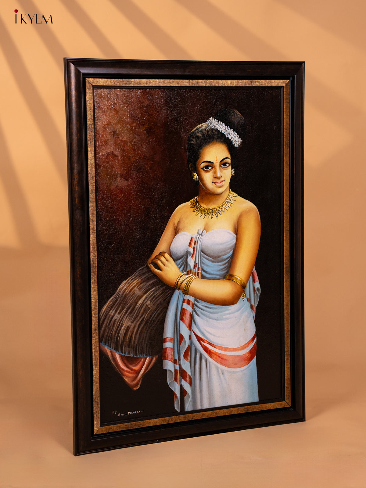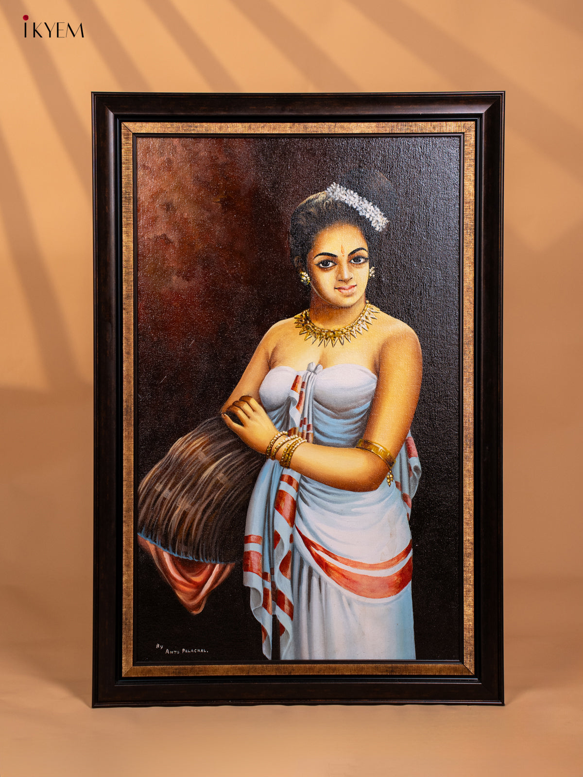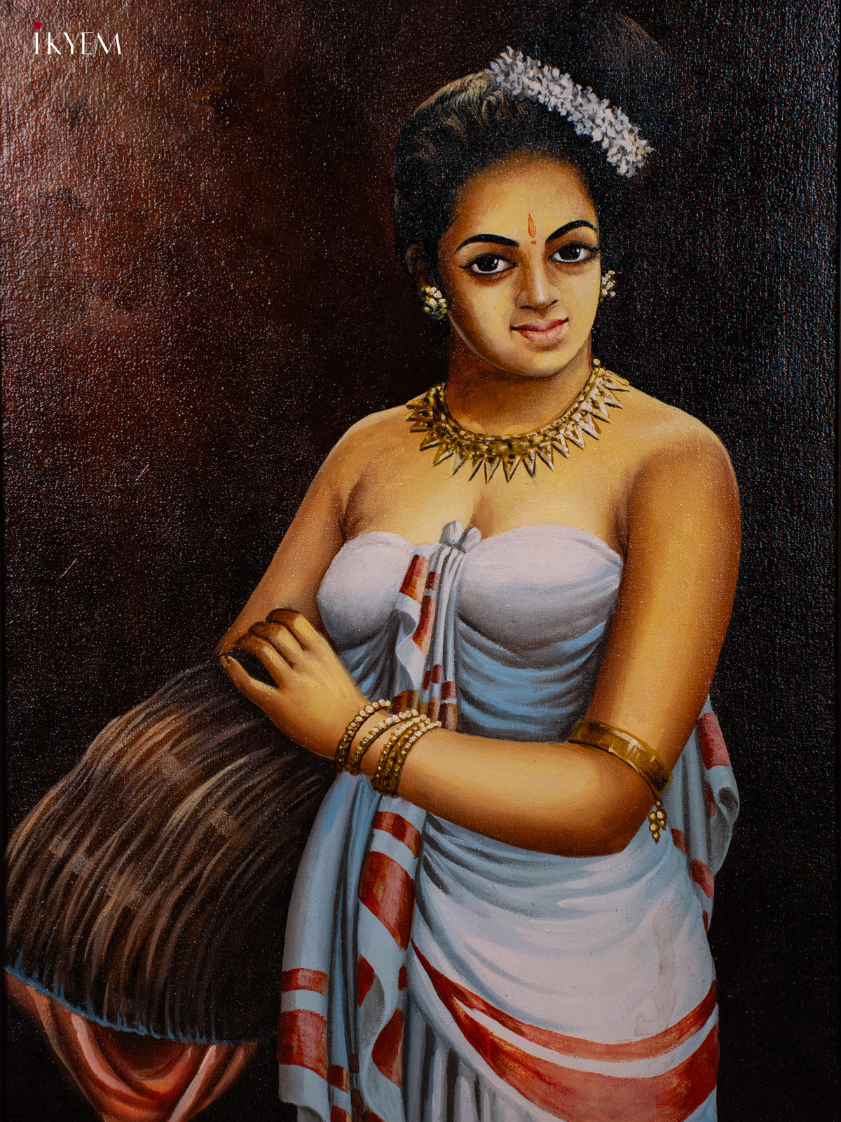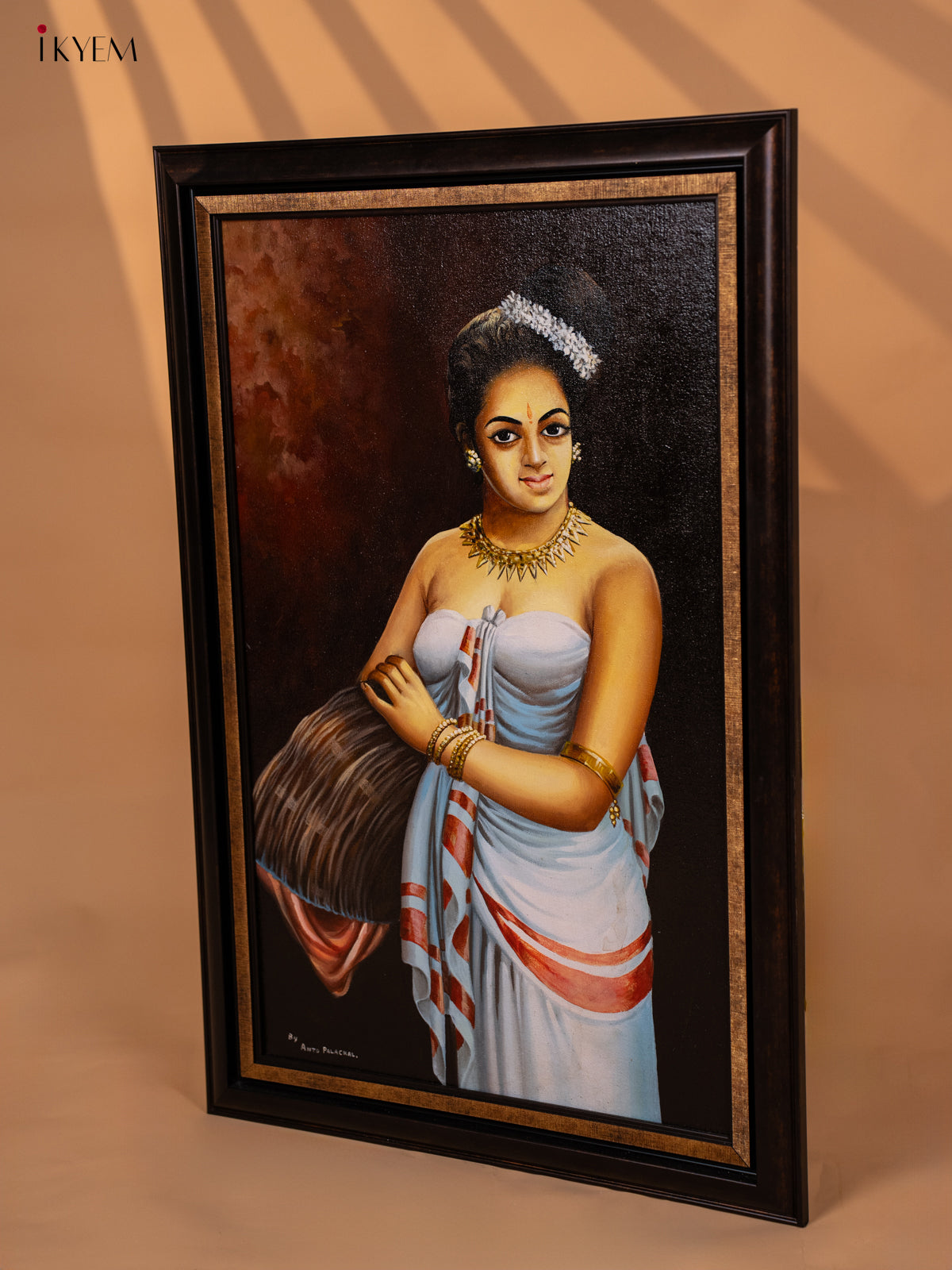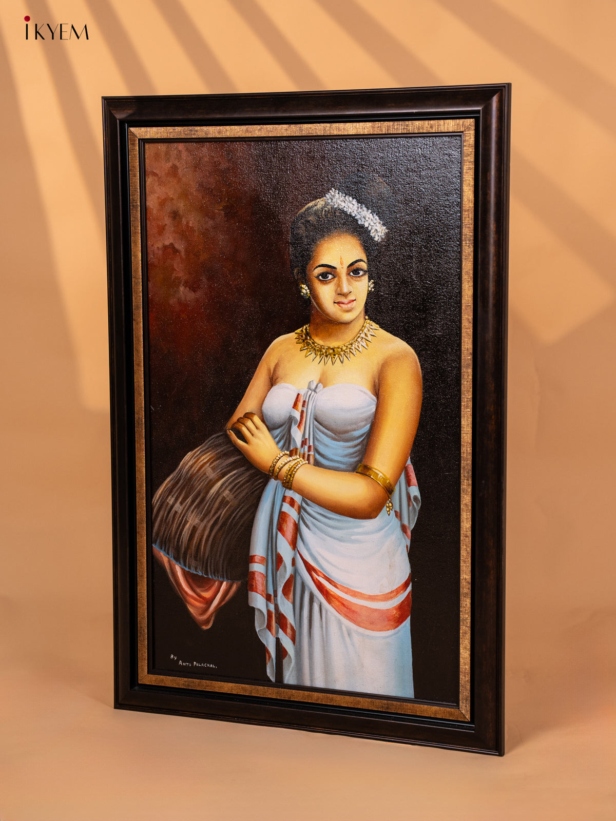 Presenting 'Lady with a Poo Koodai' – A Full Painted Artwork that captures the essence of traditional South Indian charm and grace. 🎨 This exquisite painting portrays a serene lady adorned in vibrant attire, holding a beautifully woven Poo Koodai (flower basket). Each stroke of the brush brings to life the intricate details of her attire, the delicate weave of the basket, and the freshness of the vivid, handpicked flowers within.