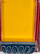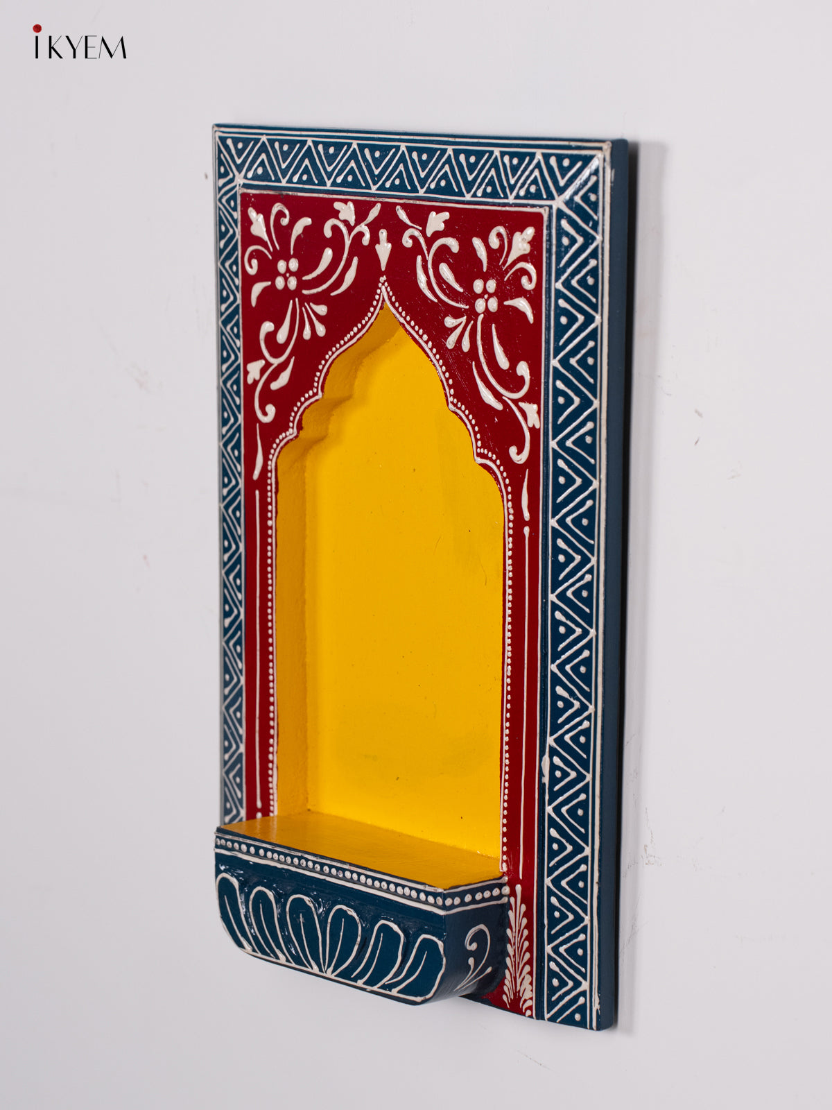 - This 12-inch wooden hand-painted wall frame and diya stand showcases a vibrant yellow and blue design, blending traditional artistry with functional decor.