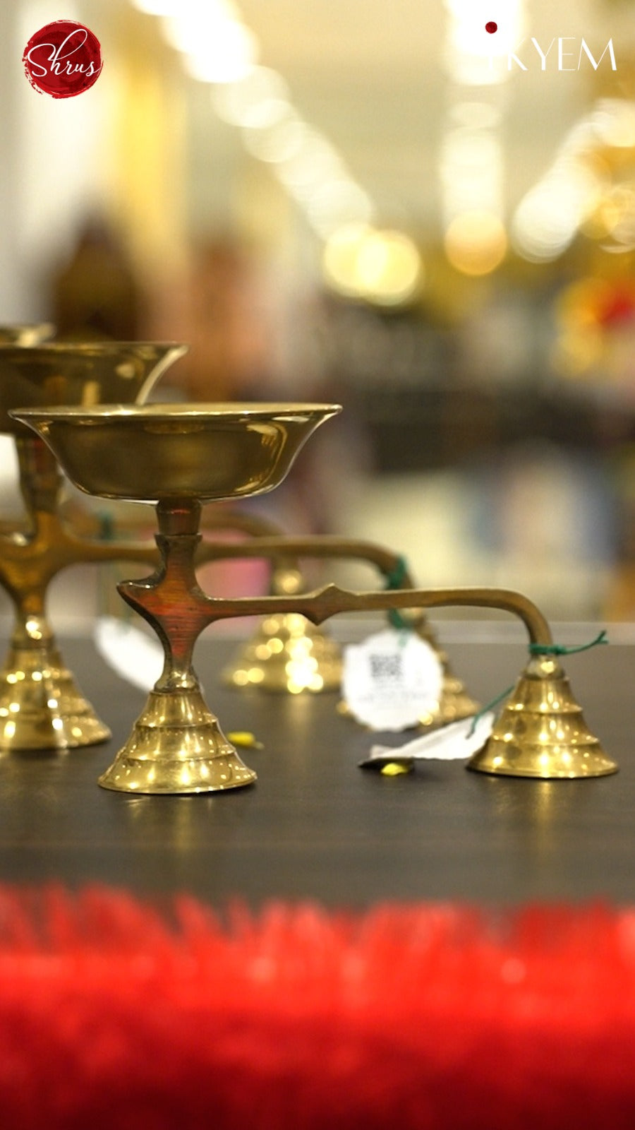 A traditional brass aarti with stand features a meticulously crafted, sturdy base supporting a circular tray, designed for holding lit diyas, incense, and offerings during worship rituals. The brass material lends a timeless, gleaming elegance, symbolizing purity and resilience.