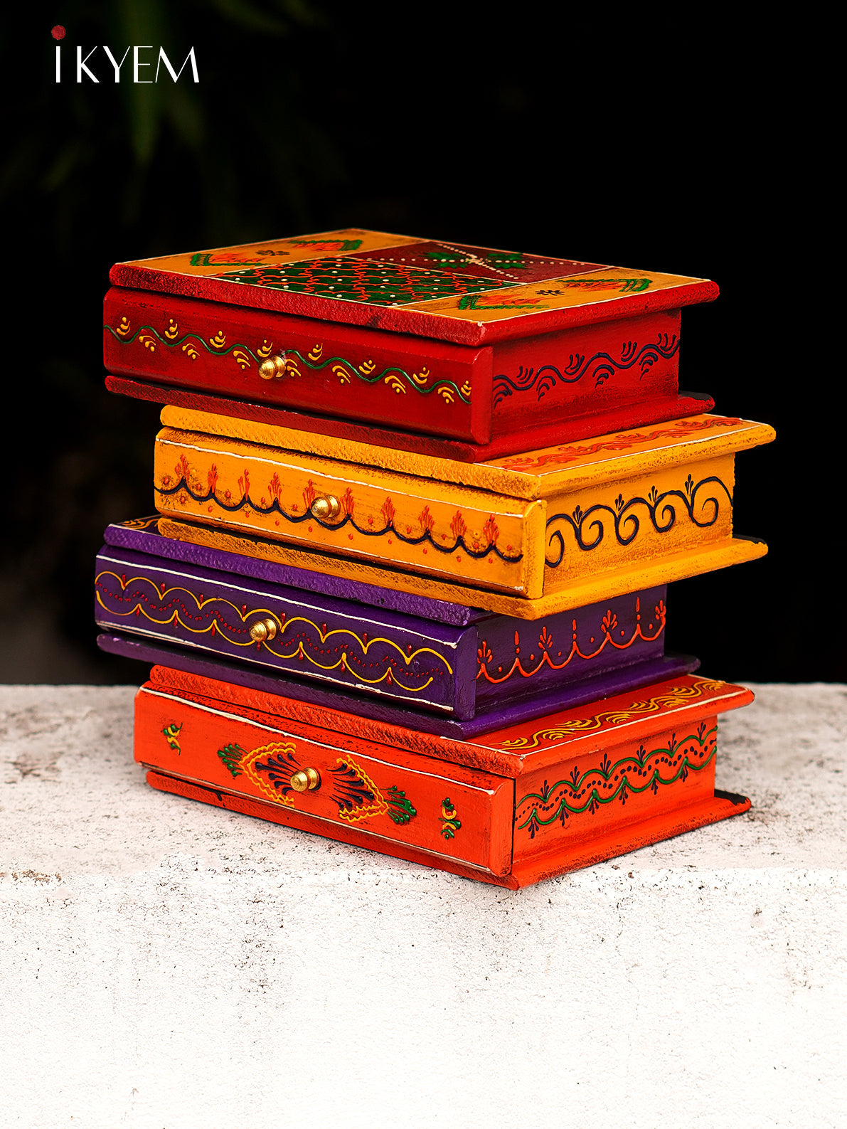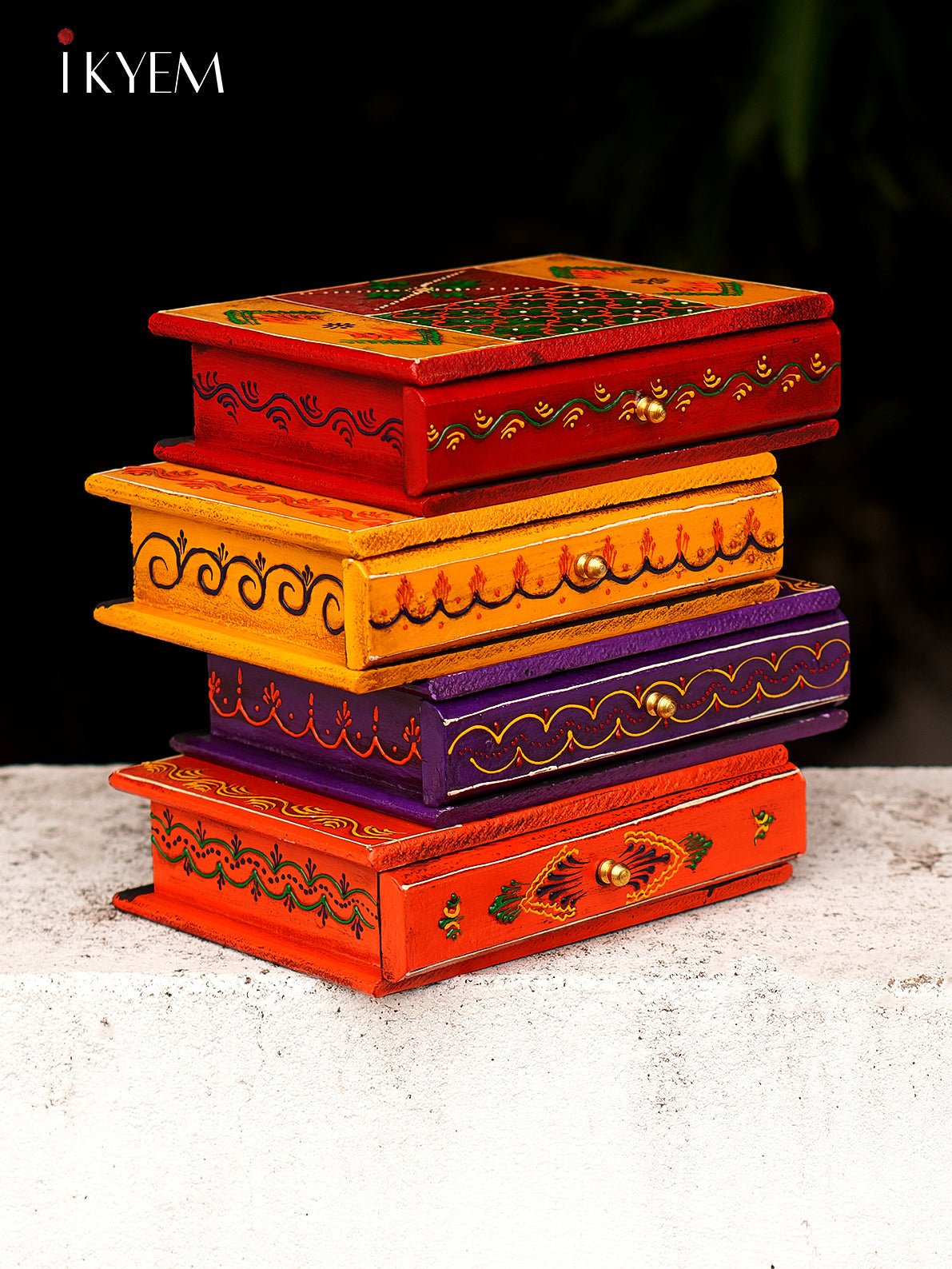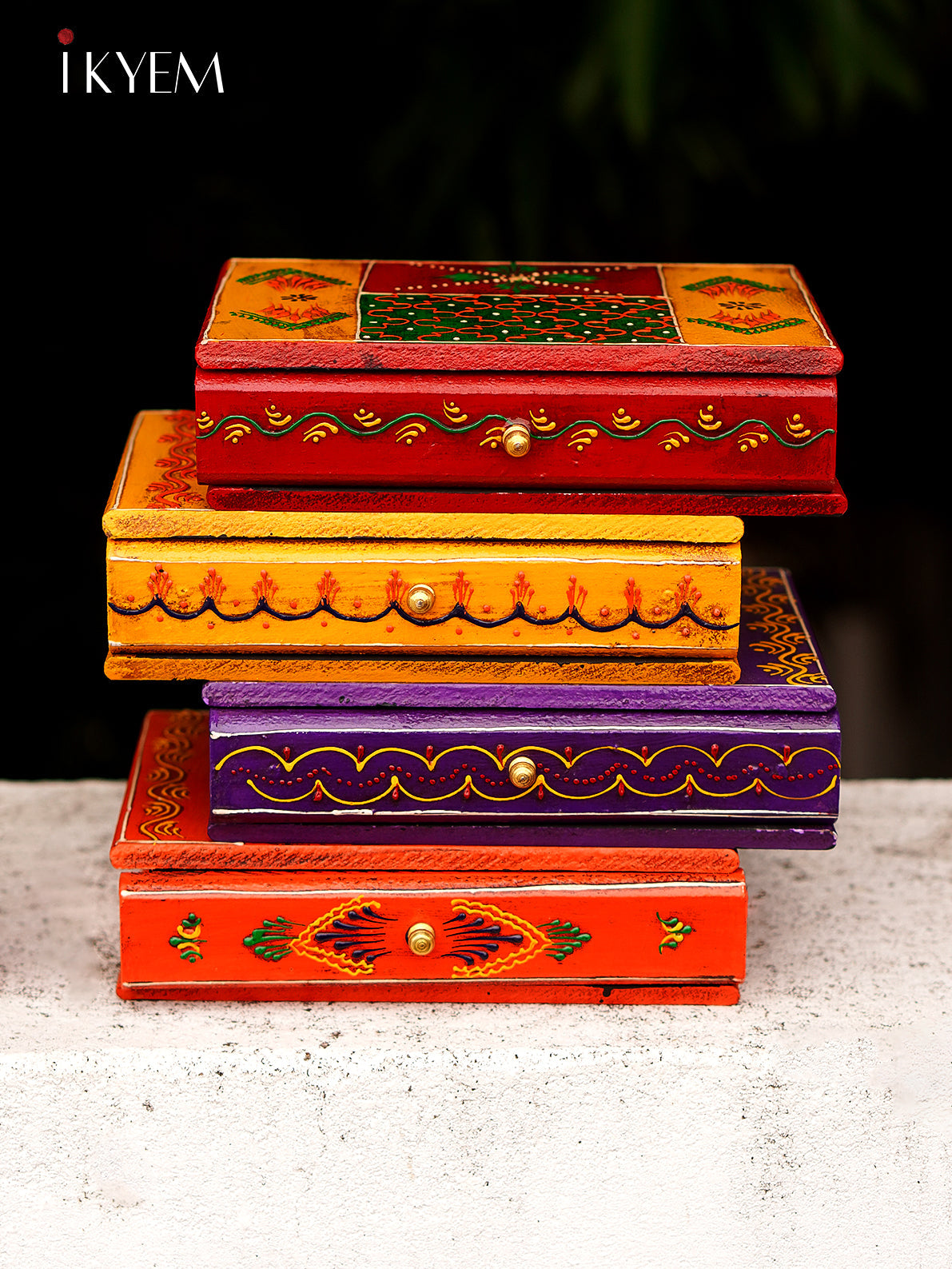 Handpainted Multipurpose Wooden Storage Box, a perfect blend of function and beauty for your home or as a thoughtful return gift. Adorned with intricate designs, each box is a unique masterpiece that adds a splash of color and creativity to any space. Ideal for organizing treasures or embellishing decor, it's a charming solution that marries art with utility