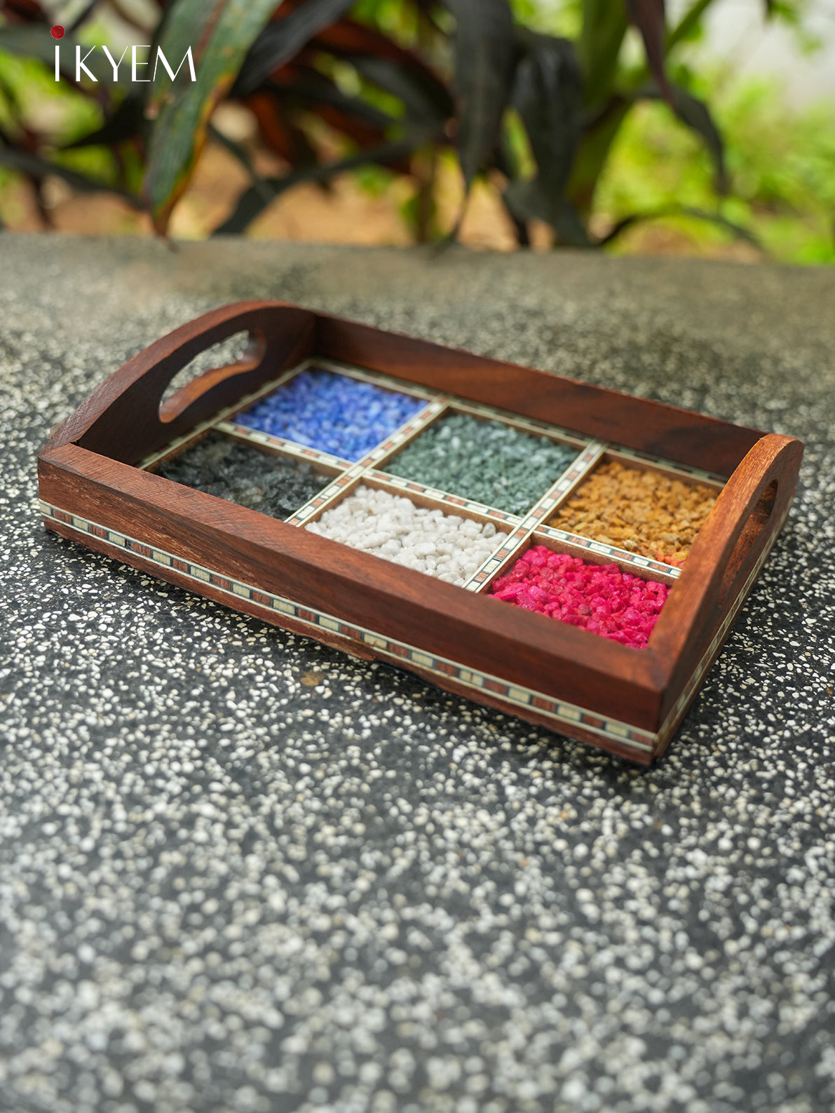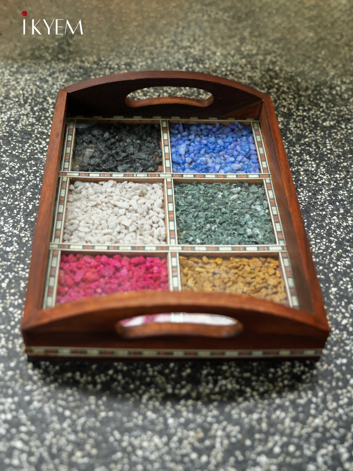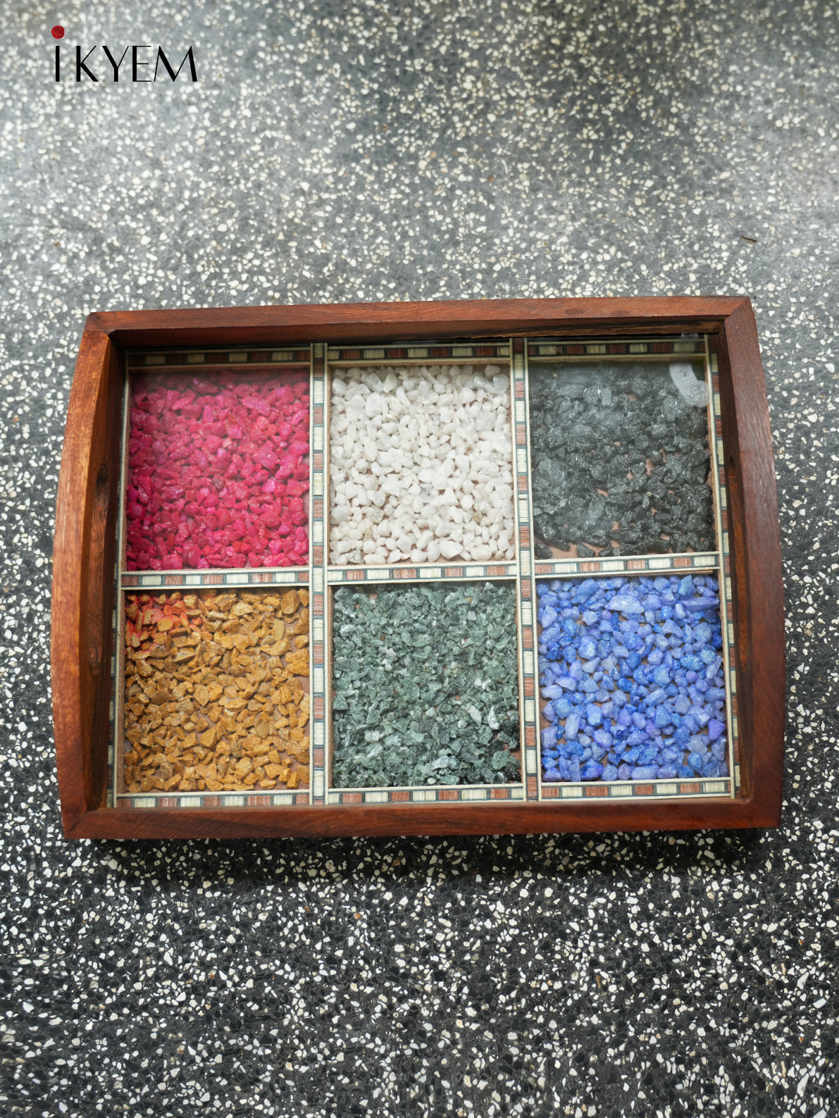 Elegant wooden tray, beautifully adorned with vibrant, hand-selected pebbles. This stunning piece adds a touch of nature and color to any space, perfect for home or office décor. Crafted with care, it's an exquisite blend of rustic charm and artistic flair