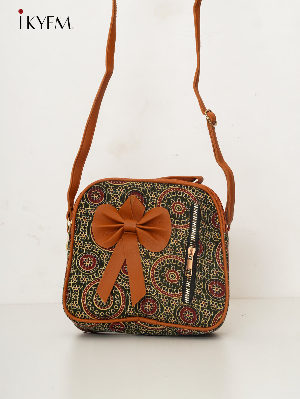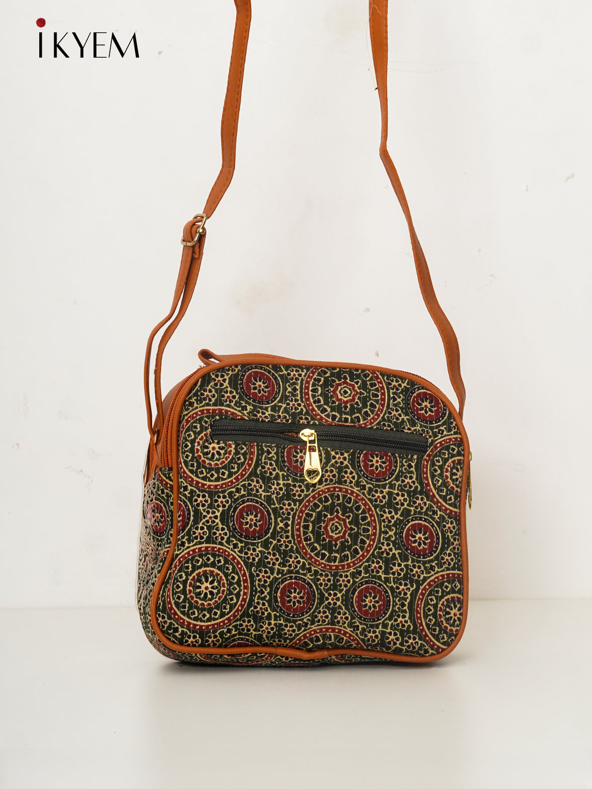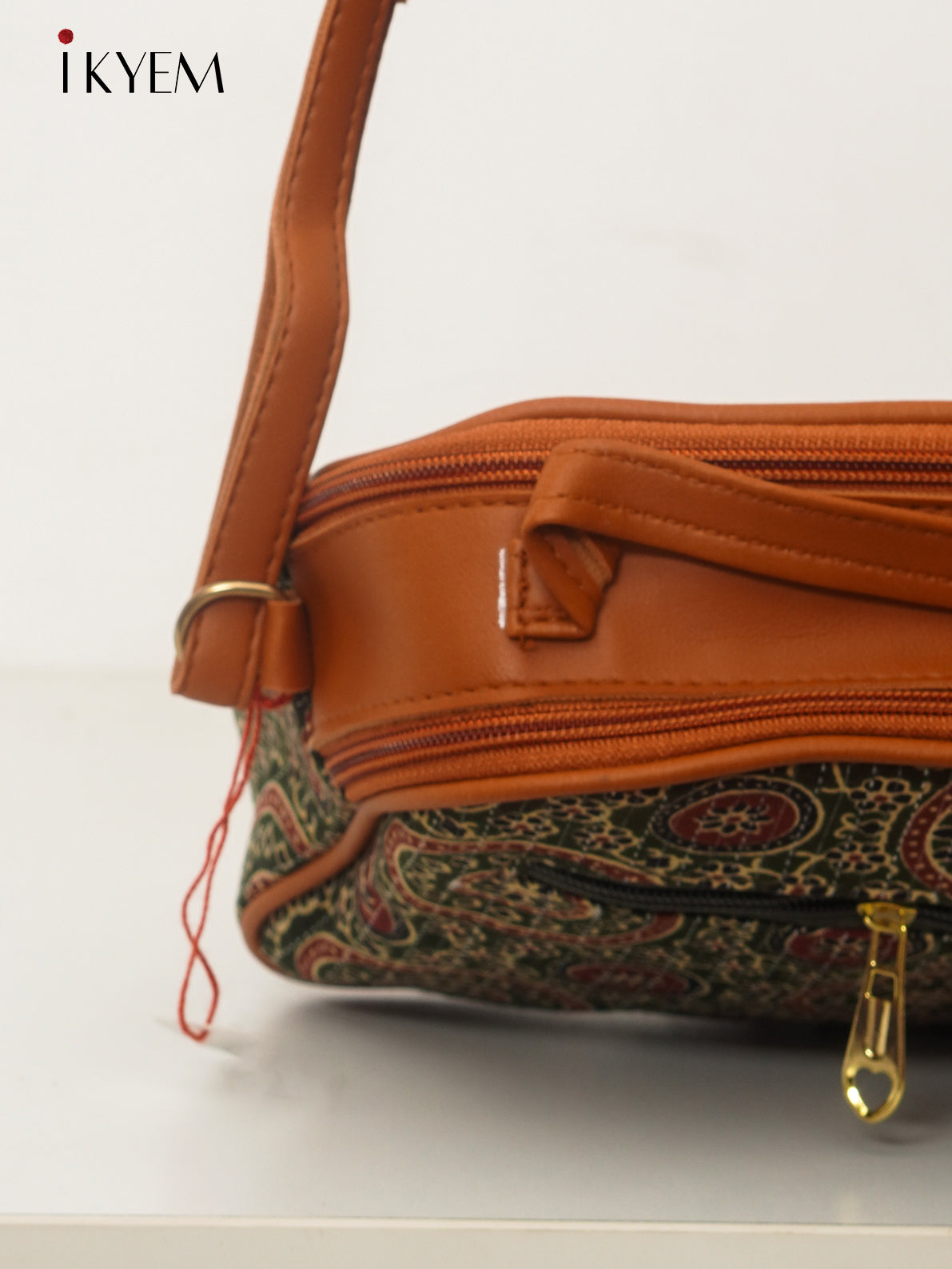 Pretty Green & Brown Ajrakh Handbags, designed for the modern woman on the go. These vibrant bags, adorned with eye-catching floral patterns, effortlessly transition from a chic handbag to a convenient sling bag, adapting to your needs and occasions.