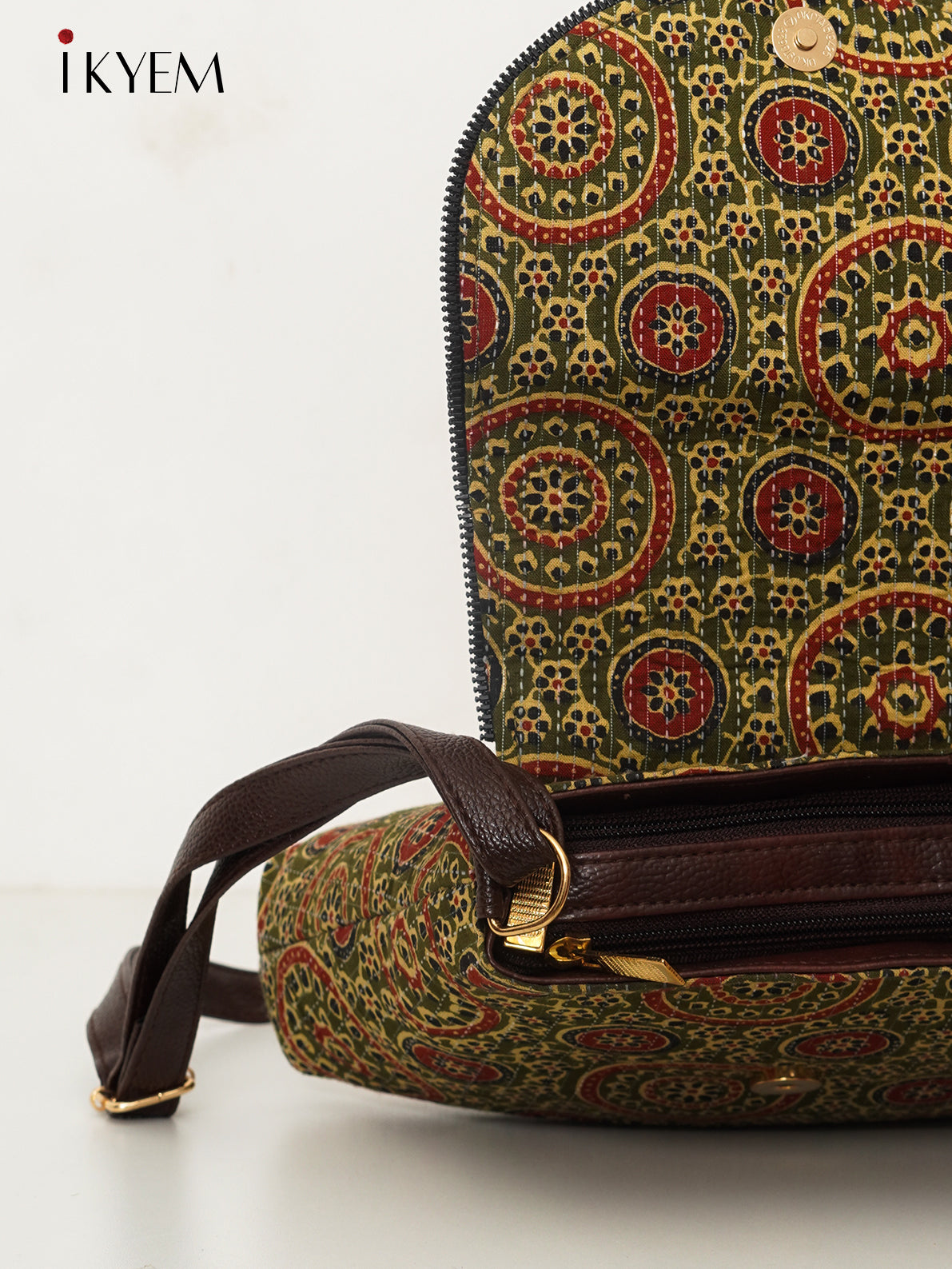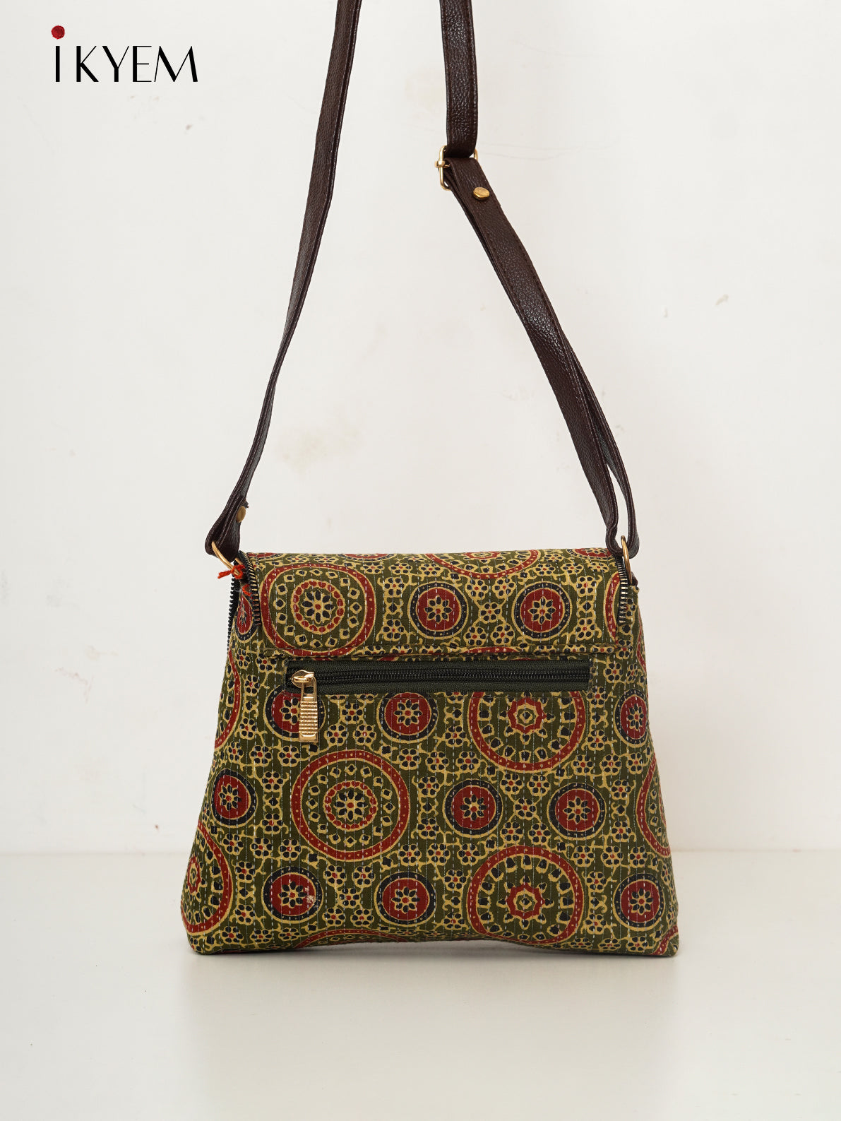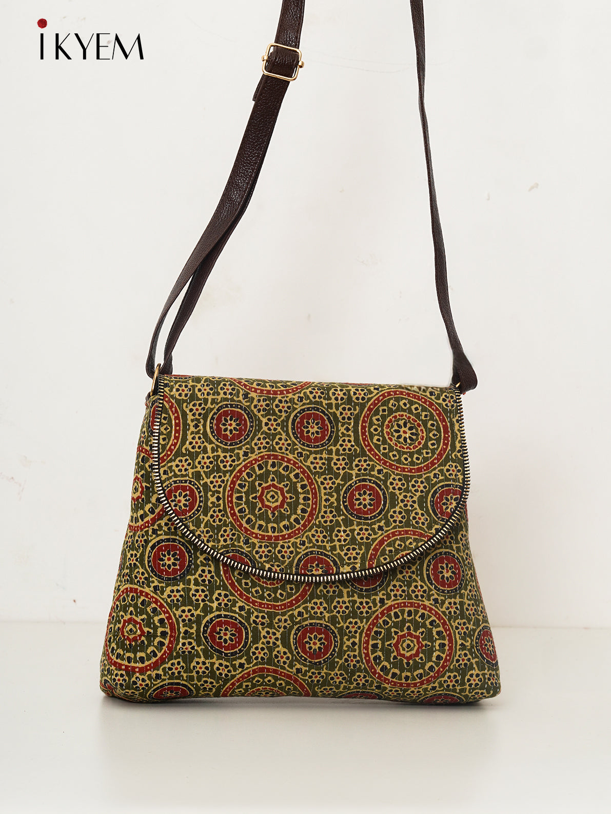 Pretty Green Ajrakh Handbags, designed for the modern woman on the go. These vibrant bags, adorned with eye-catching floral patterns, effortlessly transition from a chic handbag to a convenient sling bag, adapting to your needs and occasions.