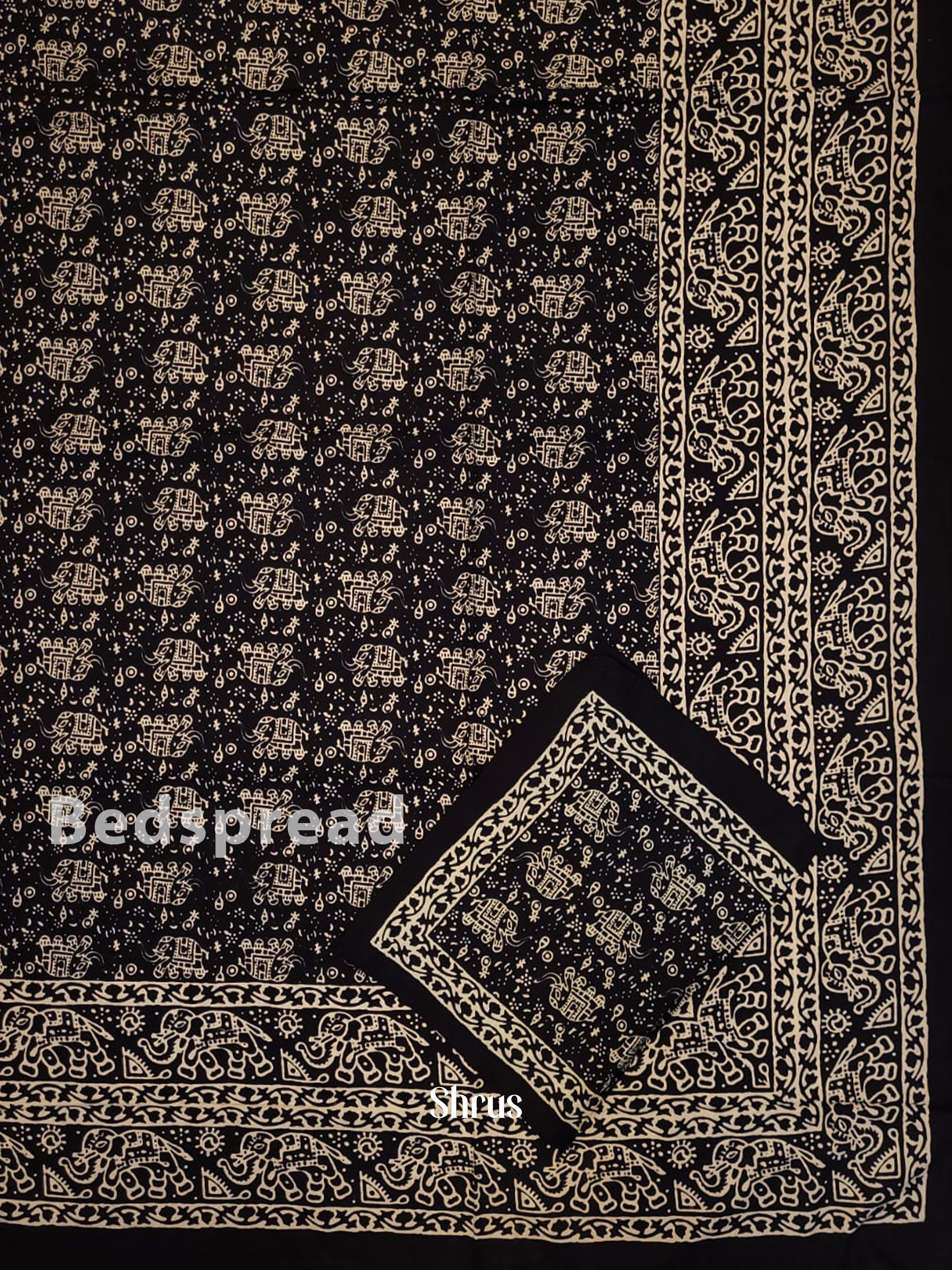 Experience unparalleled comfort and sophistication with our Black & Cream Jaipuri Printed Bedspread. This set includes two matching pillow covers and is made from premium cotton, ensuring both style and coziness. Featuring intricate floral patterns and vivid colors, it is the perfect addition for a tranquil and restful sleep.