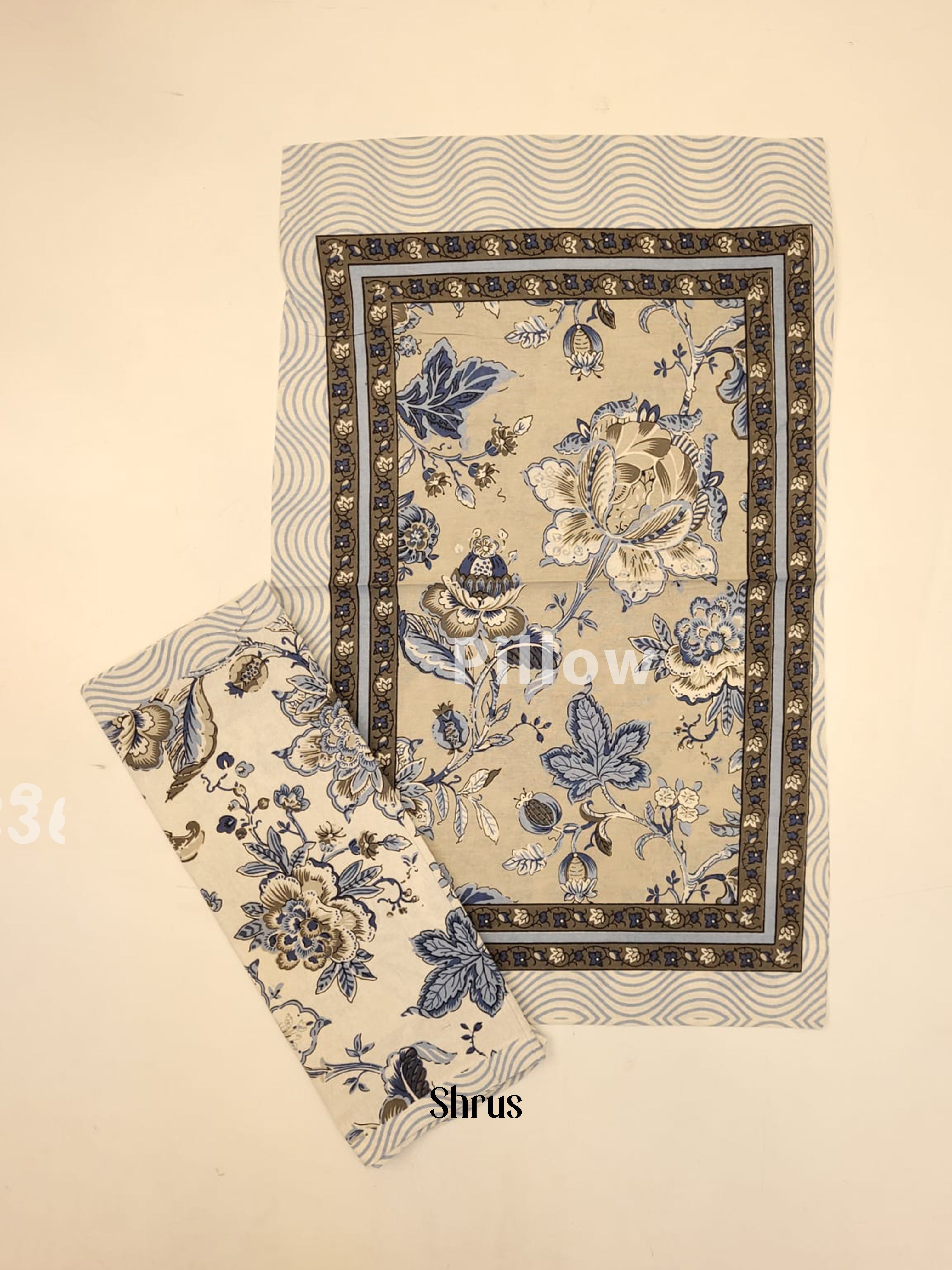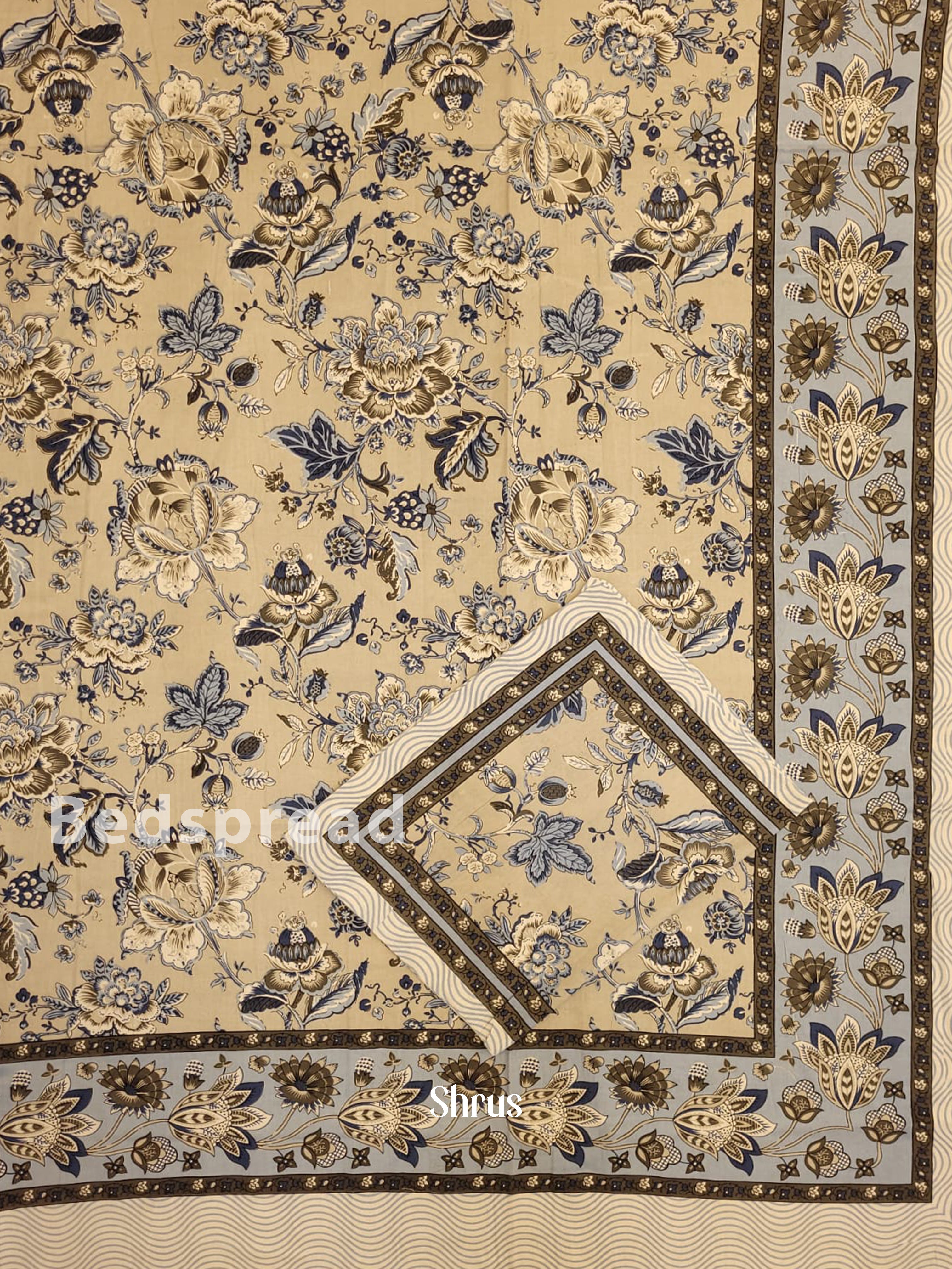 Transform your bedroom into a haven of luxury and sophistication with our Jaipuri Printed Bedspread in Cream & Blue. This set includes a bedspread and two pillow covers, all made from premium cotton material. Featuring exquisite floral patterns and lively shades, it offers both stunning design and unparalleled comfort, providing the ideal environment for a restful sleep.