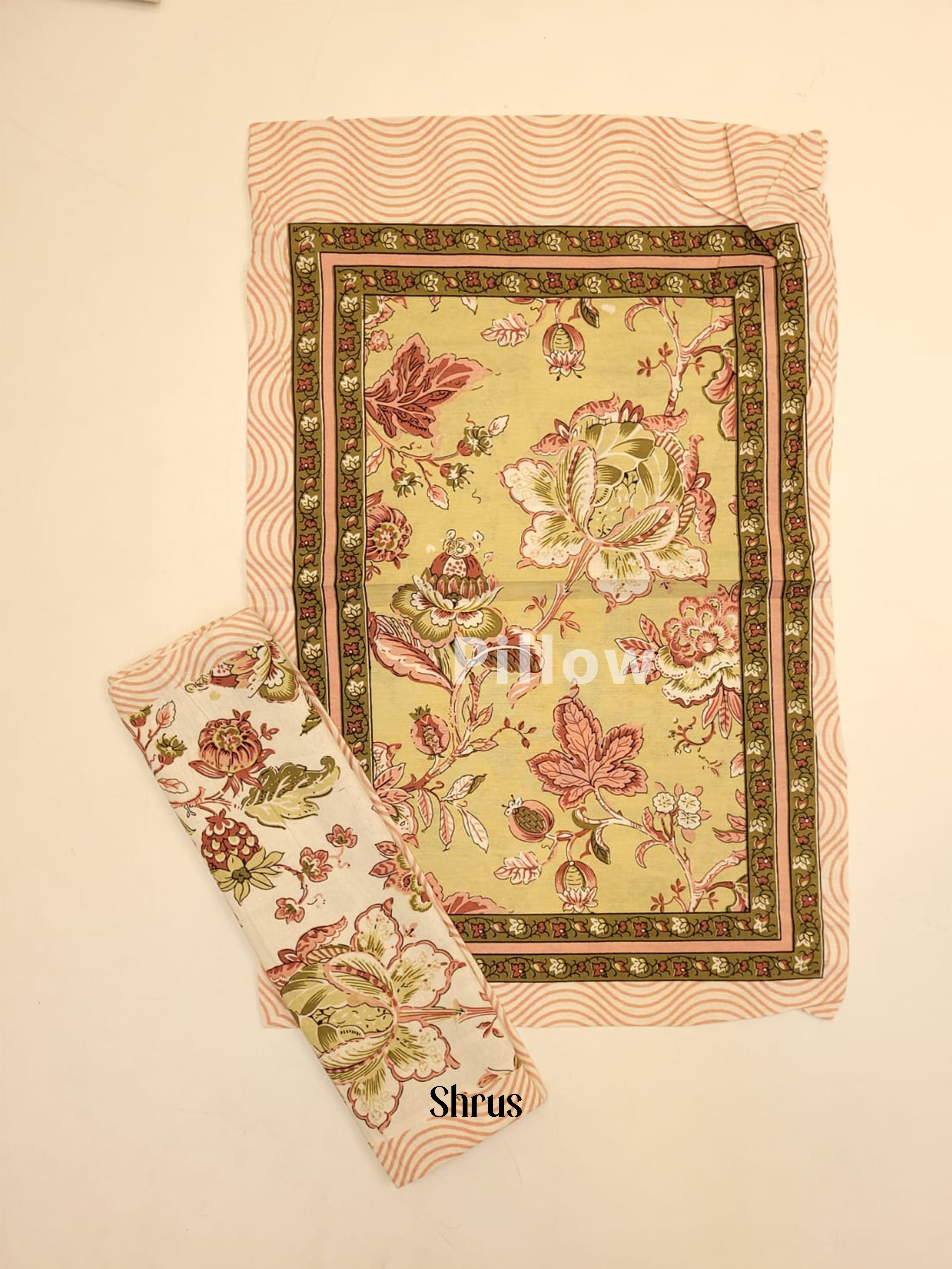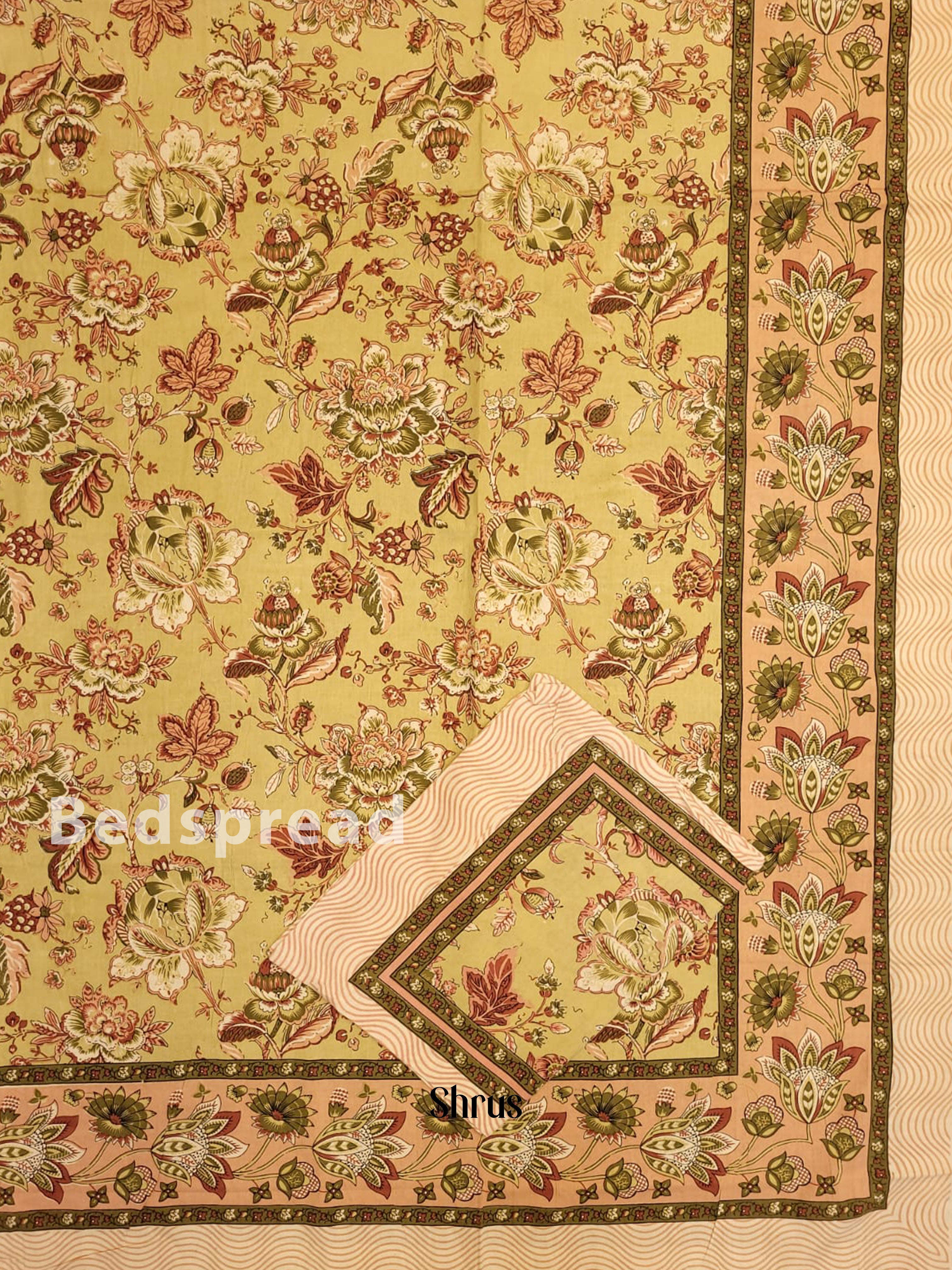 Experience the epitome of comfort and sophistication with our Green & Peach Printed Bedspread and matching pillow covers. Featuring intricate floral patterns and vibrant colors, this bedspread is expertly crafted from premium cotton, ensuring a perfect blend of style and comfort. Enhance your sleeping experience with the perfect setting for a tranquil night's sleep.
