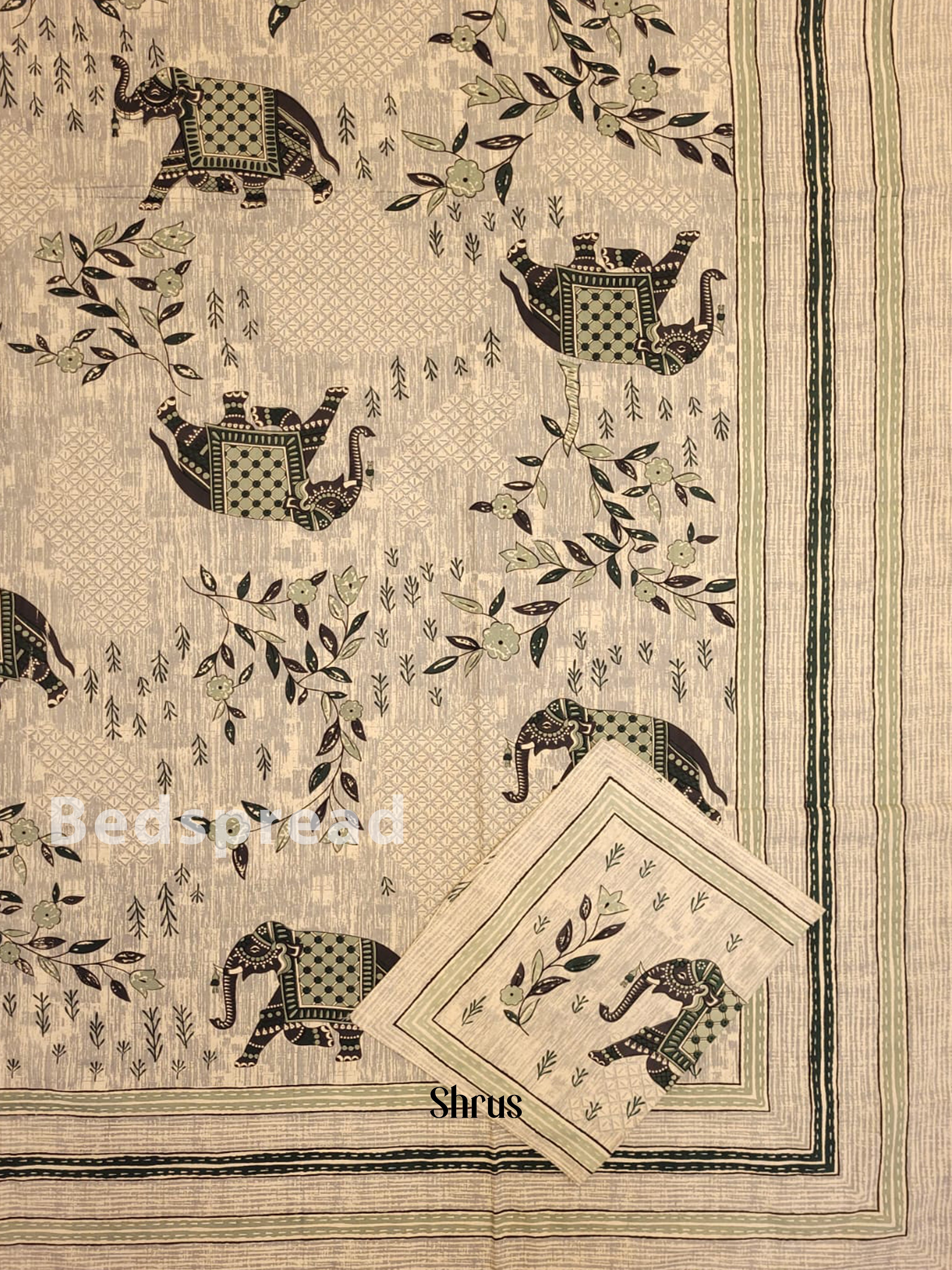 Experience the epitome of comfort and sophistication with our Grey & Green Printed Bedspread and matching pillow covers. Featuring intricate elephant print and vibrant colors, this bedspread is expertly crafted from premium cotton, ensuring a perfect blend of style and comfort. Enhance your sleeping experience with the perfect setting for a tranquil night's sleep.